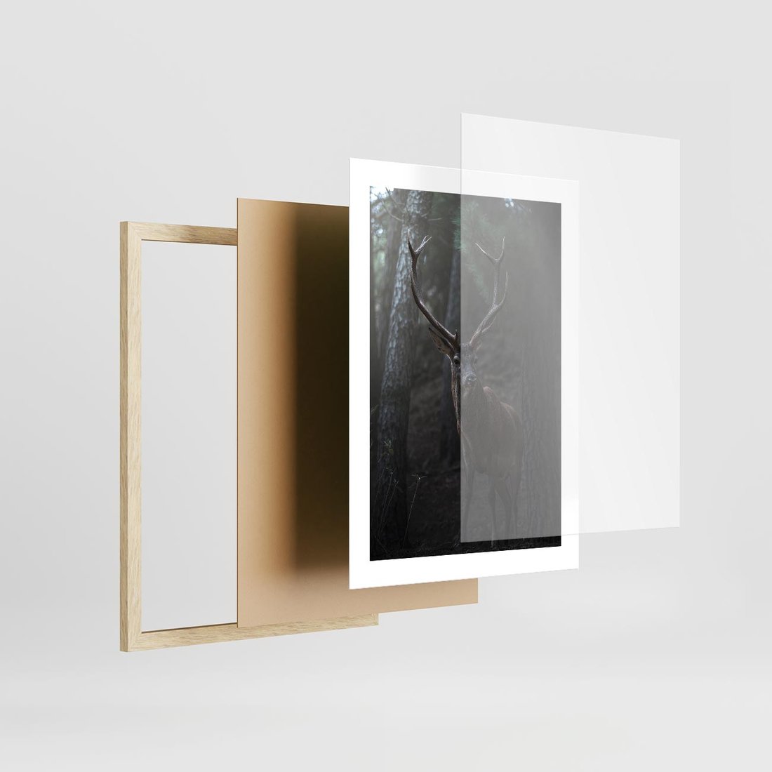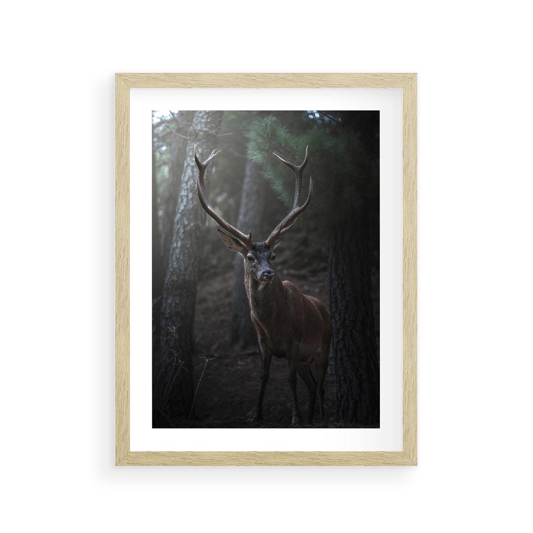 Plakat w ramie 30x40 - Jeleń wśród lasu - jeleń, las - rama drewno