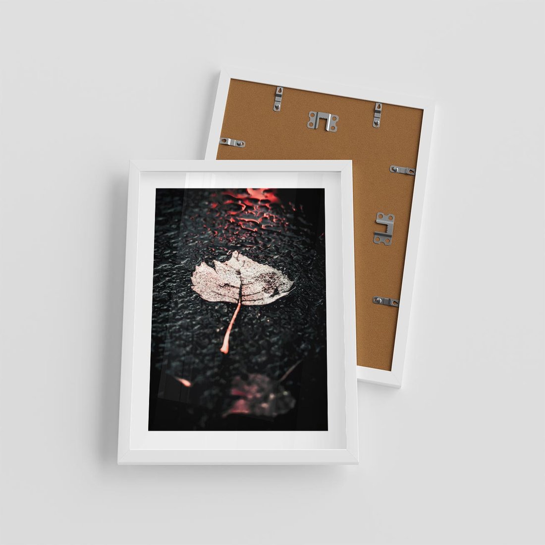 Plakat w ramie 30x40 - Jesień w Detalu: Liść na Mokrej Drodze - liść, jesień - rama biała