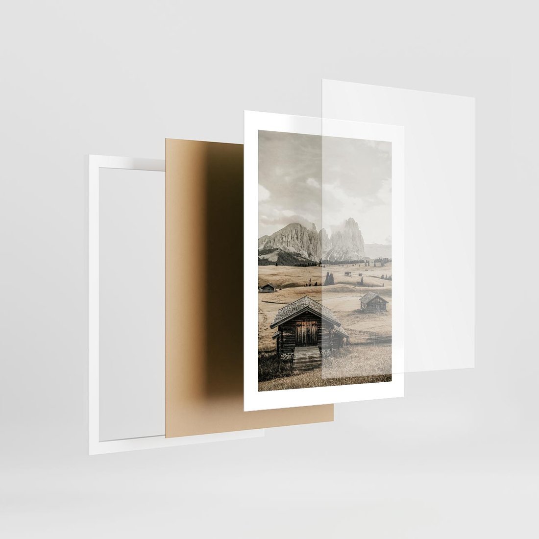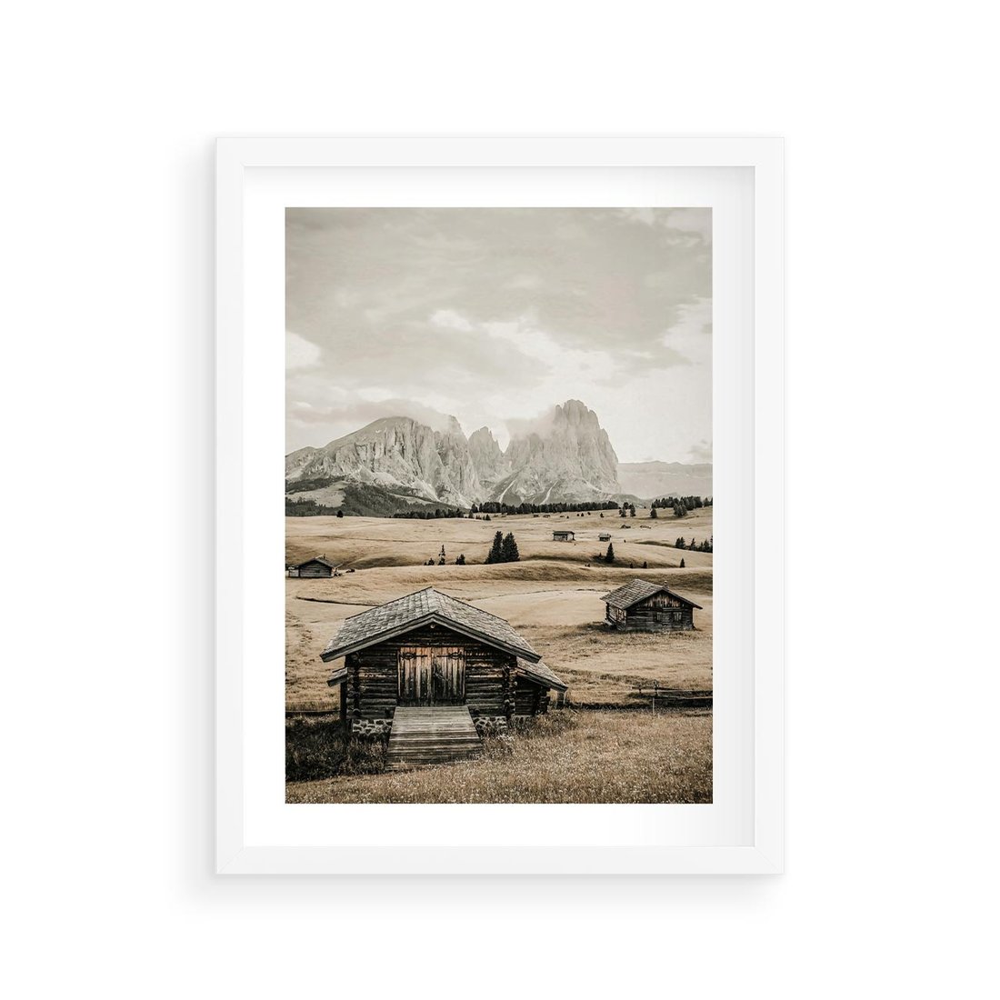 Obraz przedstawia urokliwe domki w górach utrzymane w odcieniach sepii, co nadaje im nostalgiczny i klasyczny charakter.