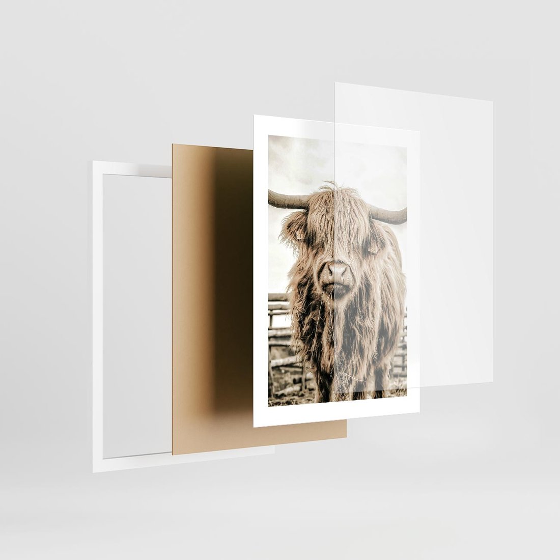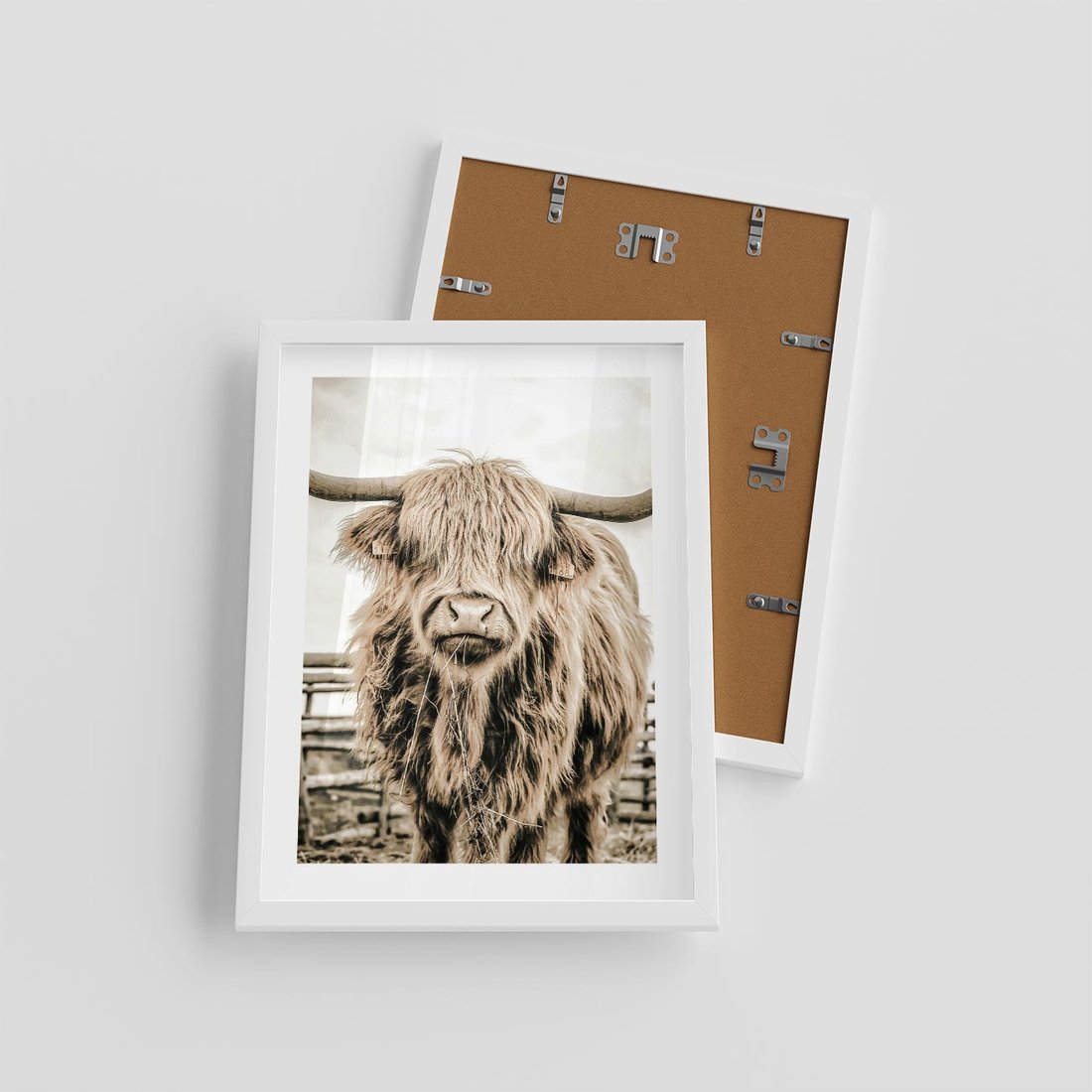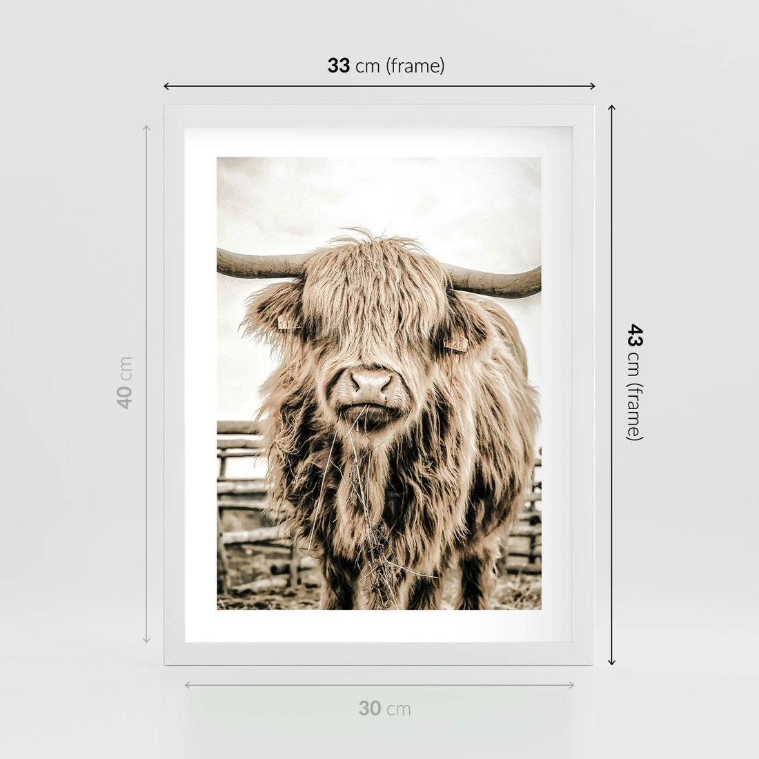 Plakat w ramie 30x40 - Klimat Wiejskiego Życia - amerykańska krowa, byk - rama biała