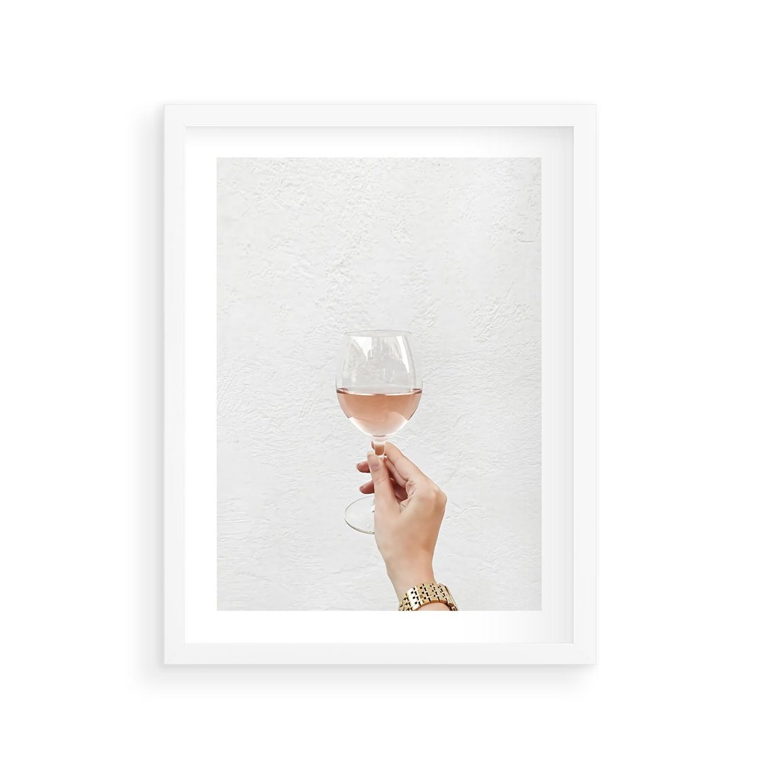 Plakat w ramie 30x40 - Kobieca Dłoń i Różowe Wino - kieliszek różowego wina, kobieca dłoń - rama biała