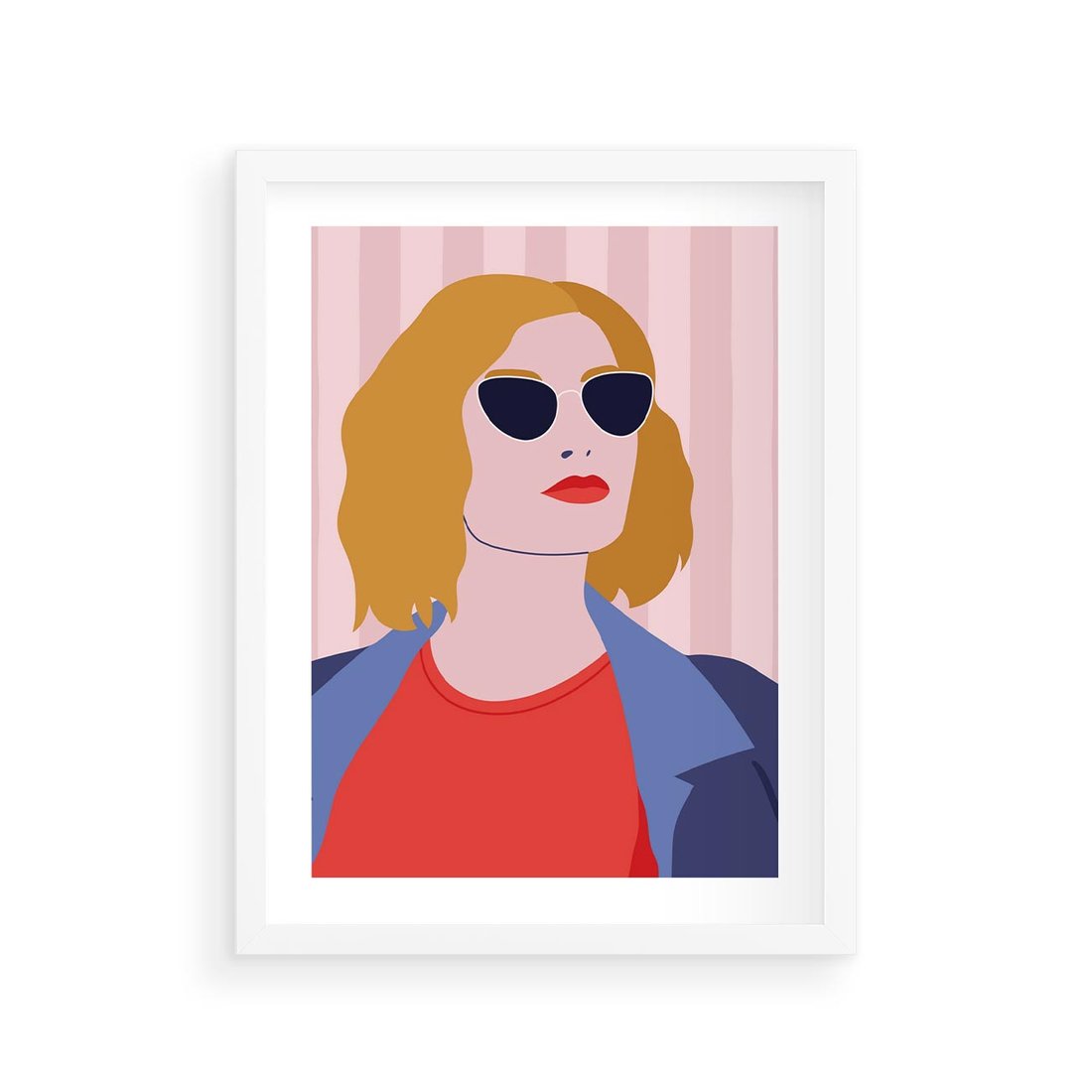 Nowoczesny plakat w stylu retro przedstawia kobieta w okularach słonecznych. Żywe kolory dodają energii i wyrazu, tworząc unikalną kompozycję z nutą nostalgii i współczesności.