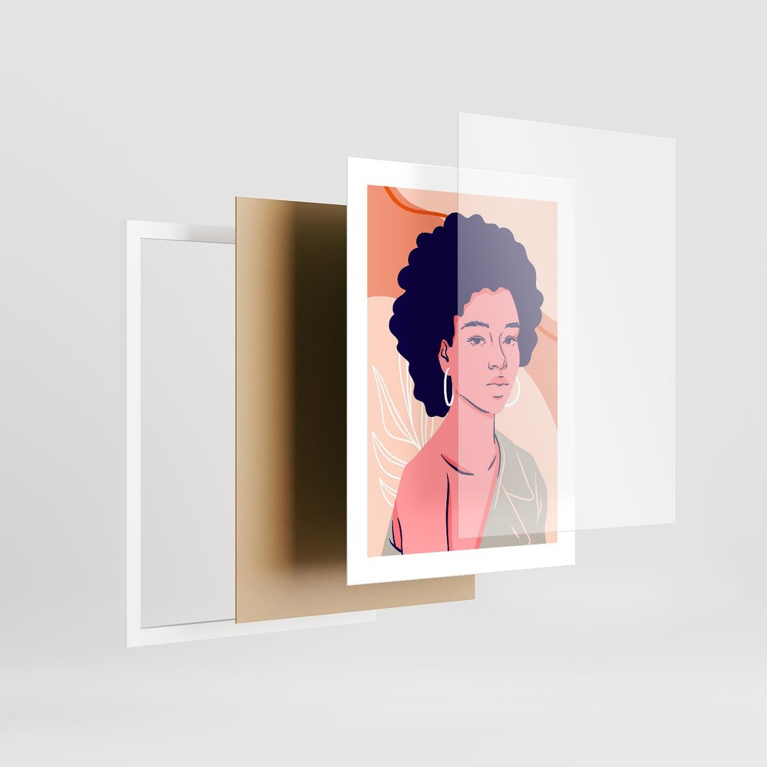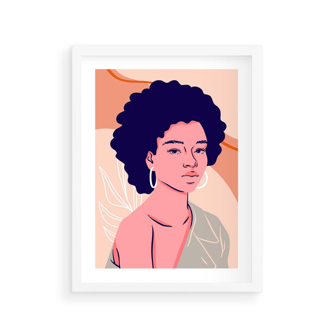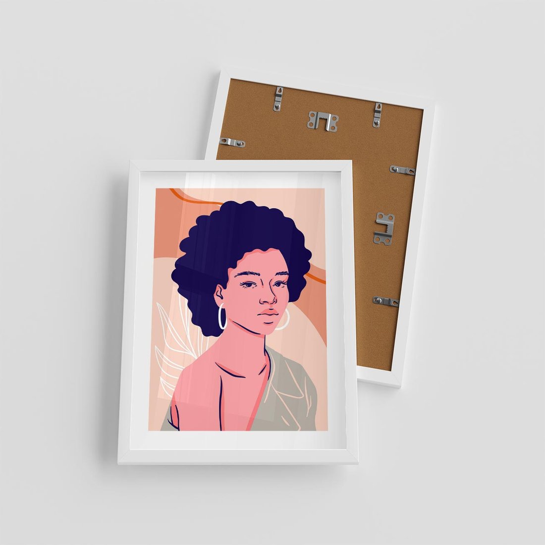W stylowym plakacie o nowoczesnym wydźwięku retro widnieje portret kobiety w stonowanych kolorach. To połączenie klasycznego charakteru z nowoczesnością, tworzące wyrafinowaną i harmonijną kompozycję.
