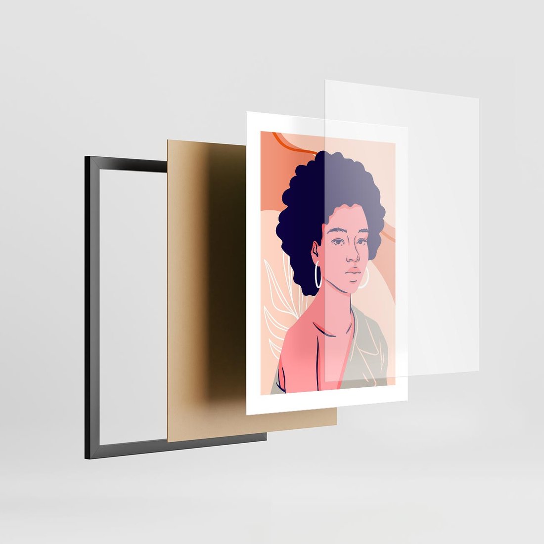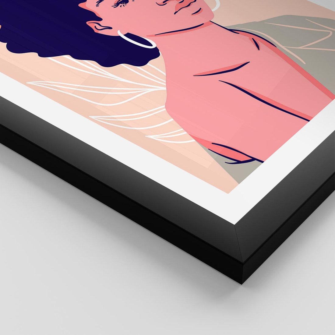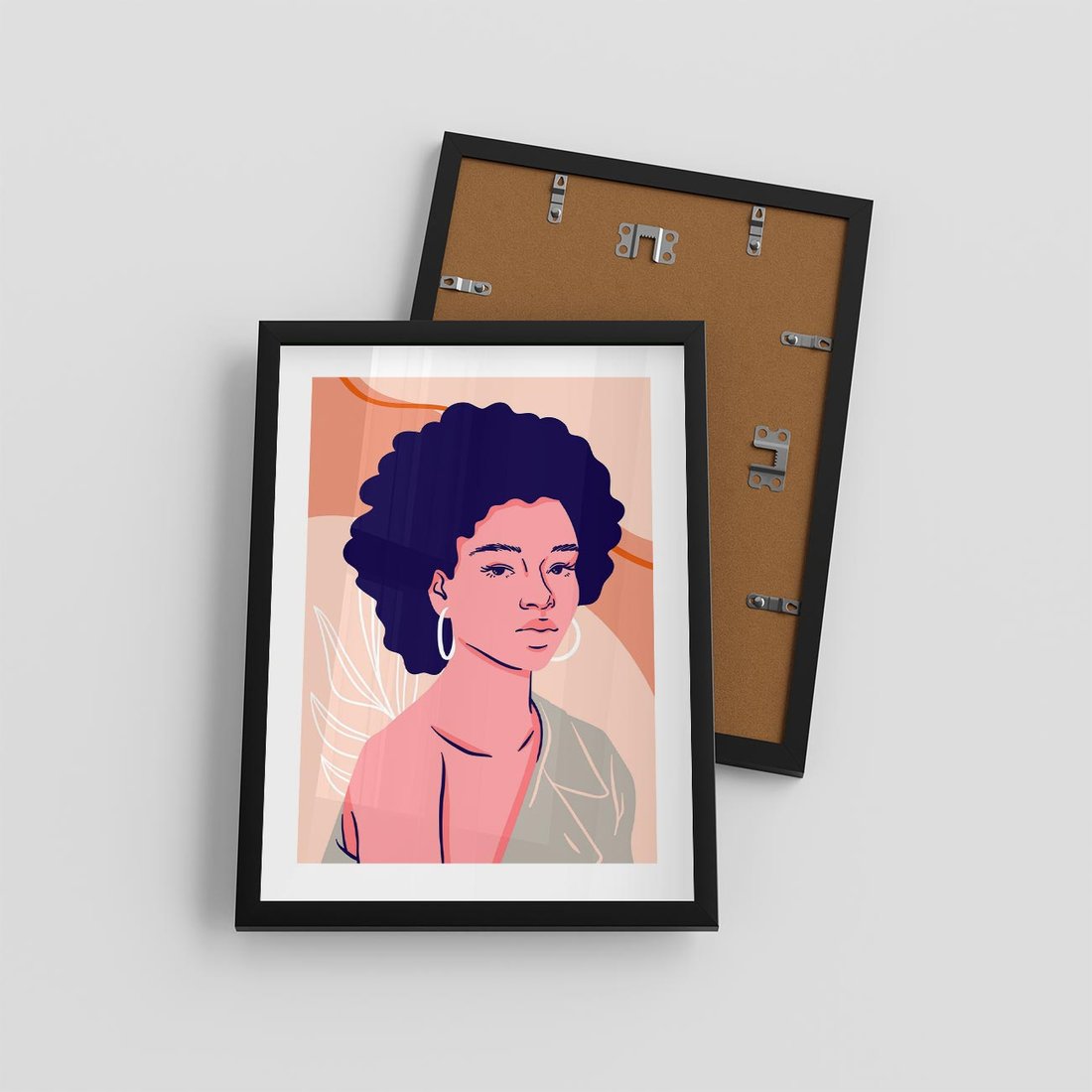 W stylowym plakacie o nowoczesnym wydźwięku retro widnieje portret kobiety w stonowanych kolorach. To połączenie klasycznego charakteru z nowoczesnością, tworzące wyrafinowaną i harmonijną kompozycję.