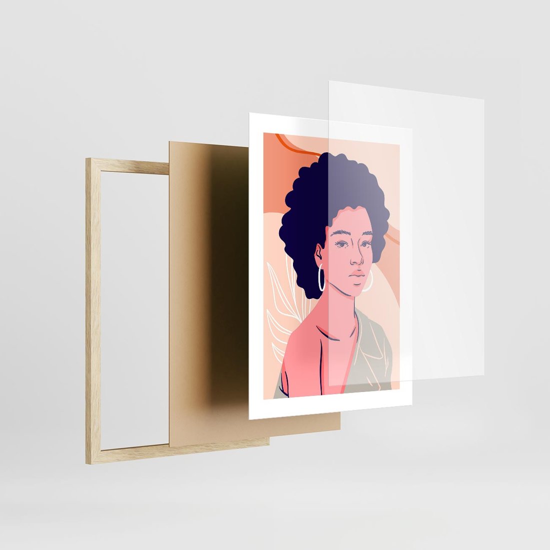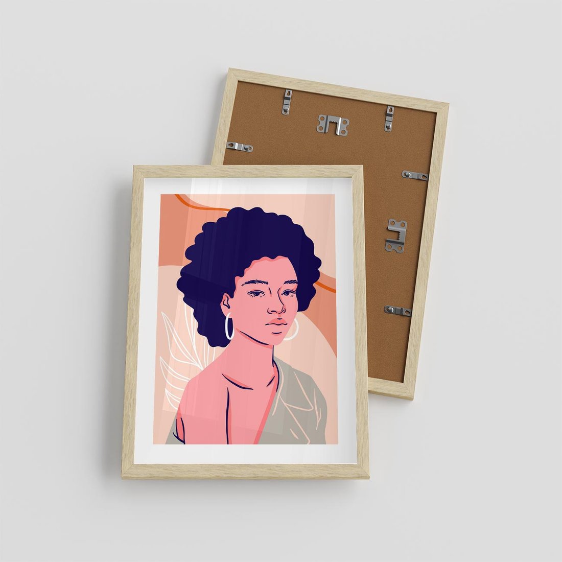 W stylowym plakacie o nowoczesnym wydźwięku retro widnieje portret kobiety w stonowanych kolorach. To połączenie klasycznego charakteru z nowoczesnością, tworzące wyrafinowaną i harmonijną kompozycję.