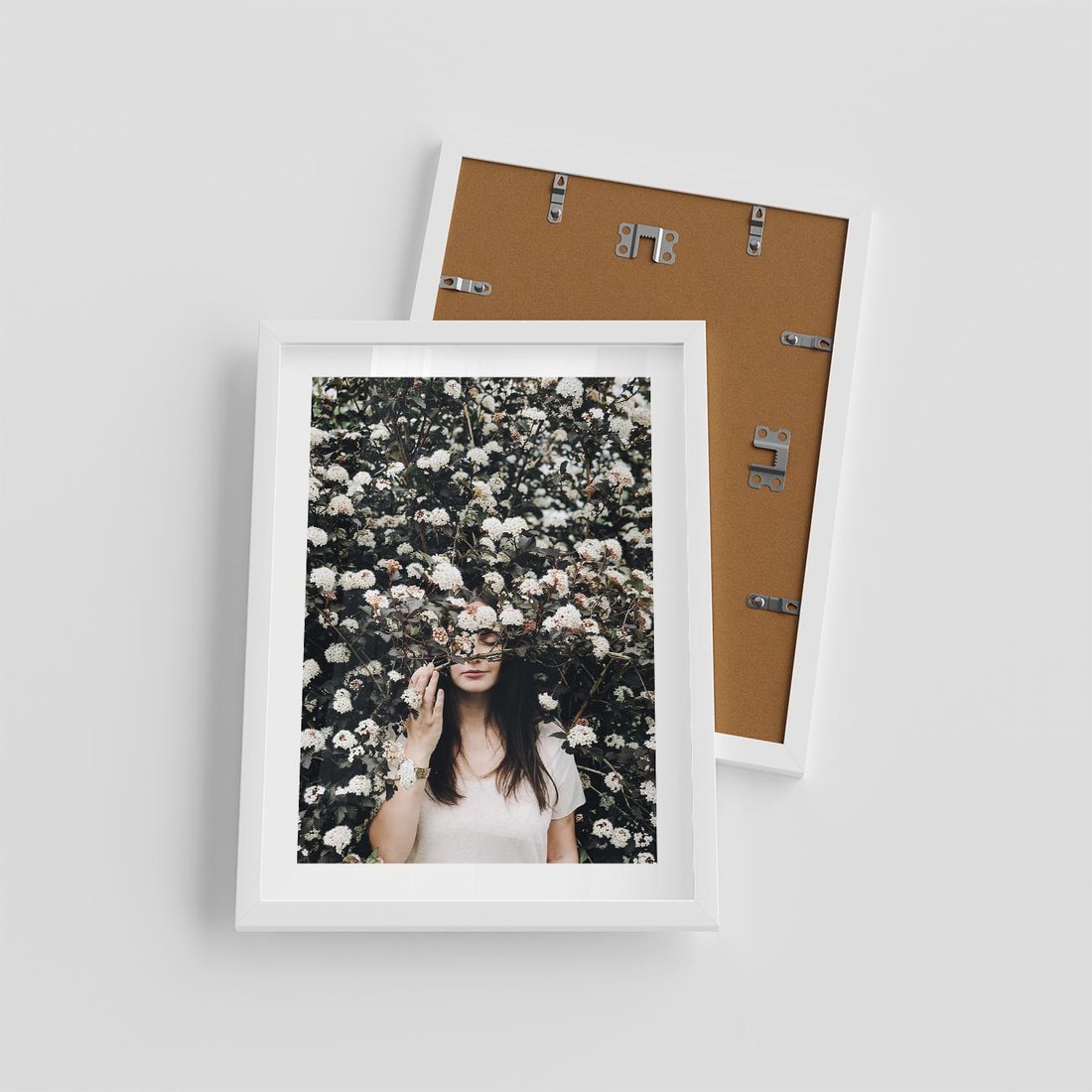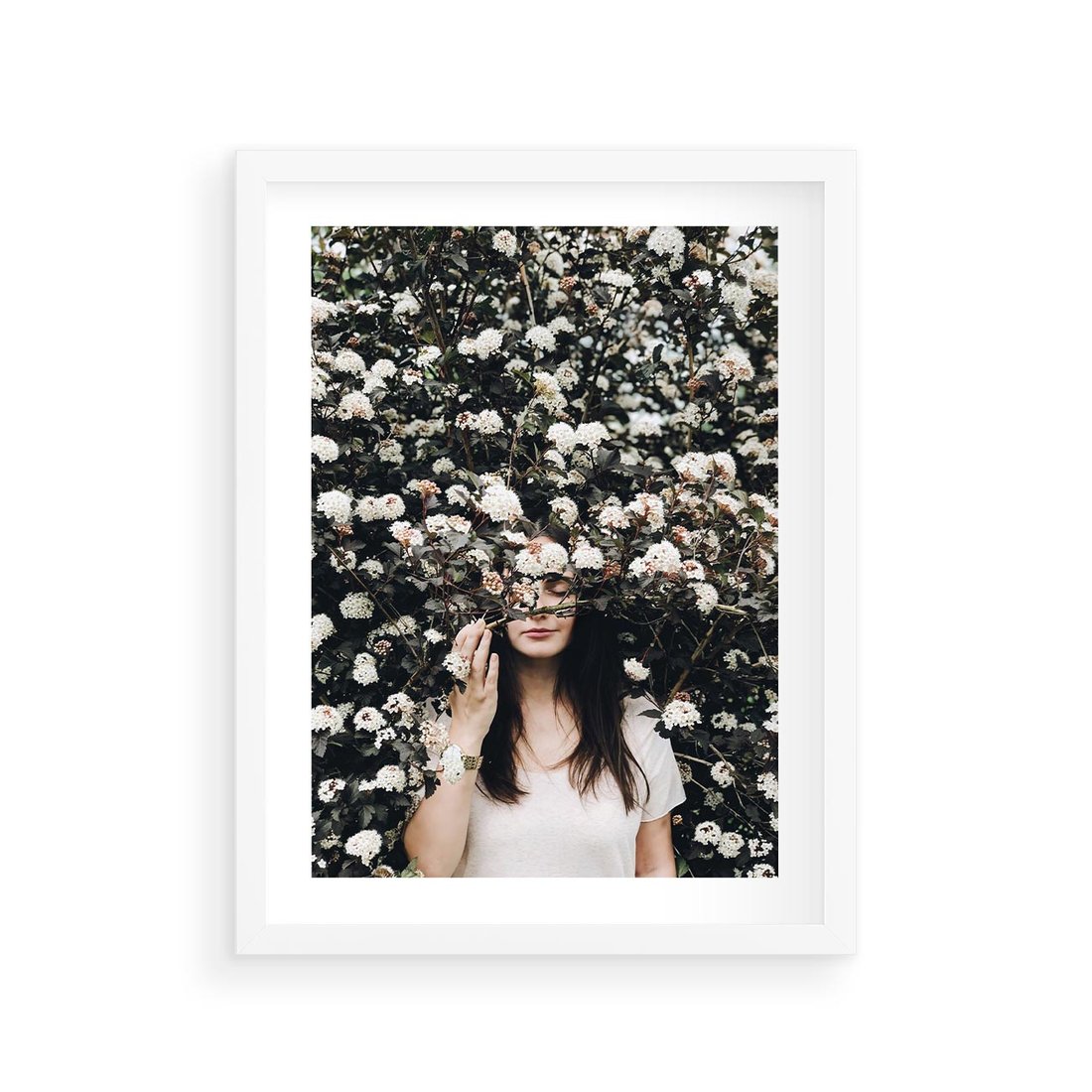 Plakat w ramie 30x40 - Kobieta w Krzewie Kwiatów - krzak z kwiatami, schowana za nim kobieta - rama biała