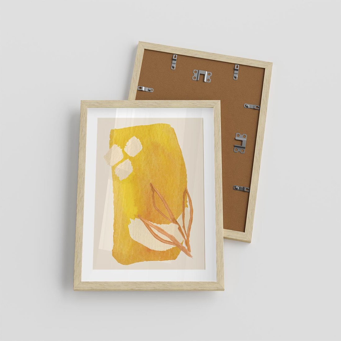 Nasz minimalistyczny plakat to abstrakcyjna żółta plama w akwarelowej technice, ozdobiona złotym liściem. To artystyczne połączenie przynosi energię i wyrafinowanie do Twojej przestrzeni, wprowadzając subtelny akcent natury i elegancji.
