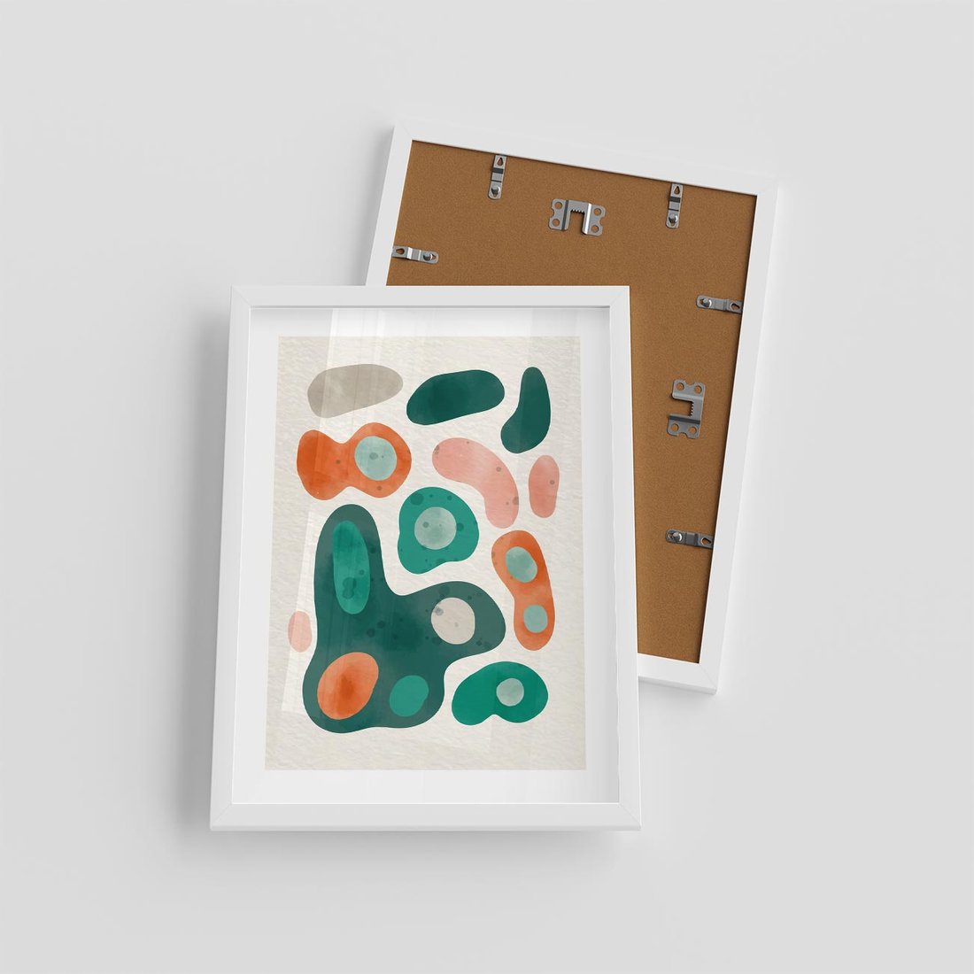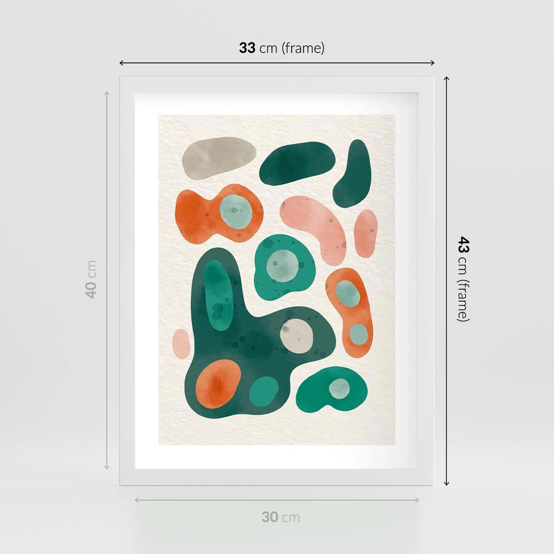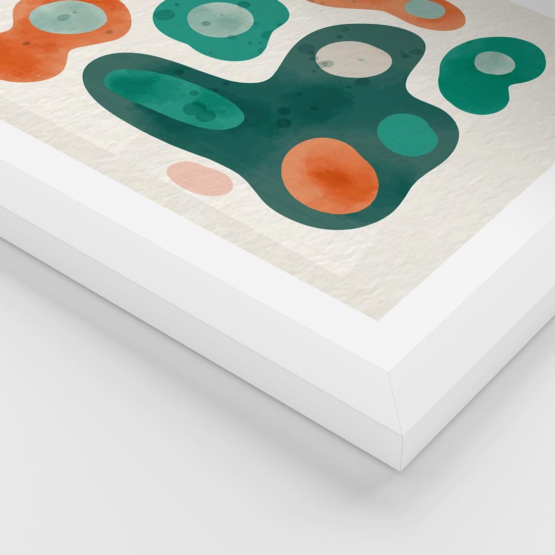 Plakat w ramie 30x40 - Kolorowe Przenikanie - przypadkowe abstrakcyjne plamy, pomarańczowy i zielony - rama biała