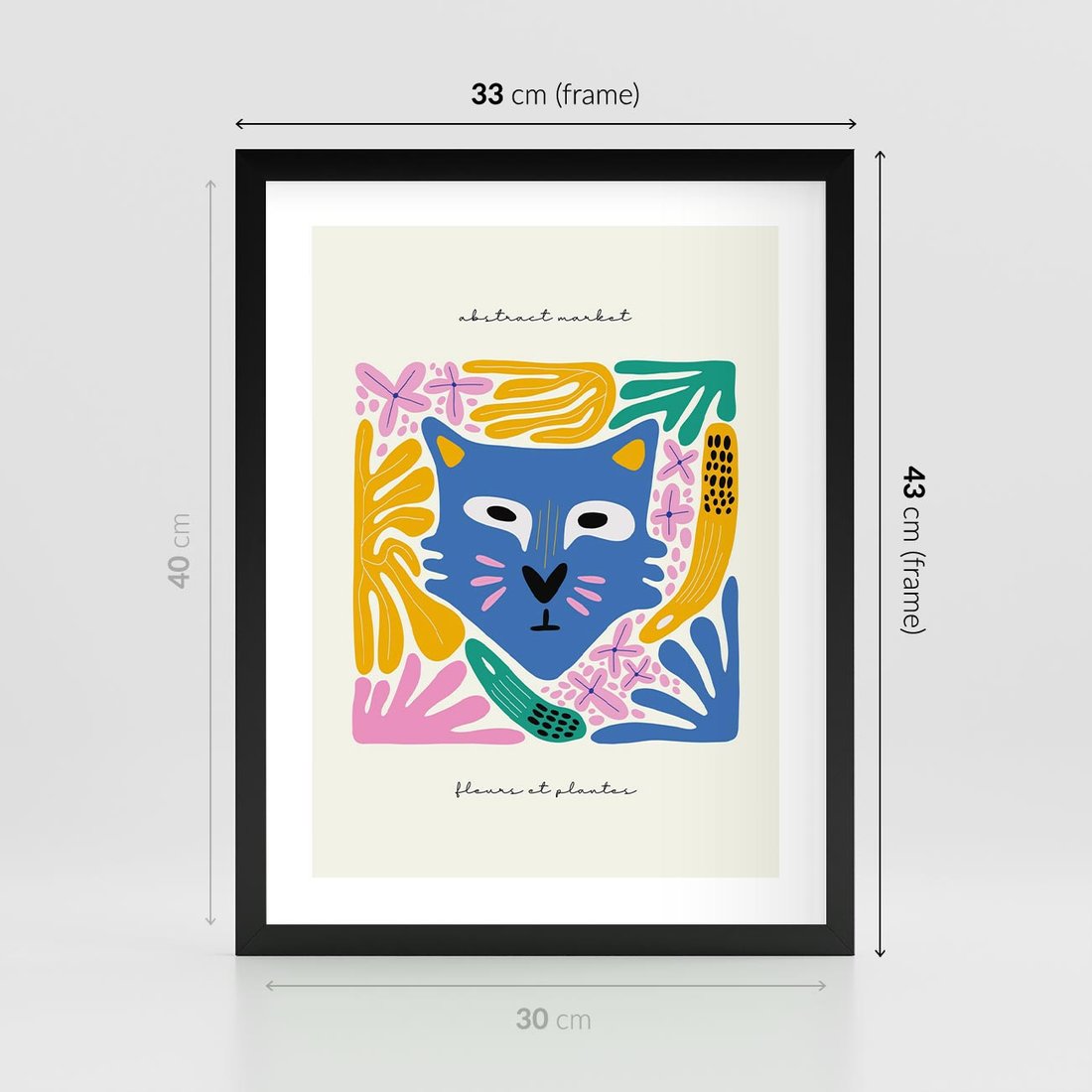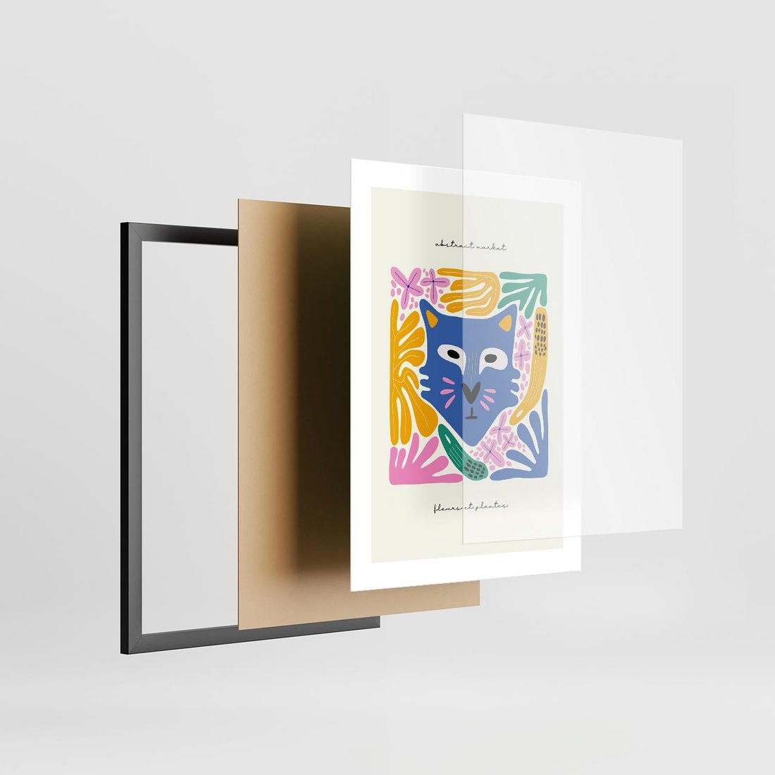 Ten abstrakcyjny plakat przenosi nas w świat eklektycznej sztuki, przedstawiając niebieskiego kota w otoczeniu pastelowych kolorów. Doskonale nadaje się jako ozdoba do salonu, dodając przestrzeni niezwykłego uroku i wyjątkowej atmosfery artystycznego zróżnicowania.