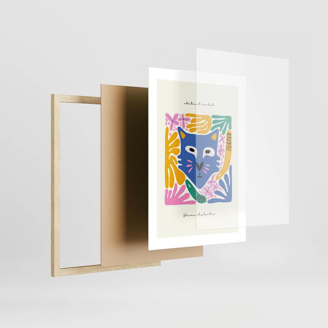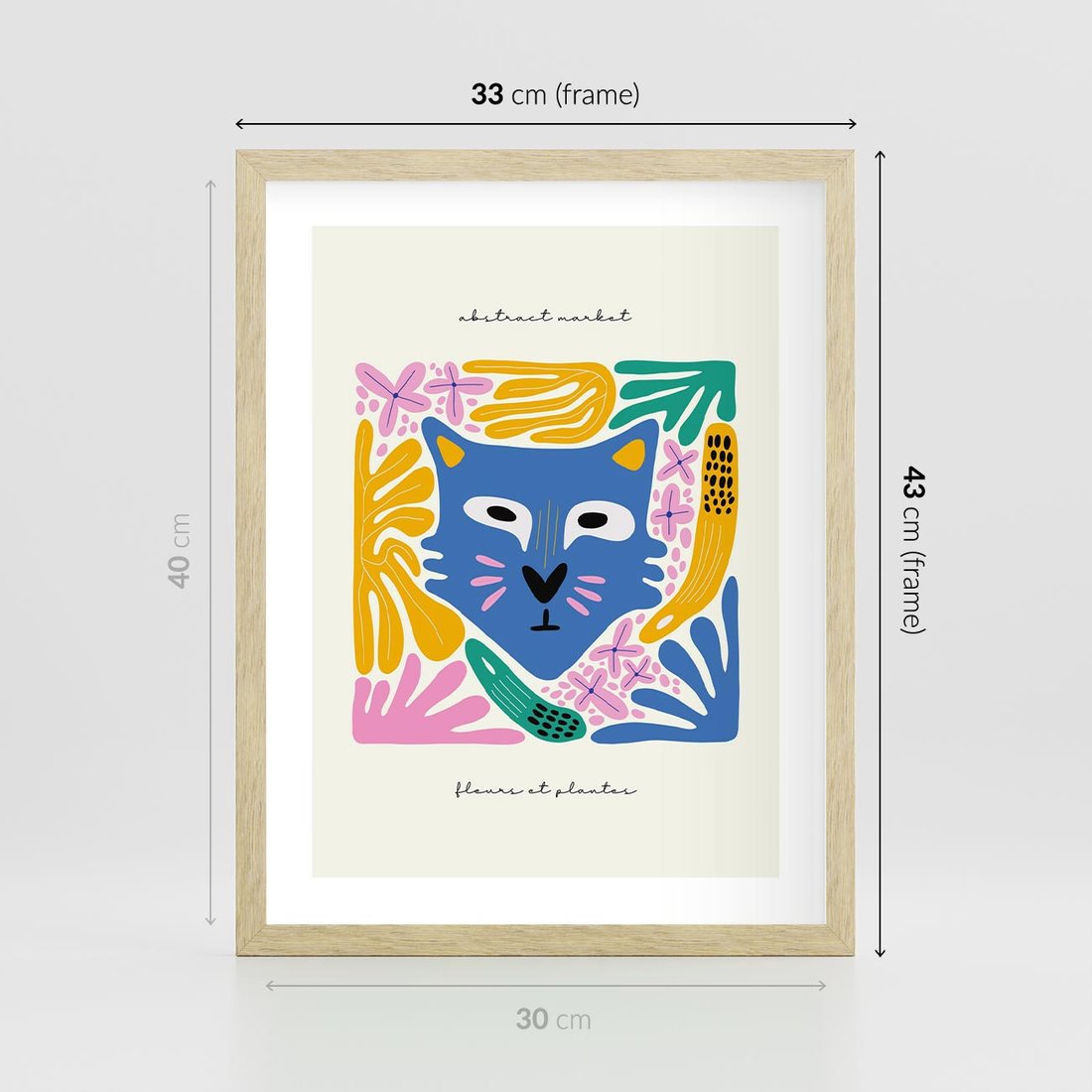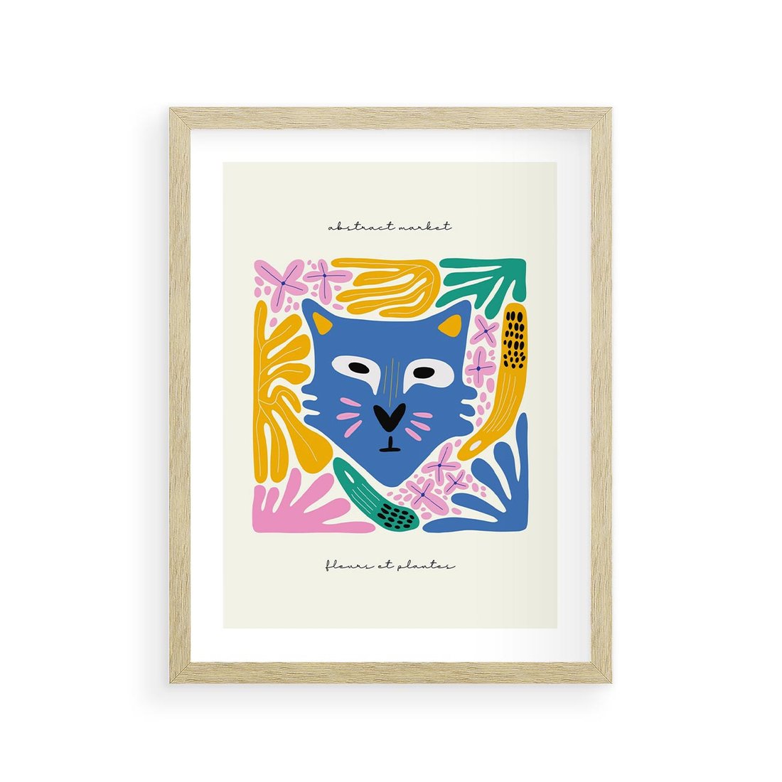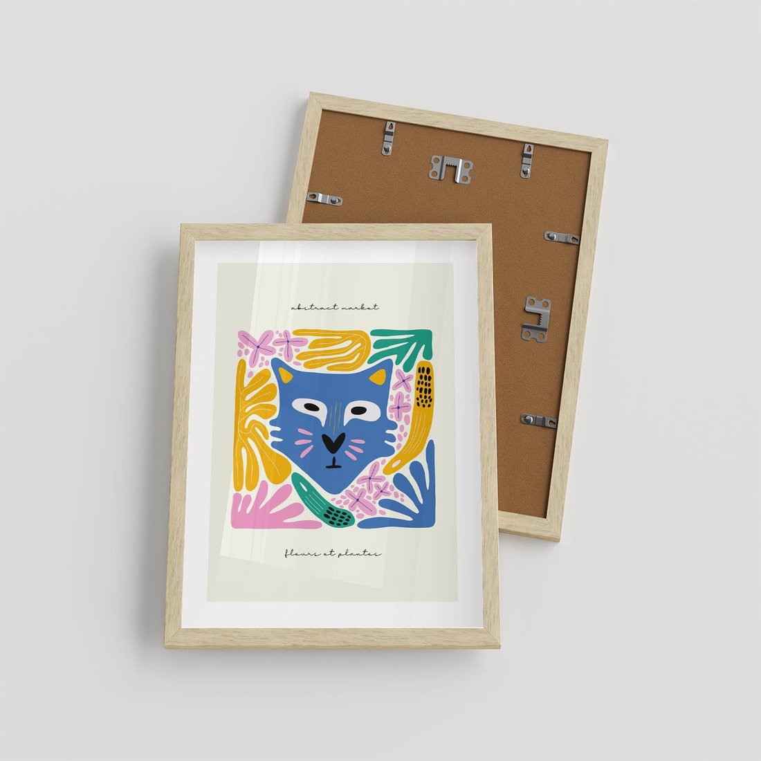 Ten abstrakcyjny plakat przenosi nas w świat eklektycznej sztuki, przedstawiając niebieskiego kota w otoczeniu pastelowych kolorów. Doskonale nadaje się jako ozdoba do salonu, dodając przestrzeni niezwykłego uroku i wyjątkowej atmosfery artystycznego zróżnicowania.