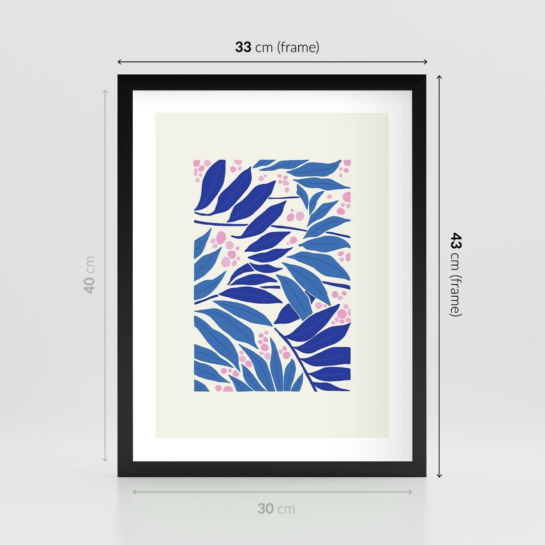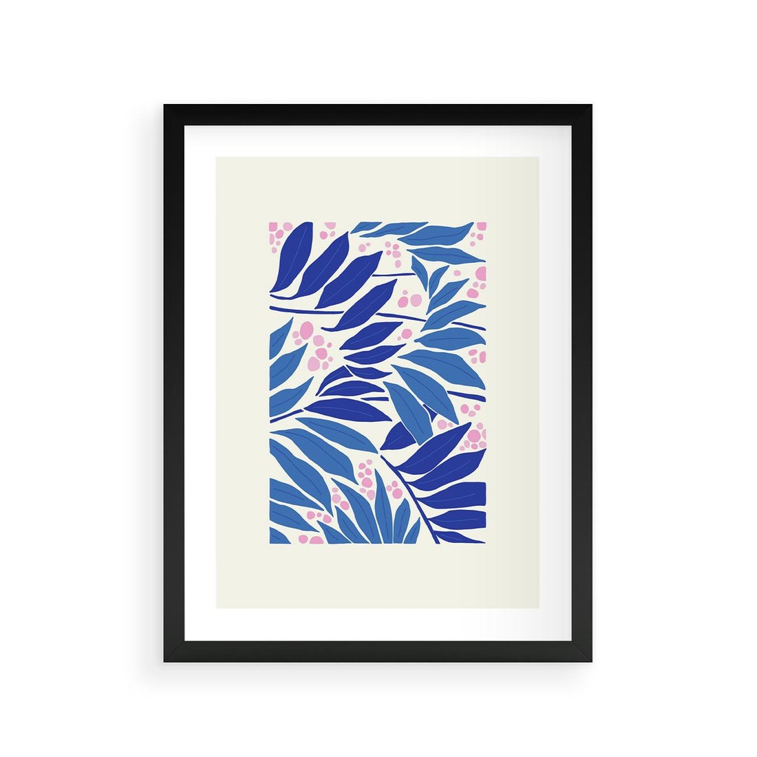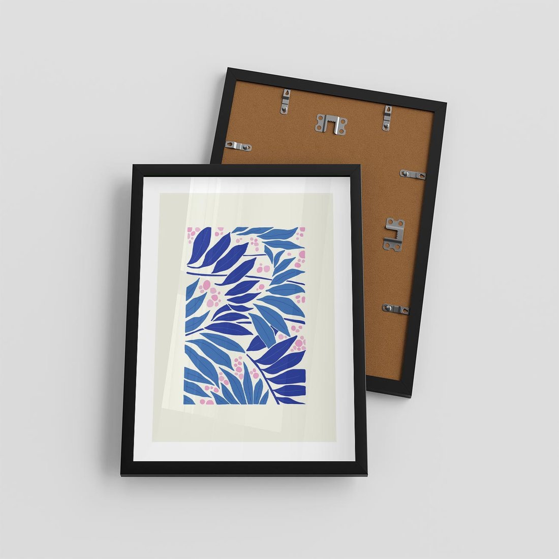 Ten nowoczesny plakat przedstawia abstrakcyjną liściastą kompozycję, w której dominują odcienie niebieskiego i błękitu. Sztuka ta tworzy spokojną i pełną harmonii atmosferę, zachęcając do kontemplacji natury i form w unikalny sposób.