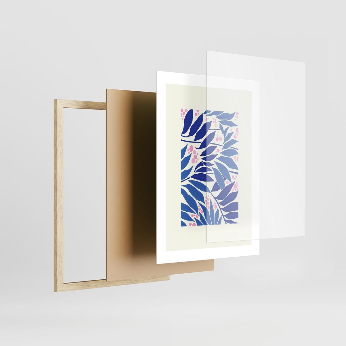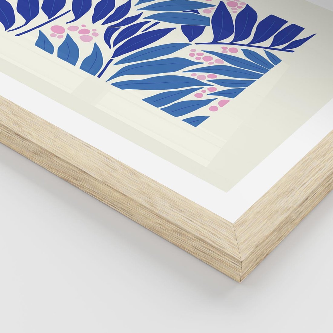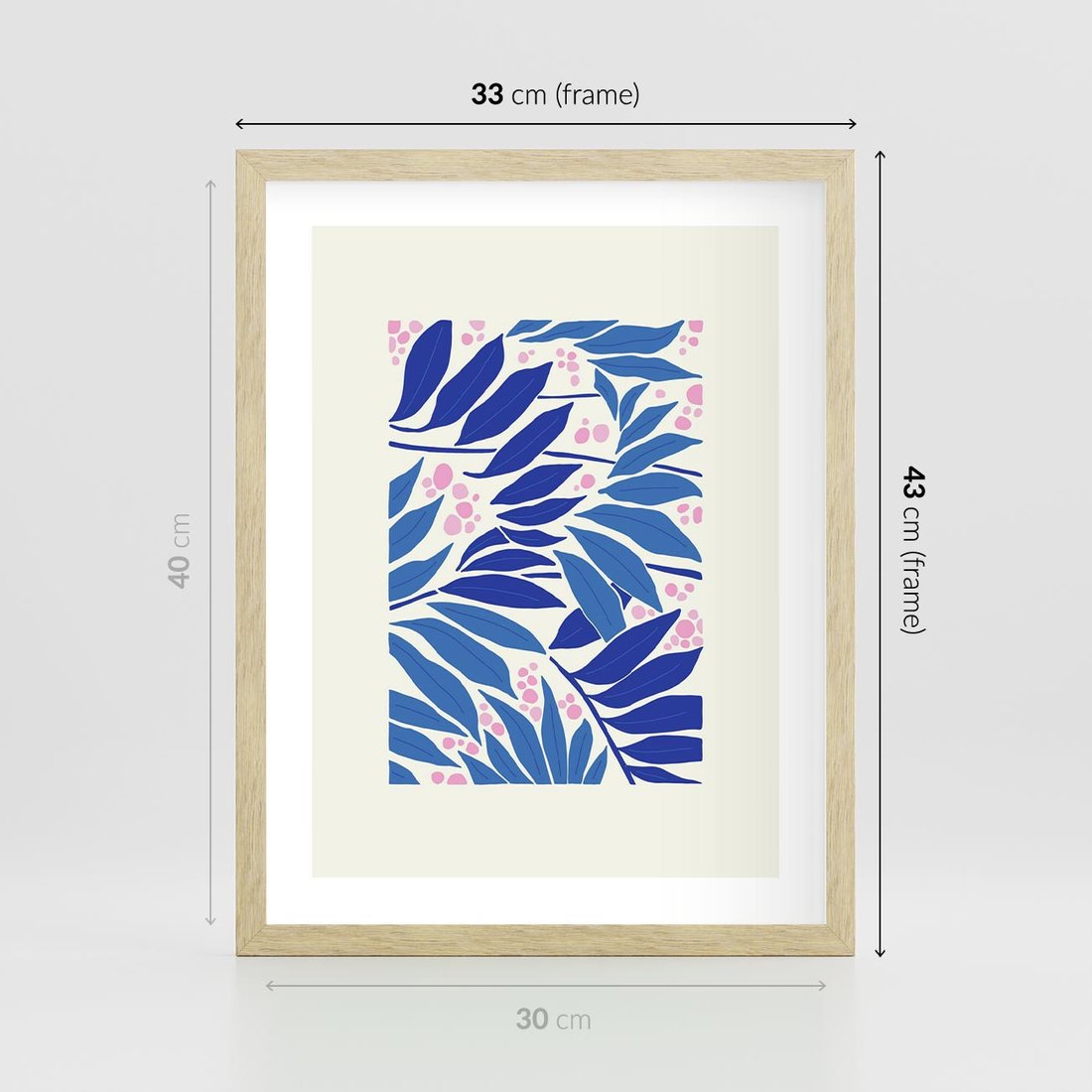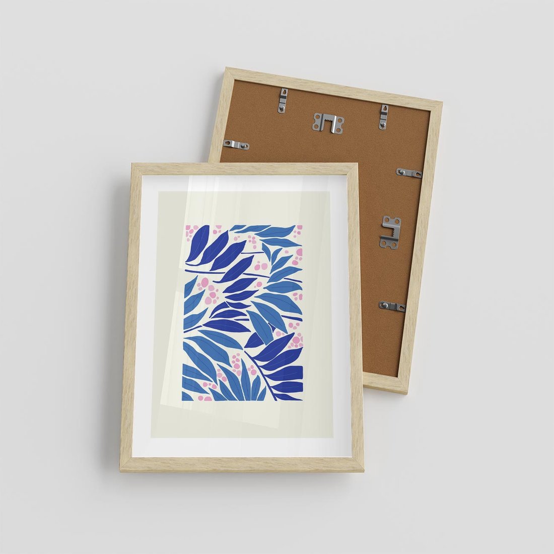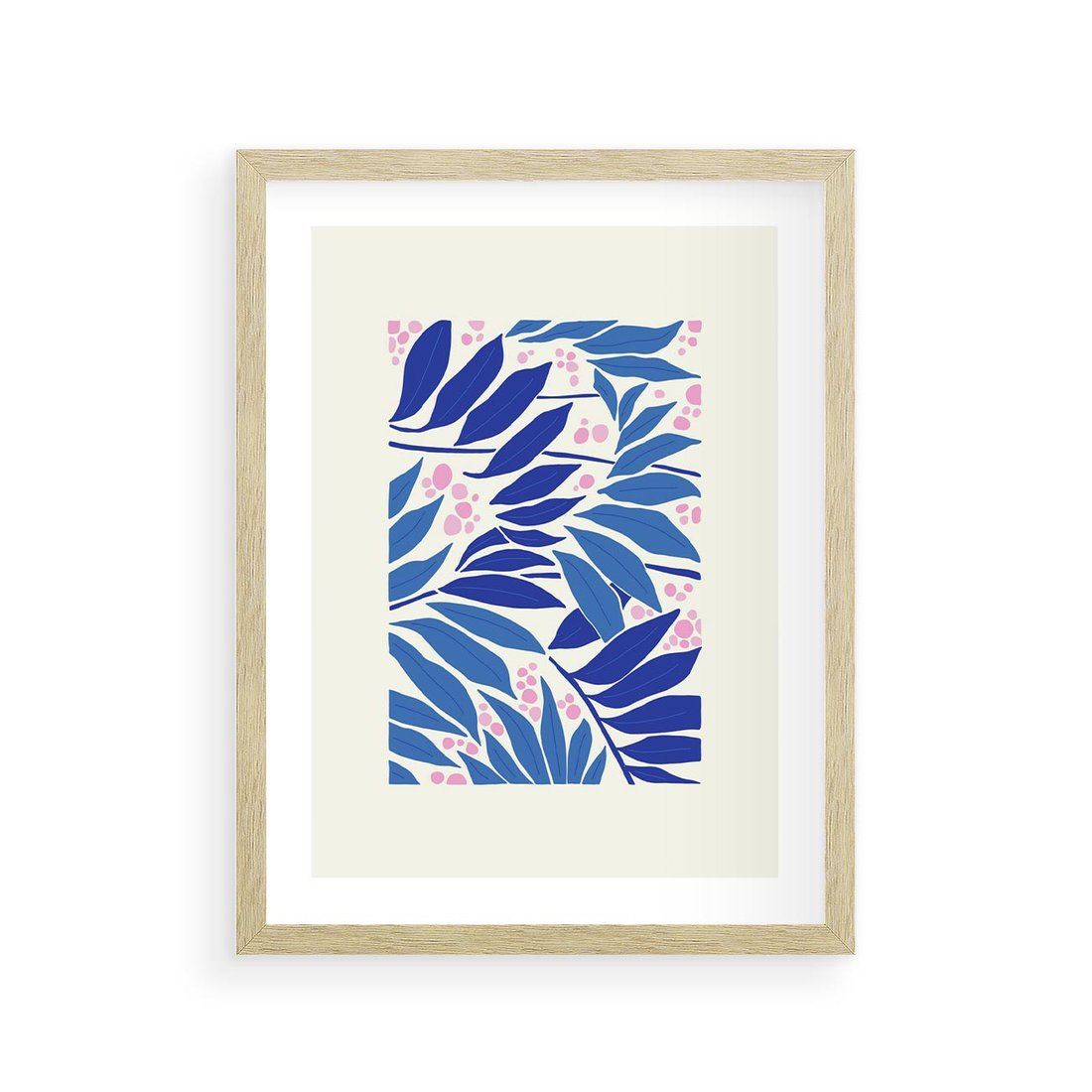 Ten nowoczesny plakat przedstawia abstrakcyjną liściastą kompozycję, w której dominują odcienie niebieskiego i błękitu. Sztuka ta tworzy spokojną i pełną harmonii atmosferę, zachęcając do kontemplacji natury i form w unikalny sposób.