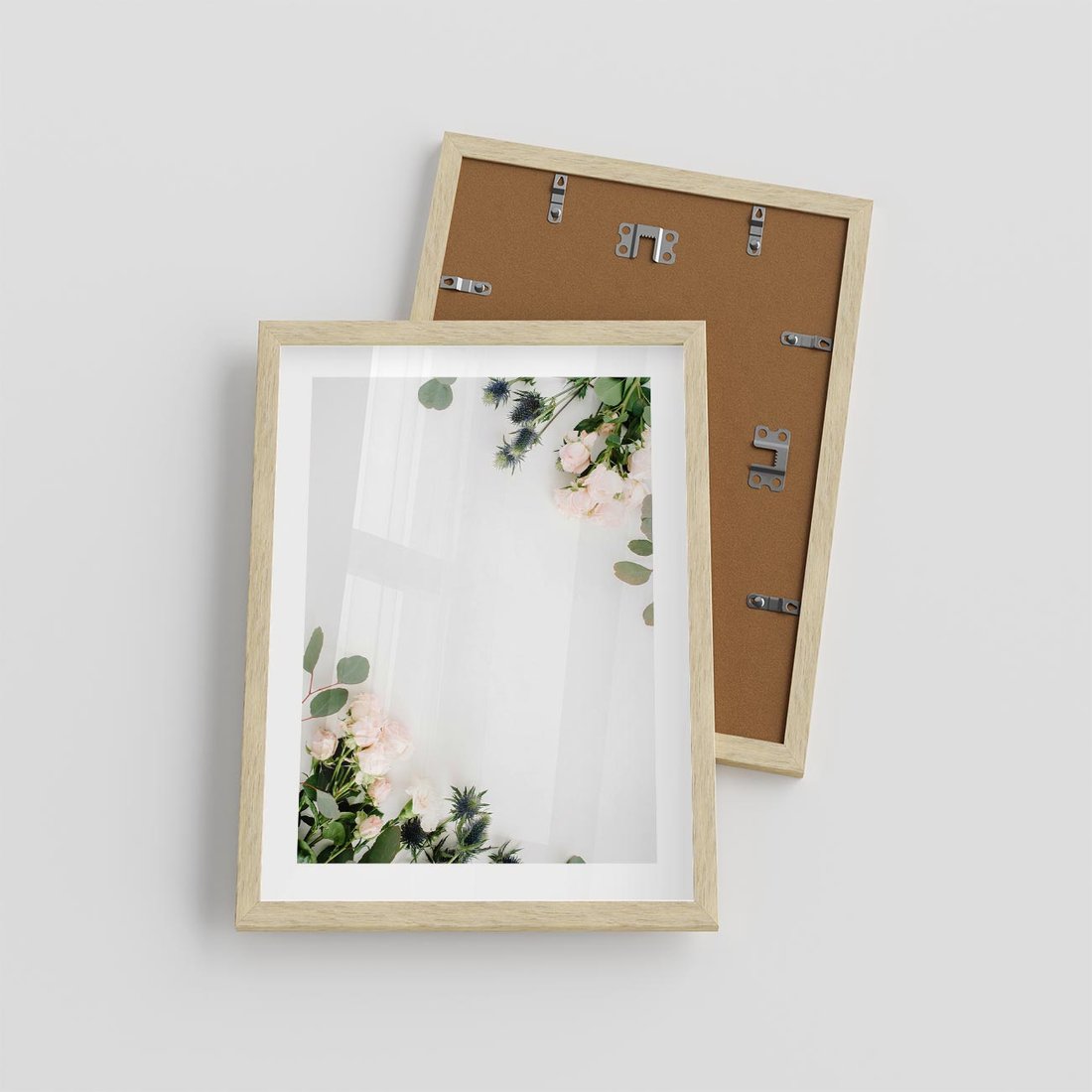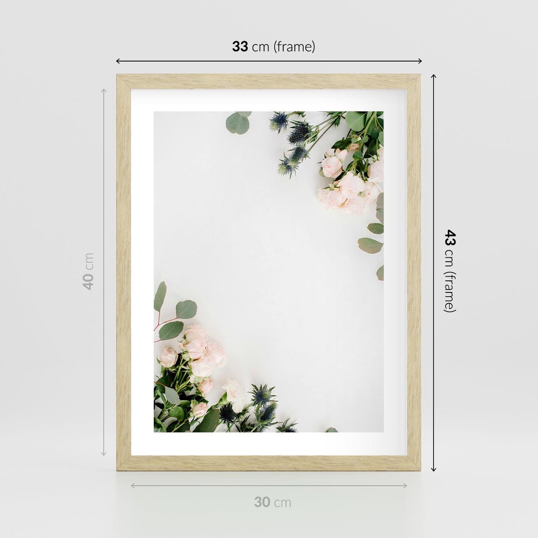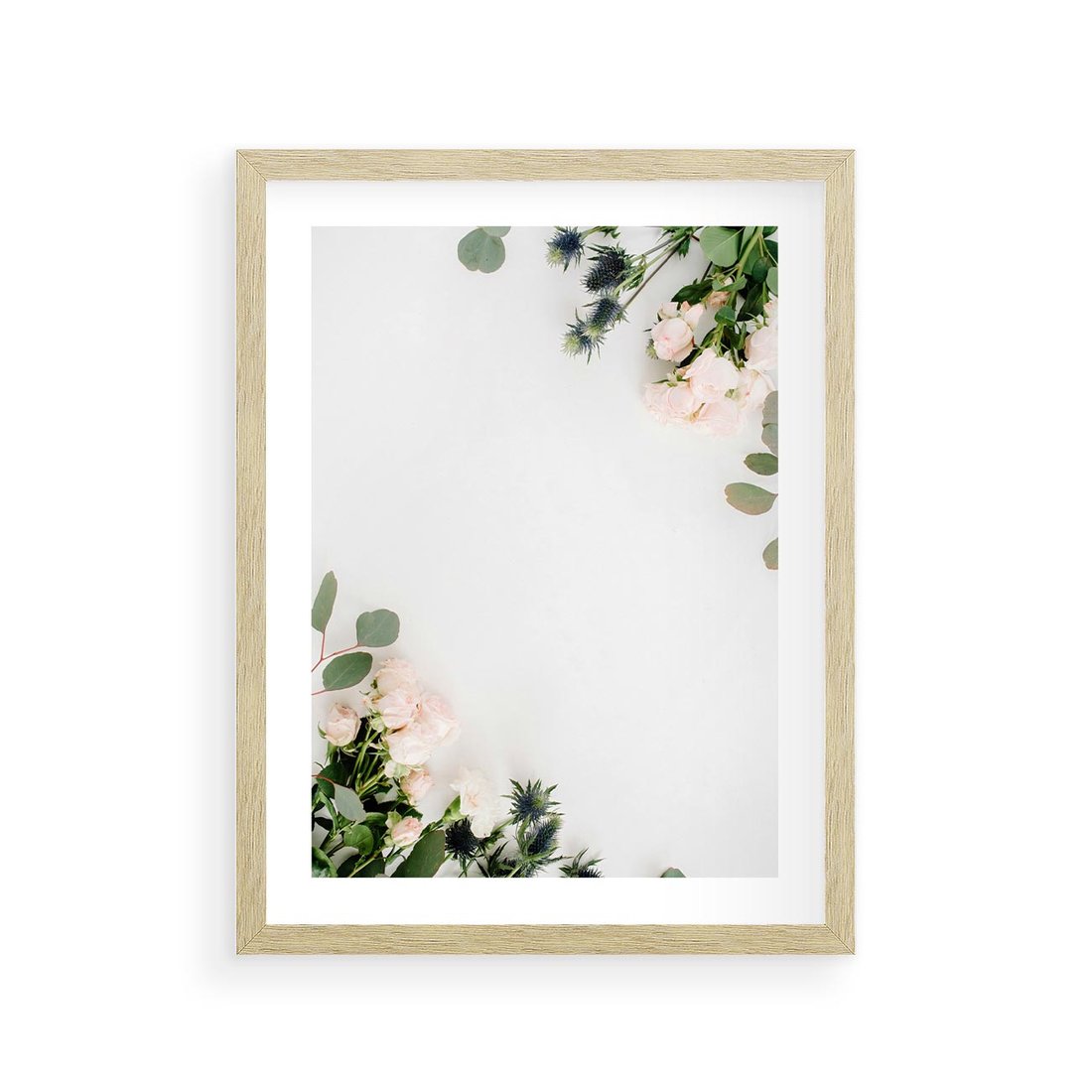 Plakat w ramie 30x40 - Kompozycja z Białych Róż i Eukaliptusa - kompozycja z białych kwiatów na białym tle, róże - rama drewno