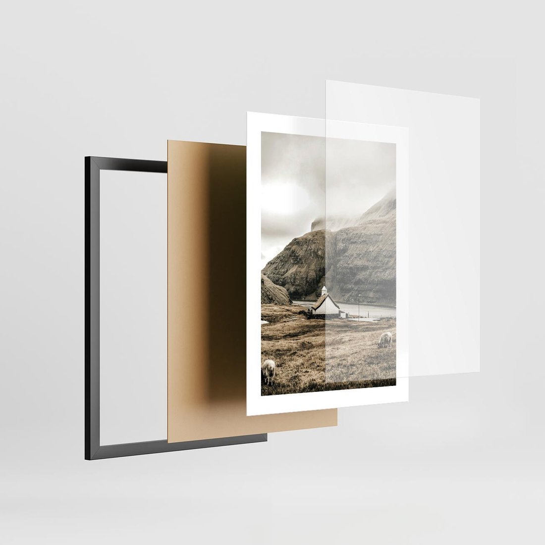 Plakat w ramie 30x40 - Kościół na Wzgórzu: Sepia Nostalgii - kościół w górach, na wzgórzu - rama czarna