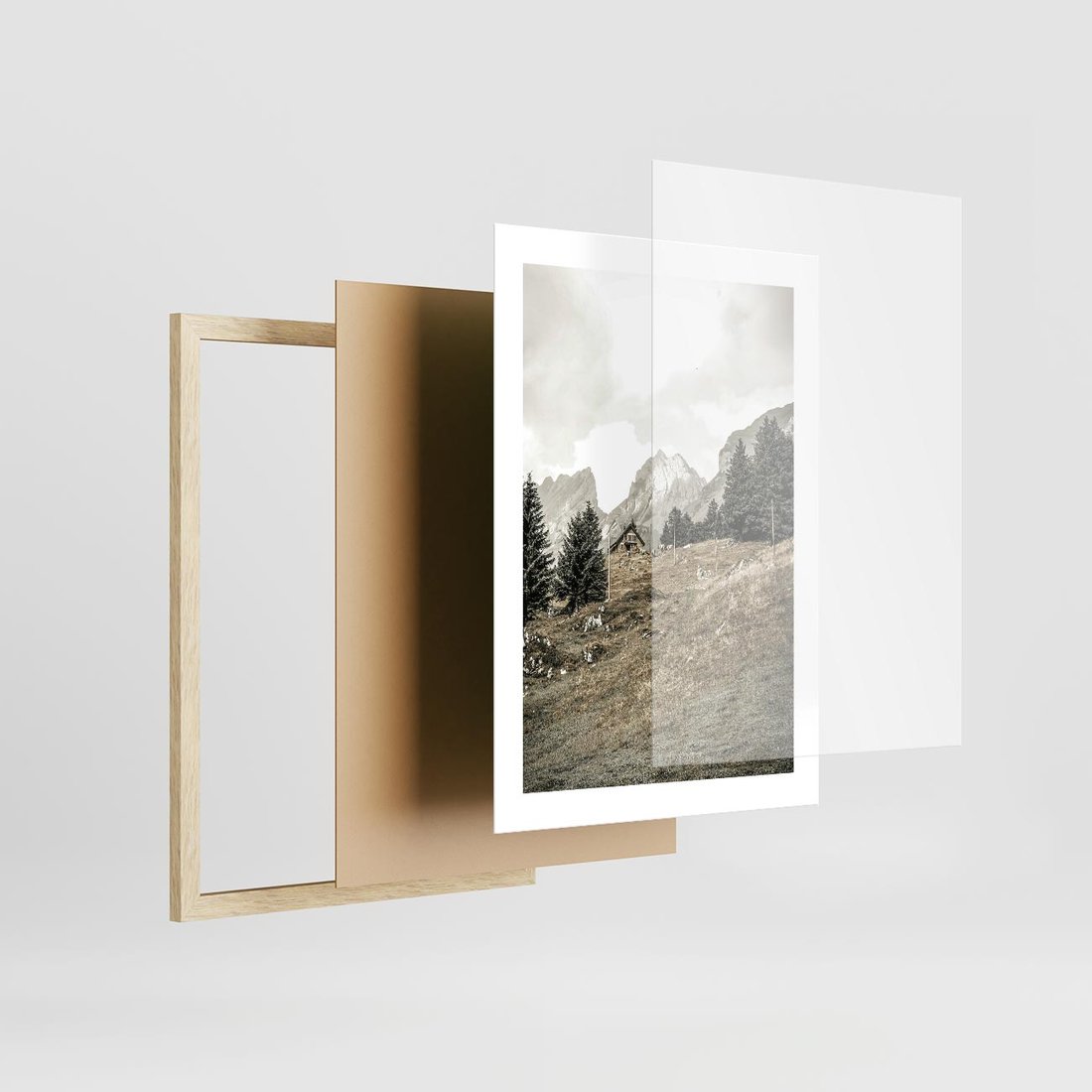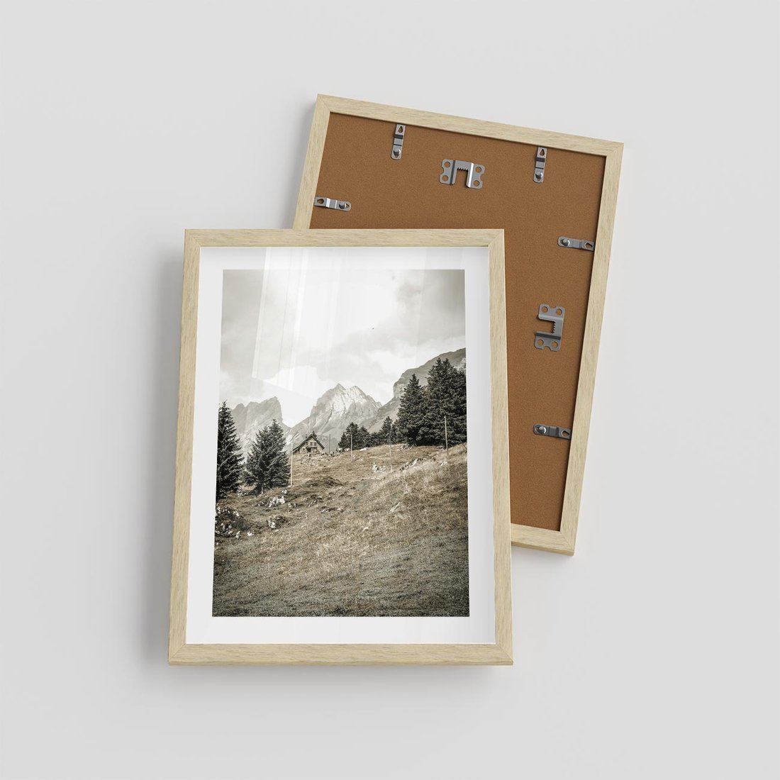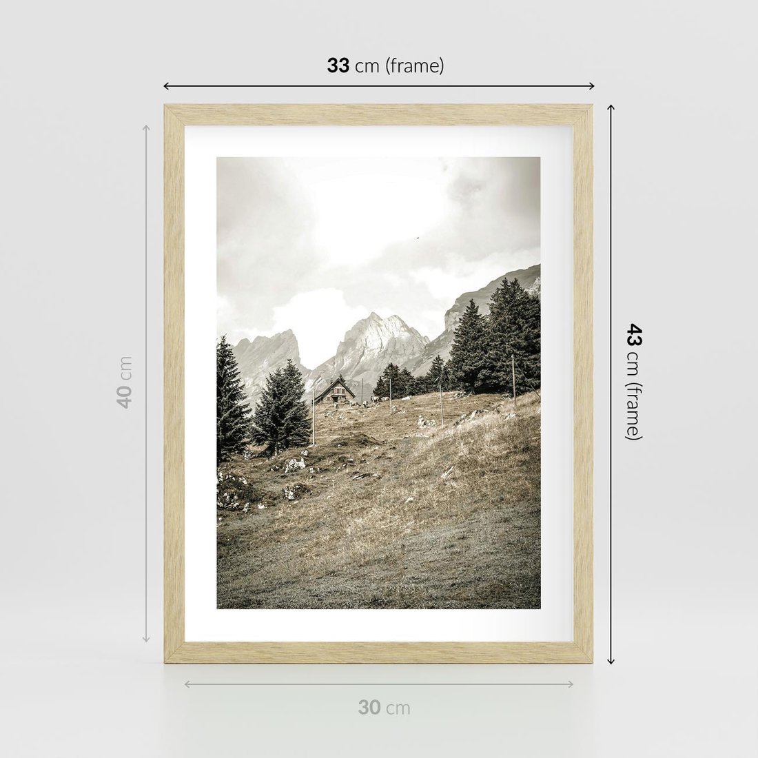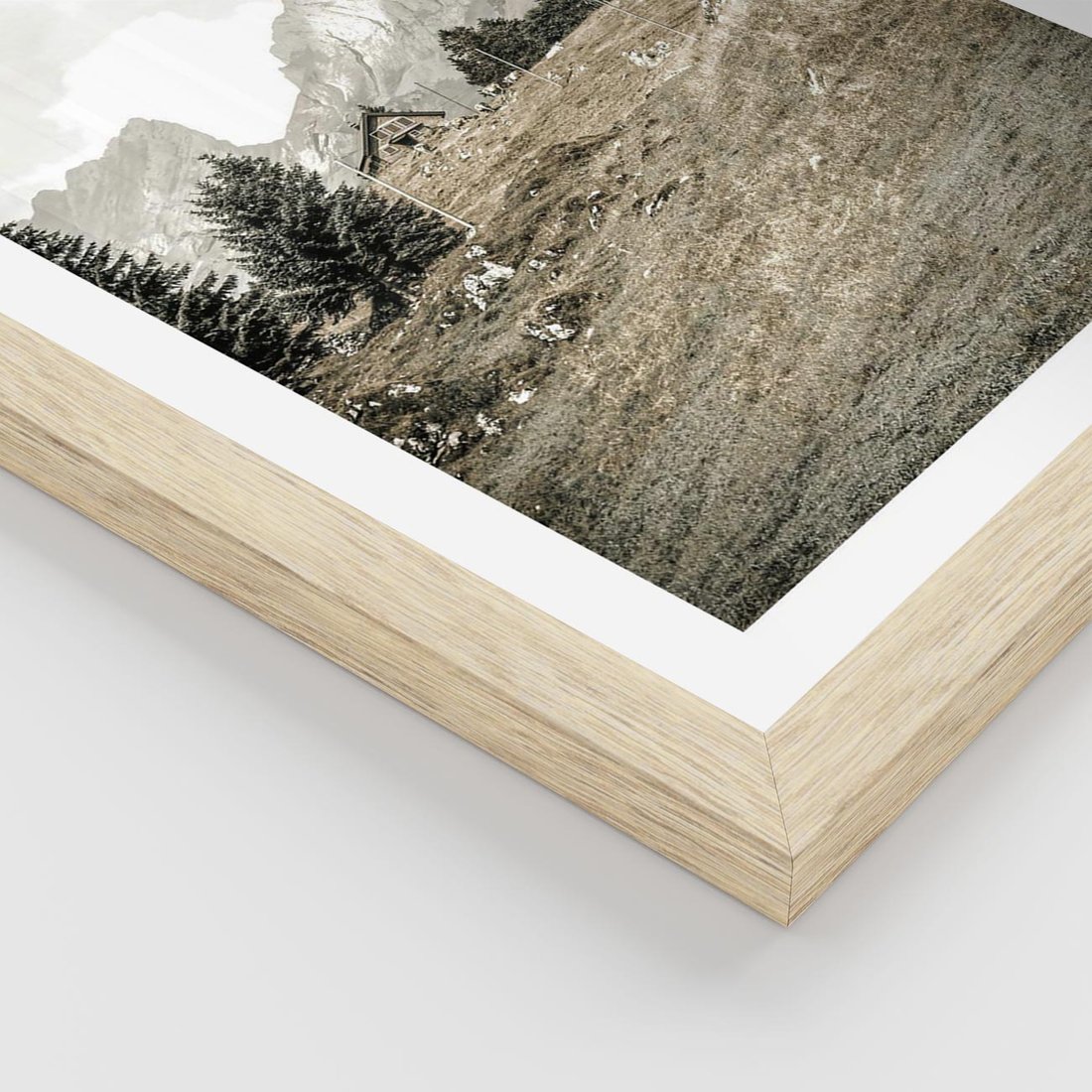Plakat w ramie 30x40 - Krajobraz Sepii: Domek w Górach - domek w górach, góry - rama drewno