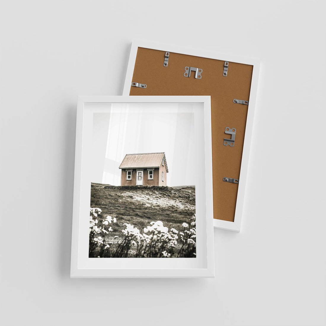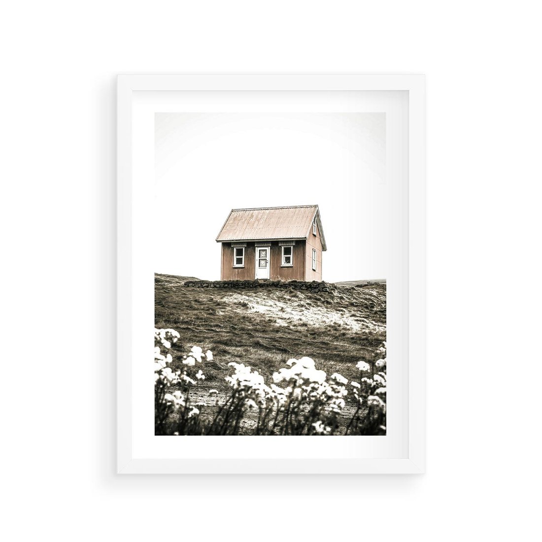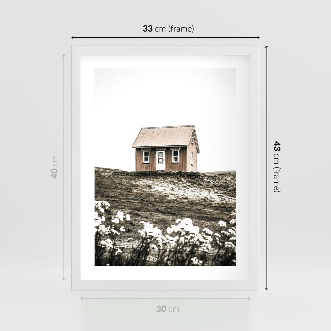 Plakat w ramie 30x40 - Krajobraz z Przeszłości: Kwitnąca Łąka w Sepii - domek na wzgórzu, kwitnąca łąka - rama biała
