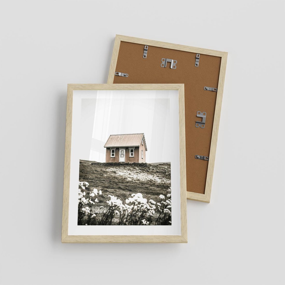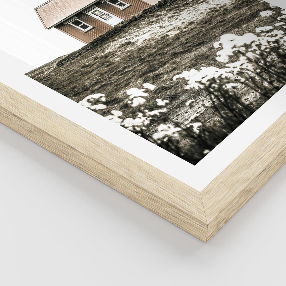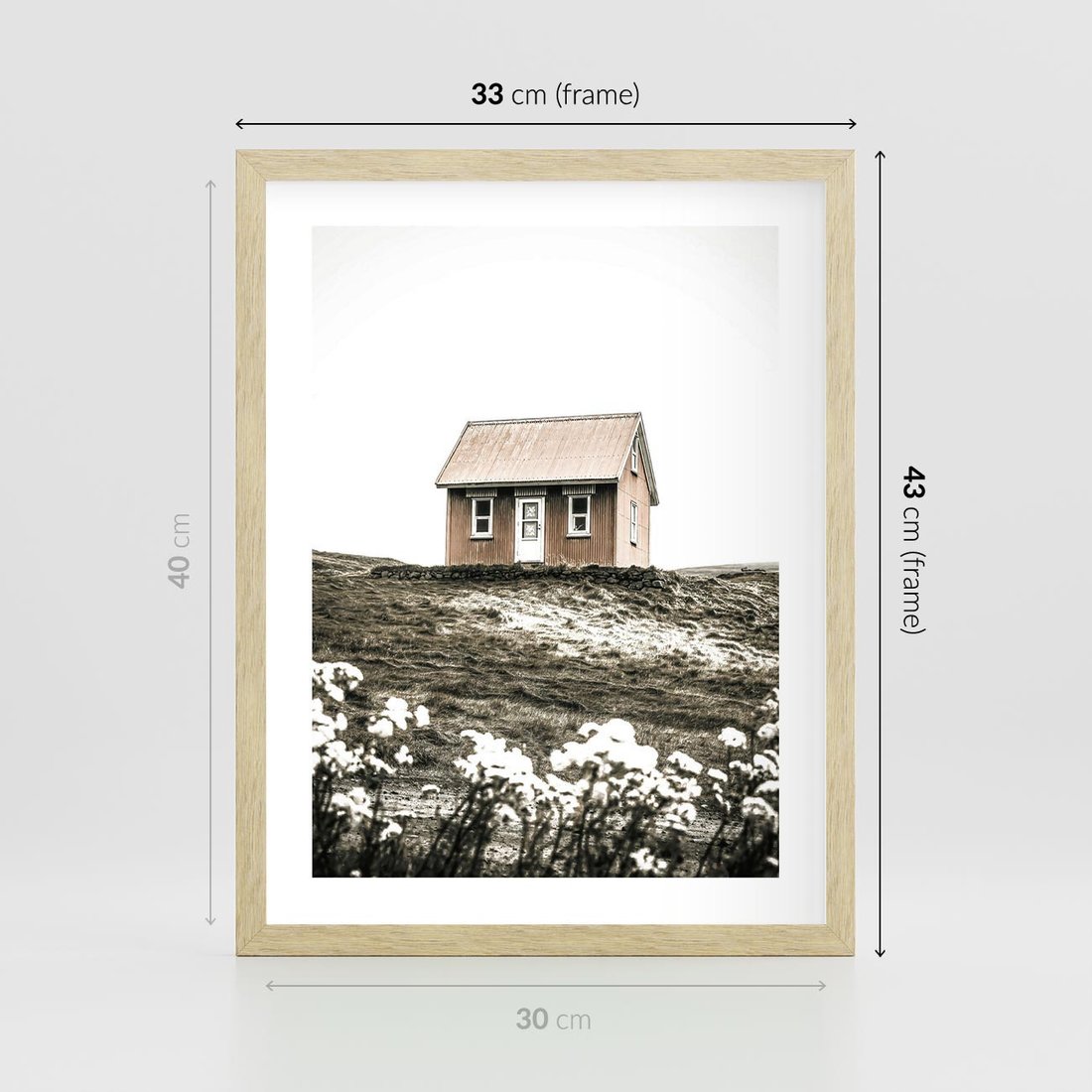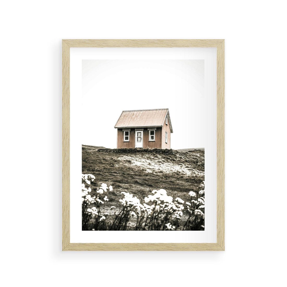 Plakat w ramie 30x40 - Krajobraz z Przeszłości: Kwitnąca Łąka w Sepii - domek na wzgórzu, kwitnąca łąka - rama drewno