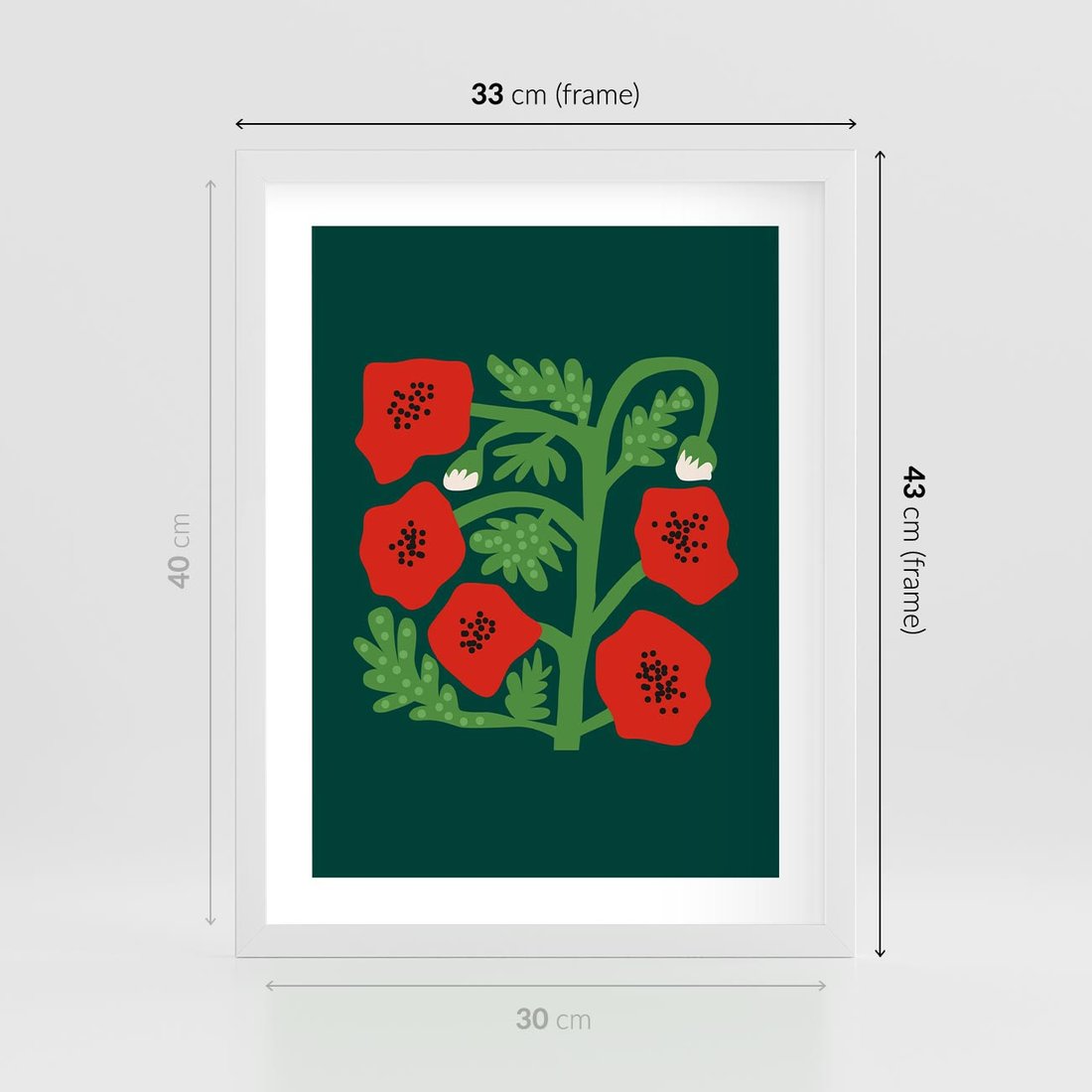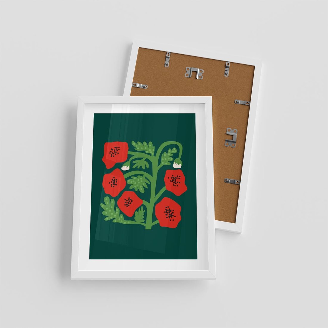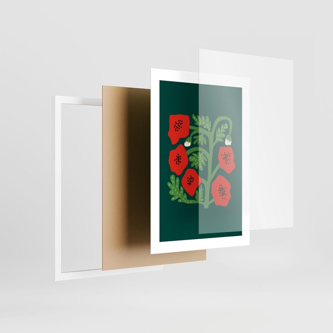 Ten nowoczesny plakat prezentuje abstrakcyjną kwiatową kompozycję na głębokim, zielonym tle. Sztuka ta wnosi witalność i harmonię natury do Twojego salonu, tworząc przestrzeń pełną życia i inspiracji, która zachęca do wewnętrznej refleksji i wyciszenia.