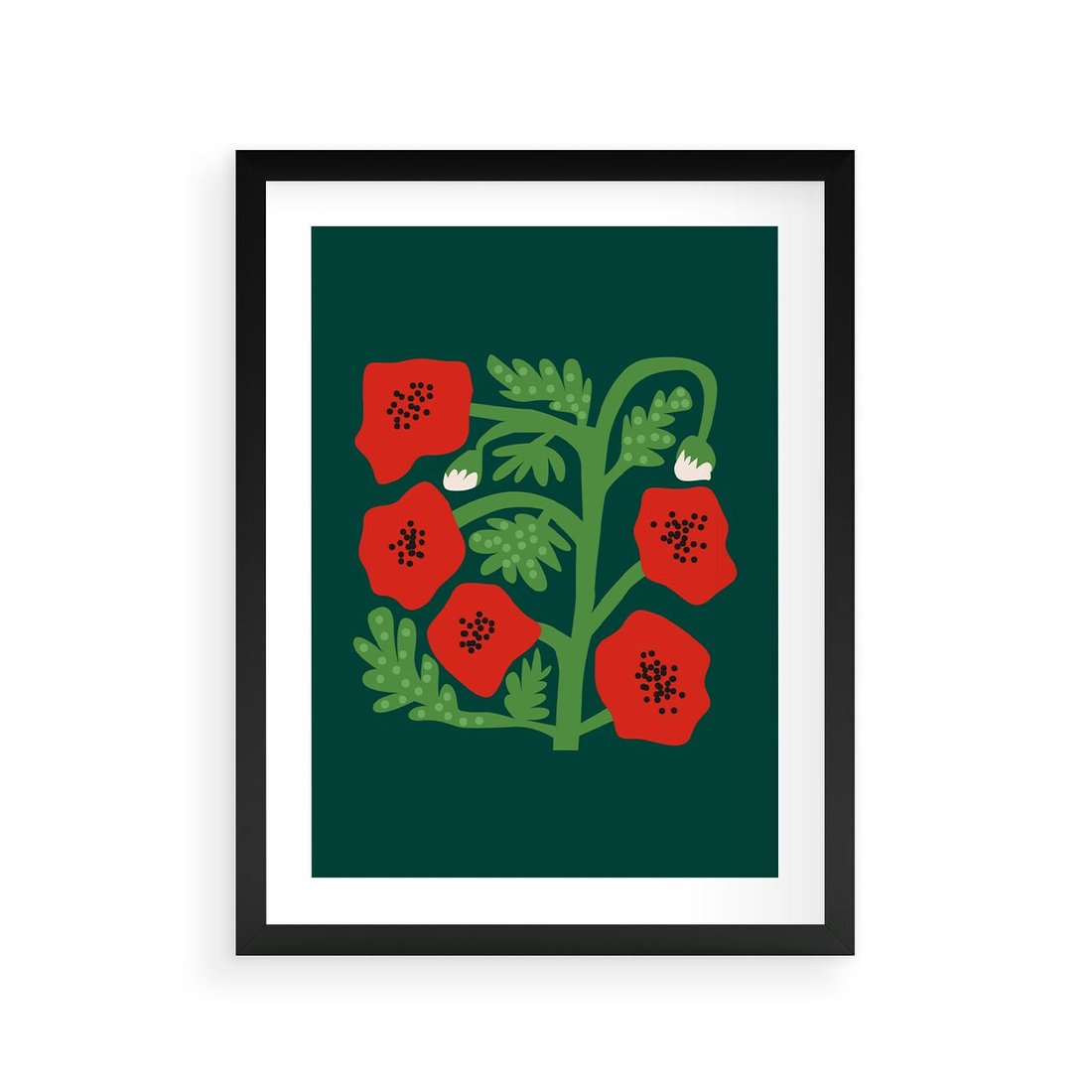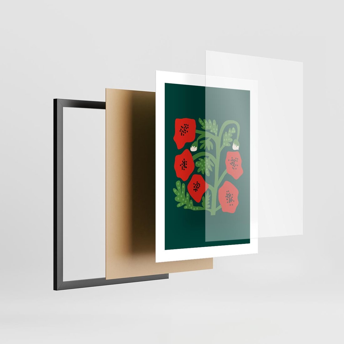 Ten nowoczesny plakat prezentuje abstrakcyjną kwiatową kompozycję na głębokim, zielonym tle. Sztuka ta wnosi witalność i harmonię natury do Twojego salonu, tworząc przestrzeń pełną życia i inspiracji, która zachęca do wewnętrznej refleksji i wyciszenia.
