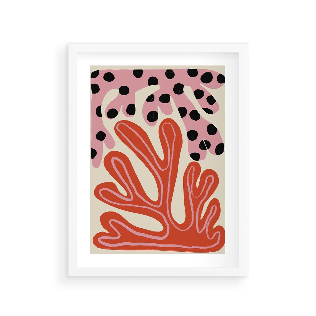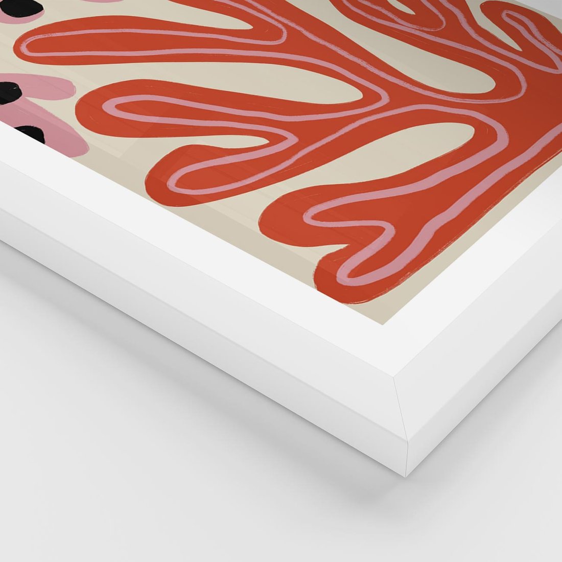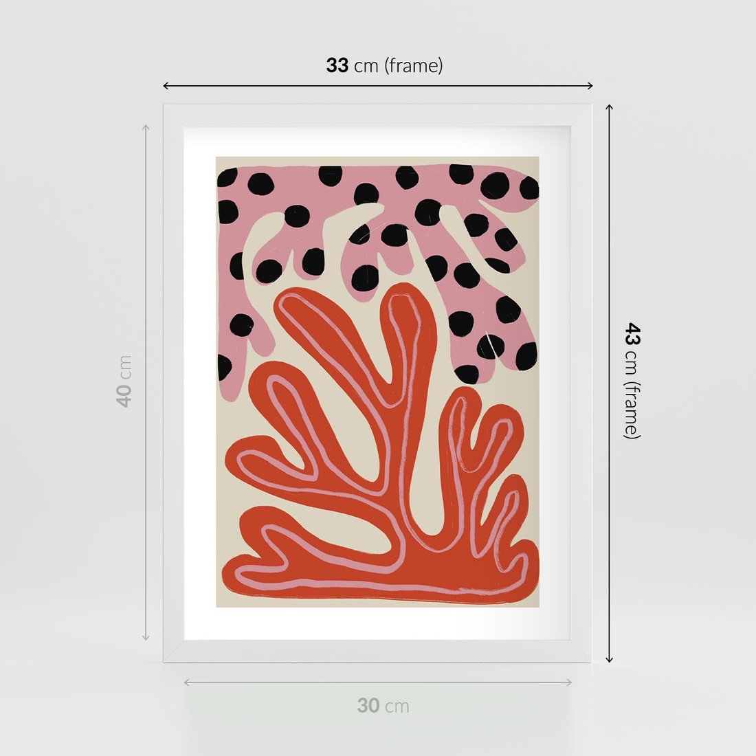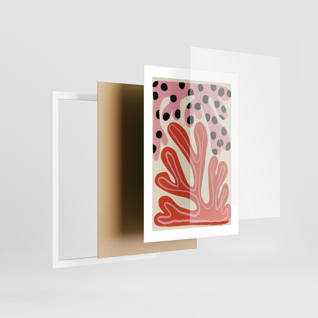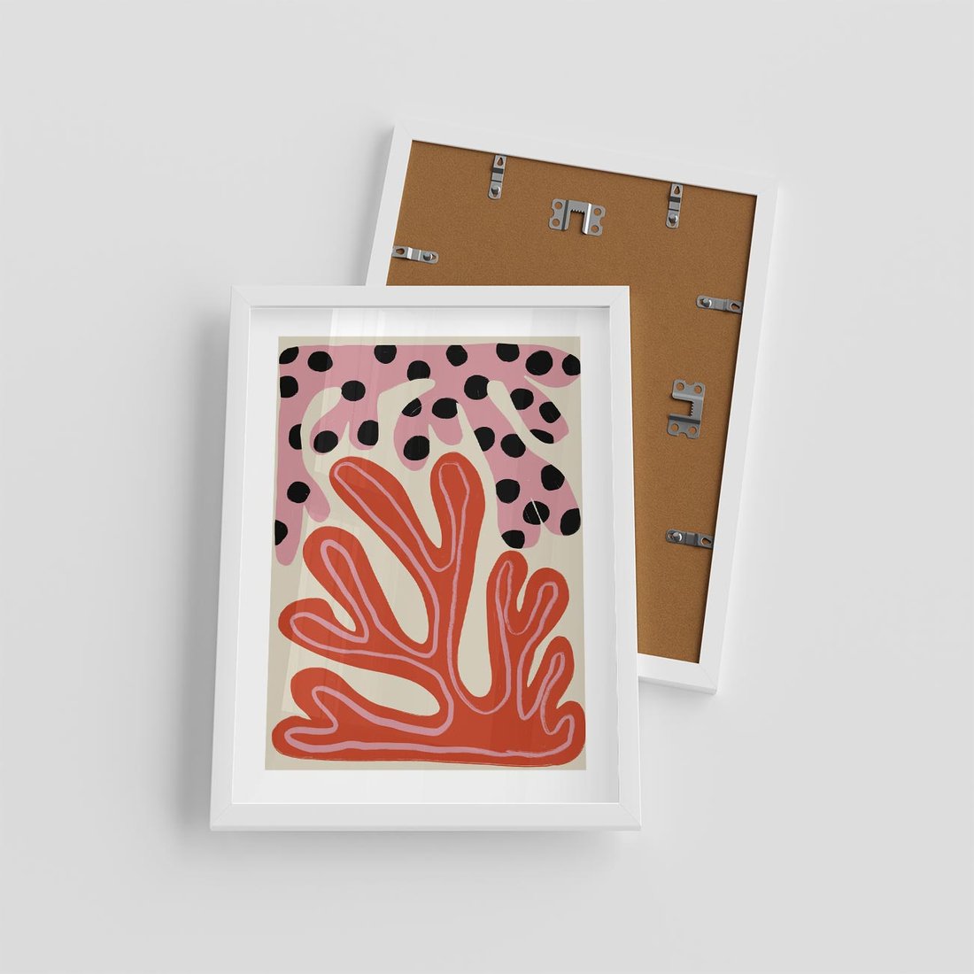 Ten abstrakcyjny obraz w formie plakatu fascynuje dziwnymi kształtami, które tworzą harmonię w odcieniach różowego i czerwonego. Jego wyjątkowość polega na zdolności zachęcania do refleksji, pobudzając wyobraźnię widza poprzez niekonwencjonalne kompozycje i intensywne barwy.