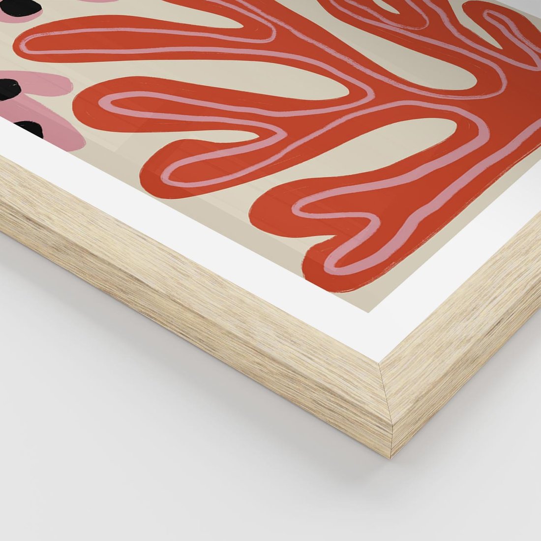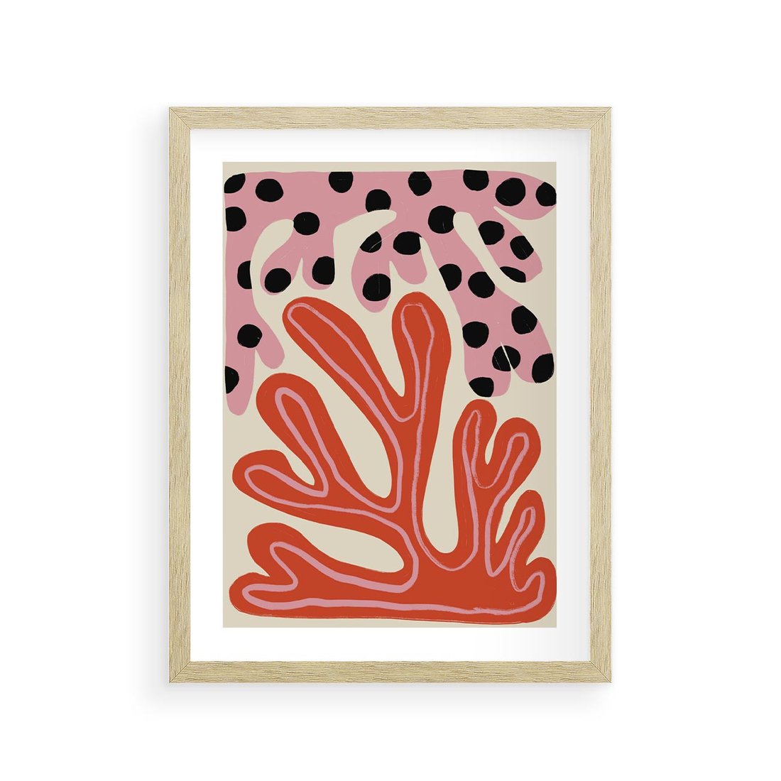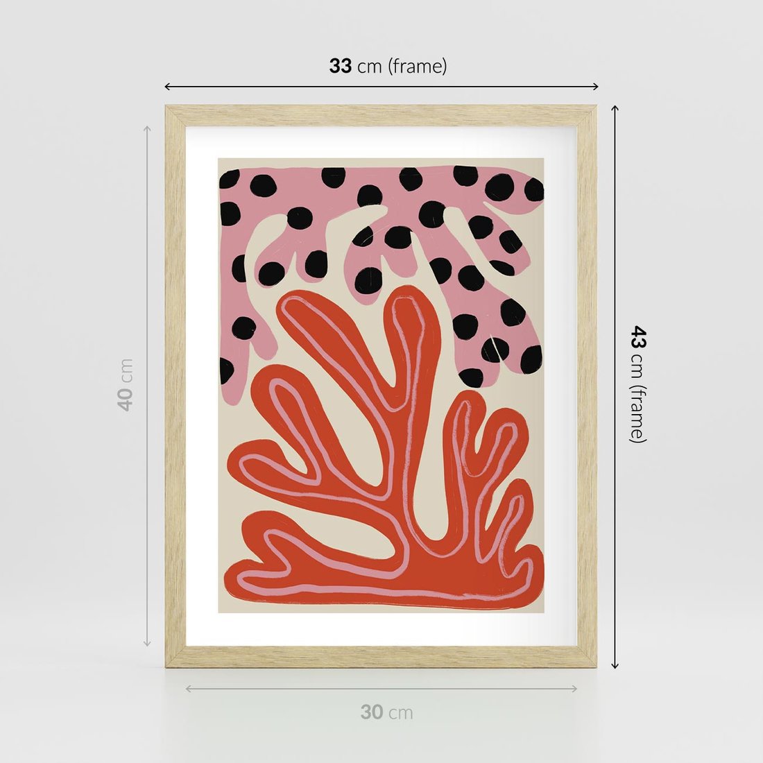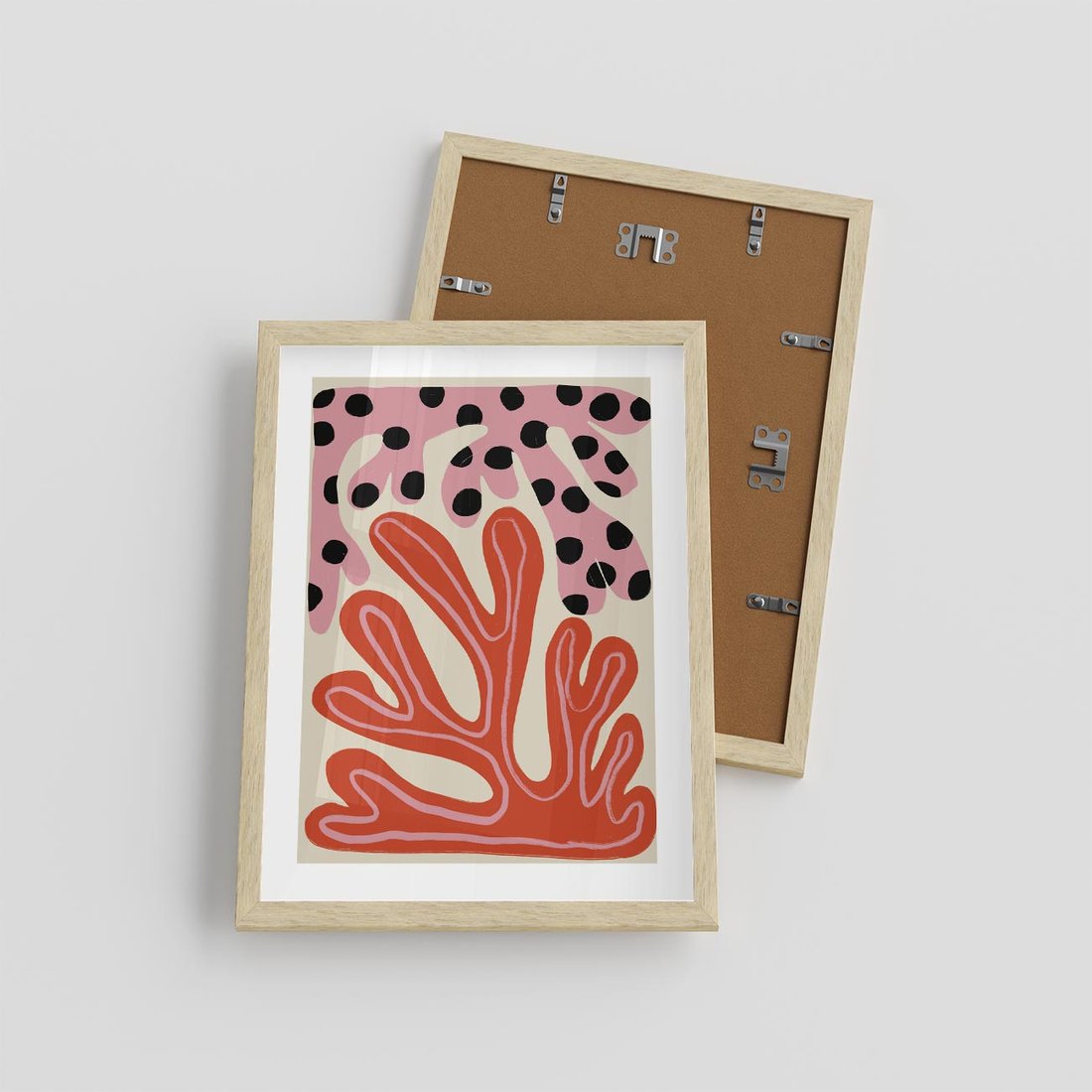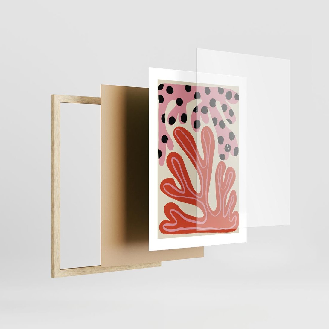 Ten abstrakcyjny obraz w formie plakatu fascynuje dziwnymi kształtami, które tworzą harmonię w odcieniach różowego i czerwonego. Jego wyjątkowość polega na zdolności zachęcania do refleksji, pobudzając wyobraźnię widza poprzez niekonwencjonalne kompozycje i intensywne barwy.