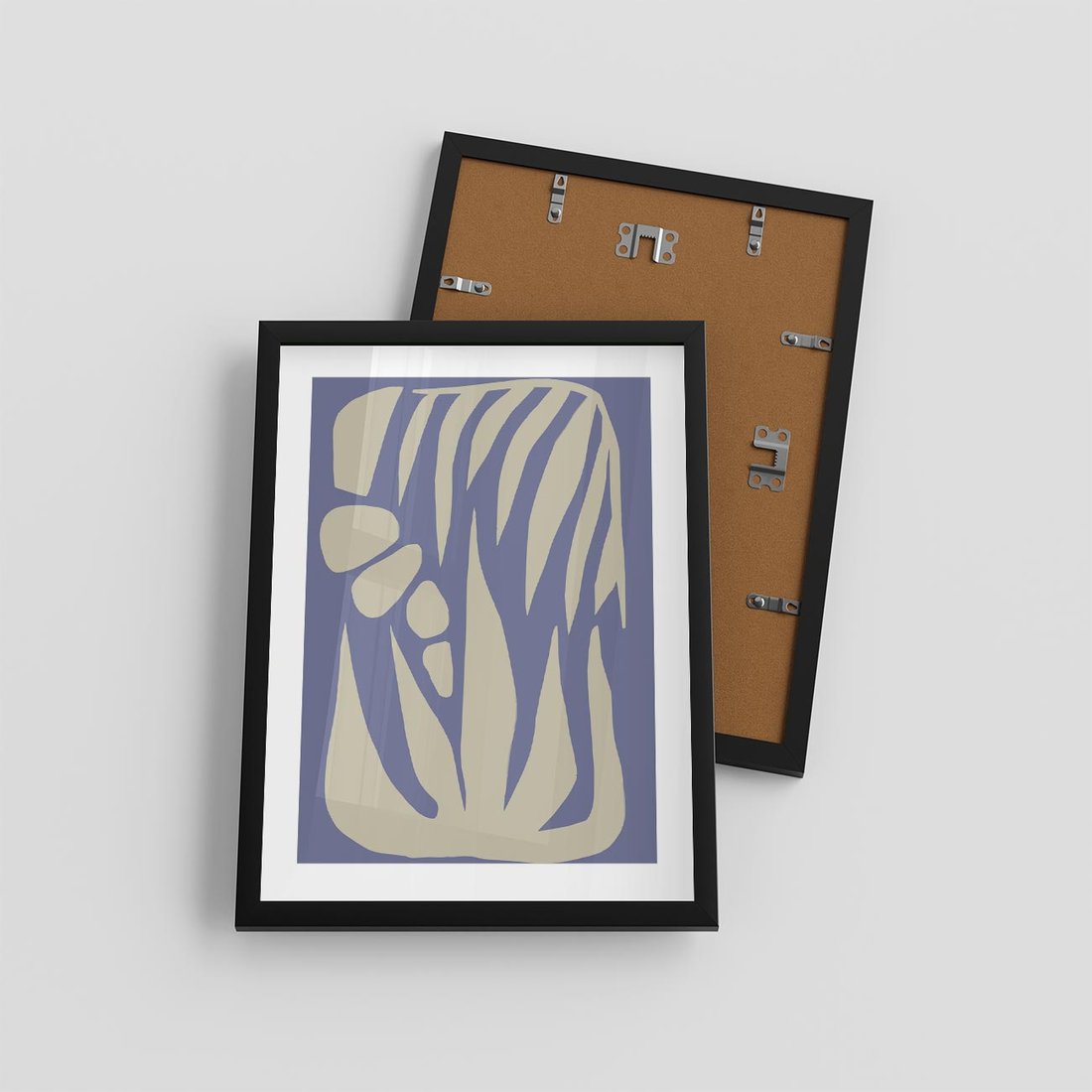 Abstrakcyjna sztuka w skandynawskim stylu, emanująca chabrowym kolorem, łączy prostotę i wyrazistość, tworząc harmonijną atmosferę.