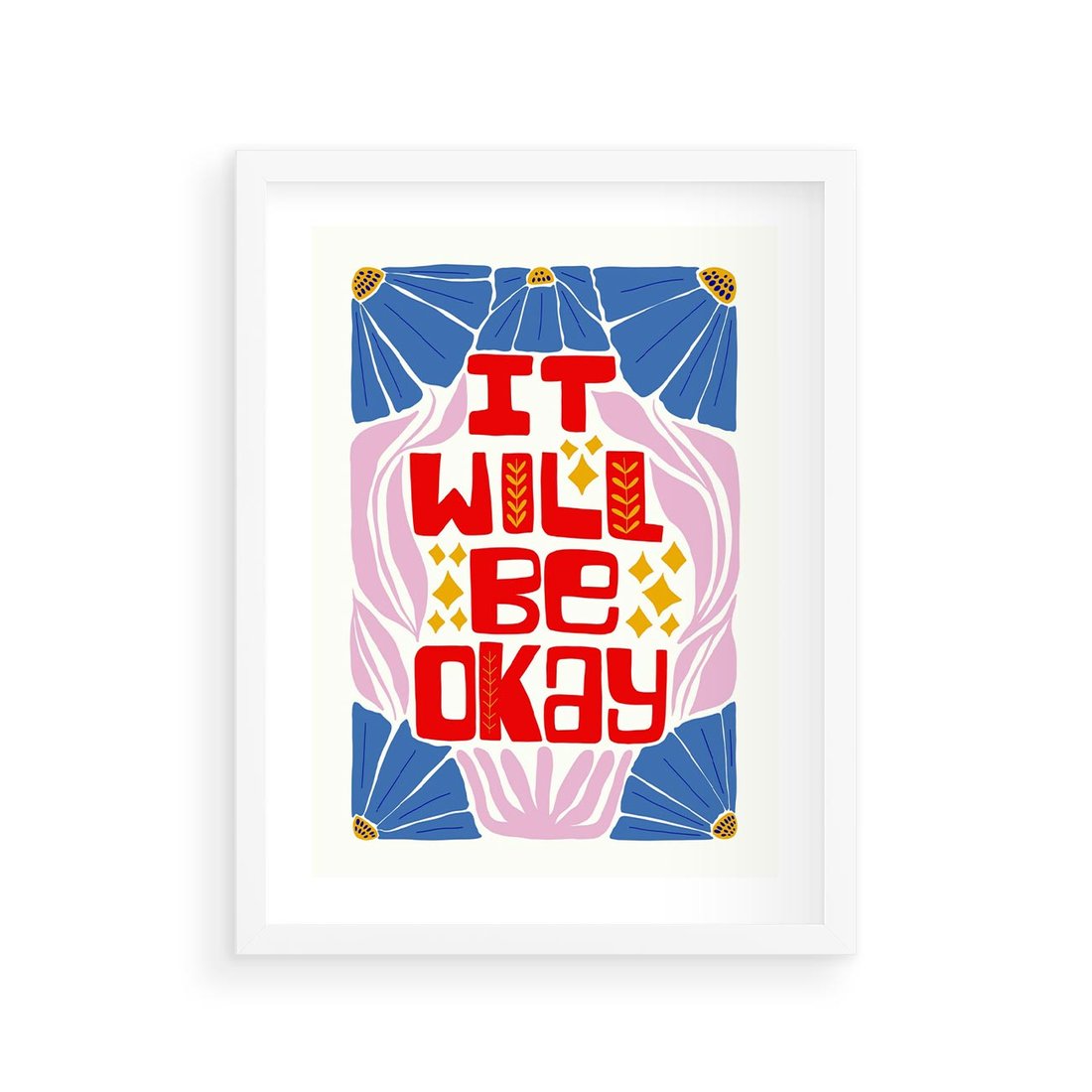 Czerwona typografia wypływa na tle delikatnych pastelowych kwiatów, tworząc inspirującą kompozycję. Ta sztuka emanuje radością i nadaje wnętrzu wyjątkowy urok kwiatowej harmonii.
