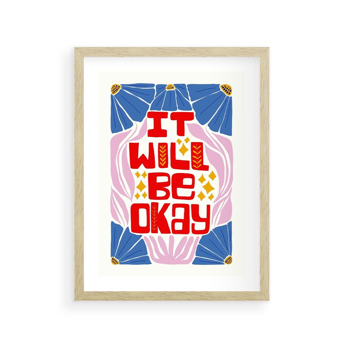 Czerwona typografia wypływa na tle delikatnych pastelowych kwiatów, tworząc inspirującą kompozycję. Ta sztuka emanuje radością i nadaje wnętrzu wyjątkowy urok kwiatowej harmonii.