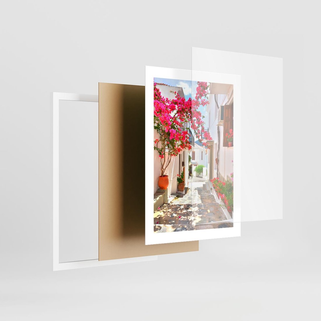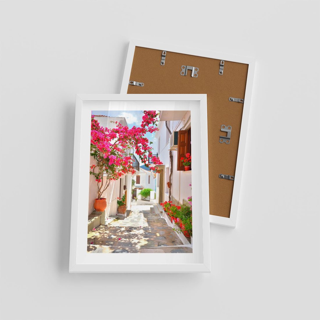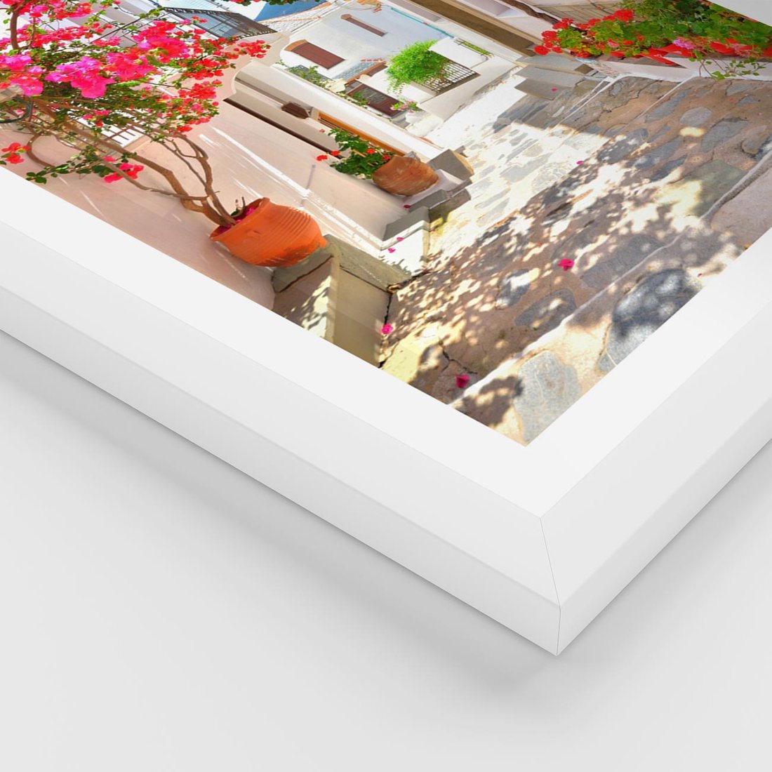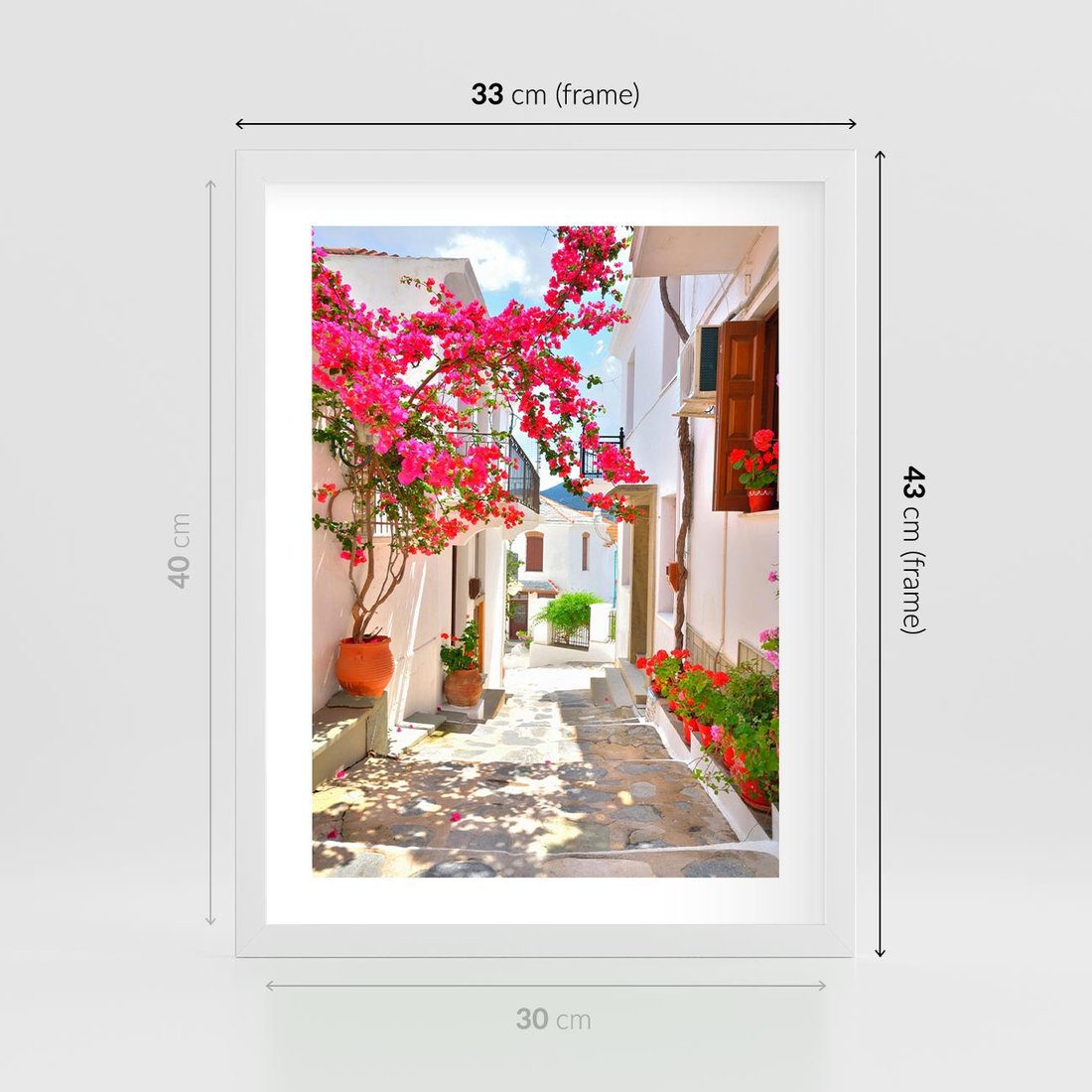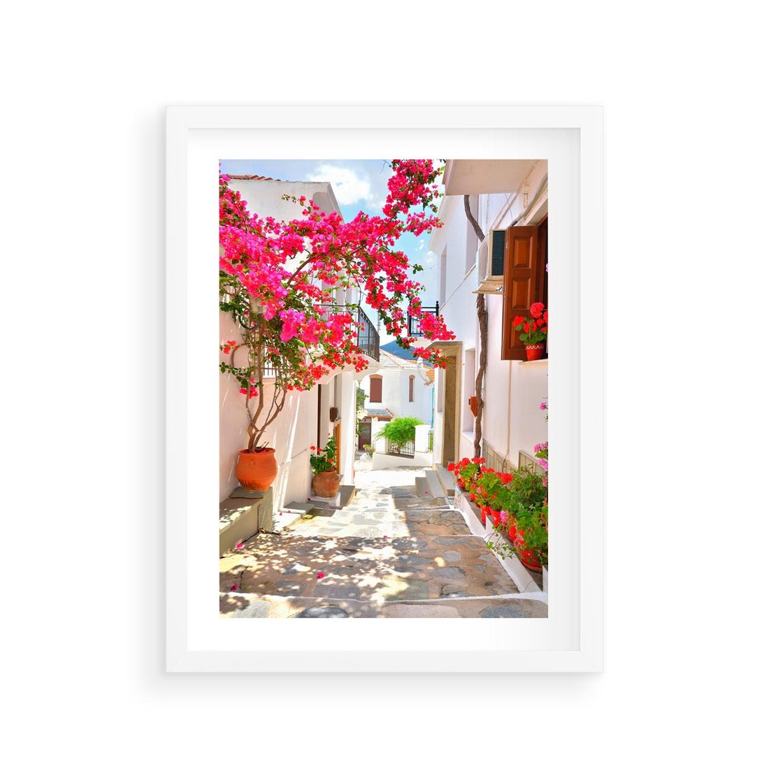 Plakat w ramie 30x40 - Kwiatowa uliczka wakacji - kwiaty, uliczka - rama biała