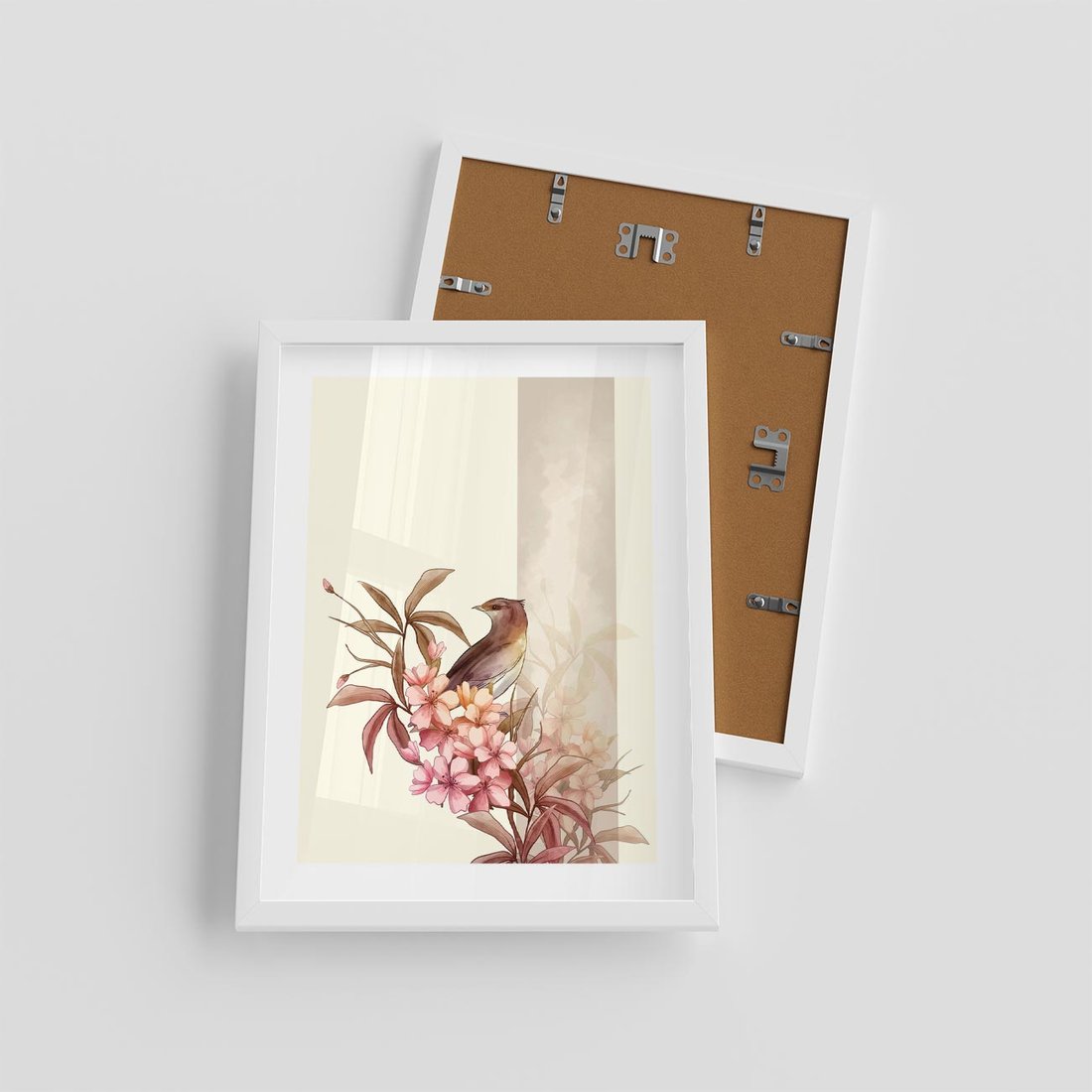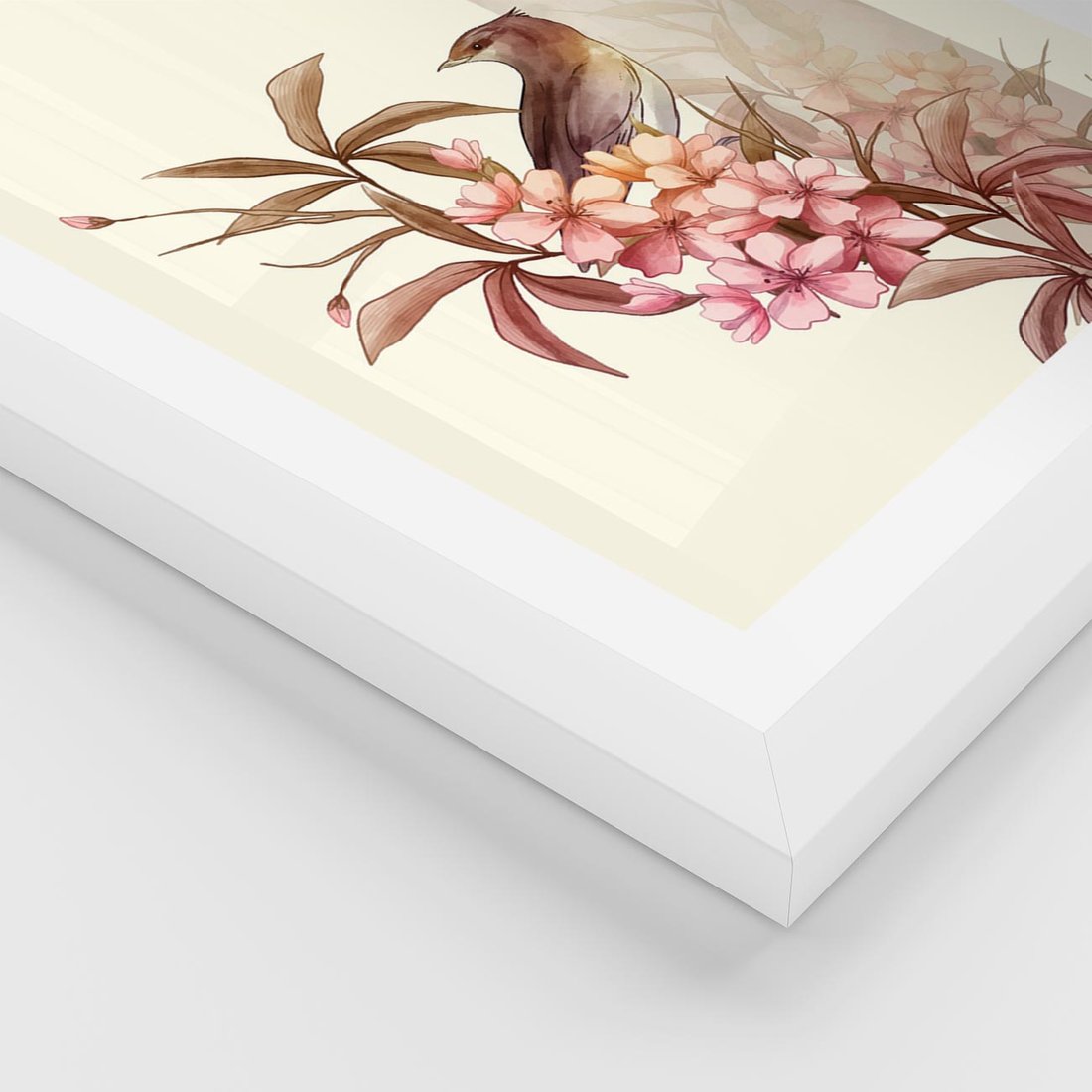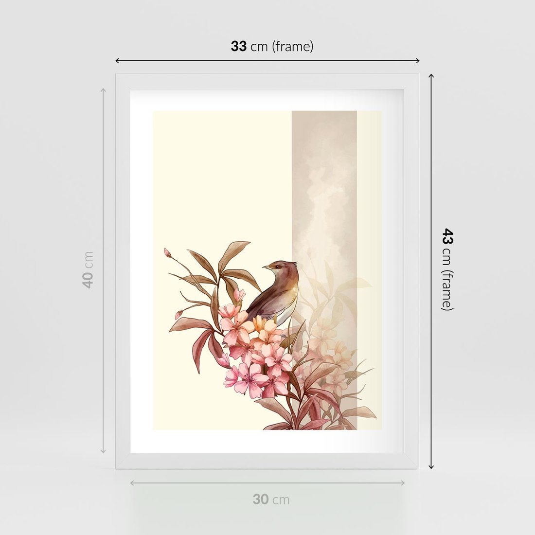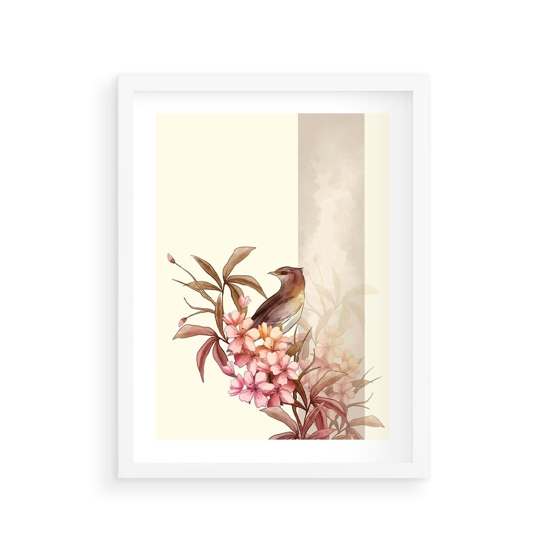 Plakat w ramie 30x40 - Kwiatowe Zanurzenie - japońska sztuka, ptak - rama biała