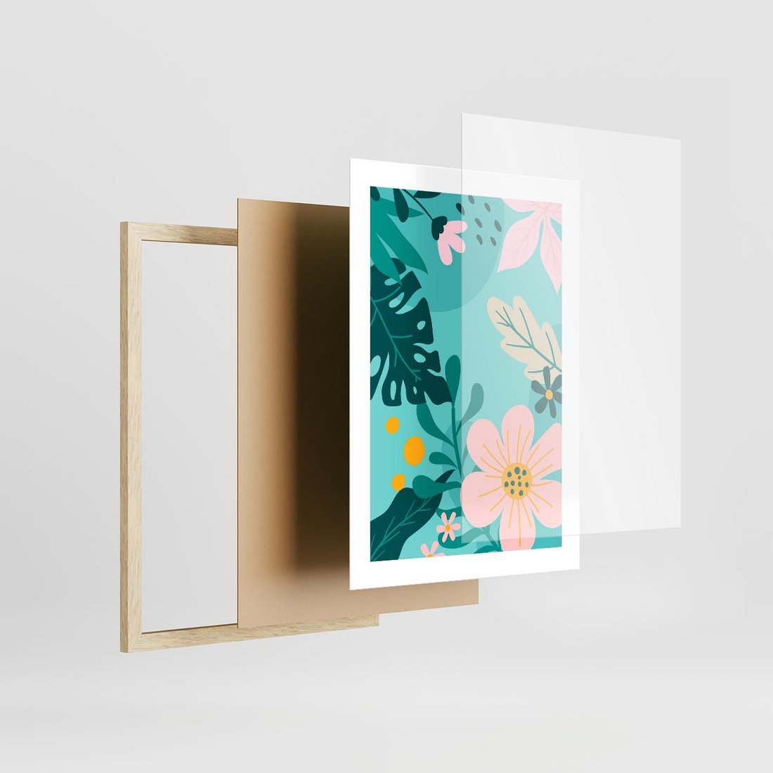 Pastelowa kompozycja wzbogacona kwiatami i tropikalnymi liśćmi w odcieniach turkusu i różu. To artystyczne połączenie natury i delikatności, tworzące harmonijną atmosferę.