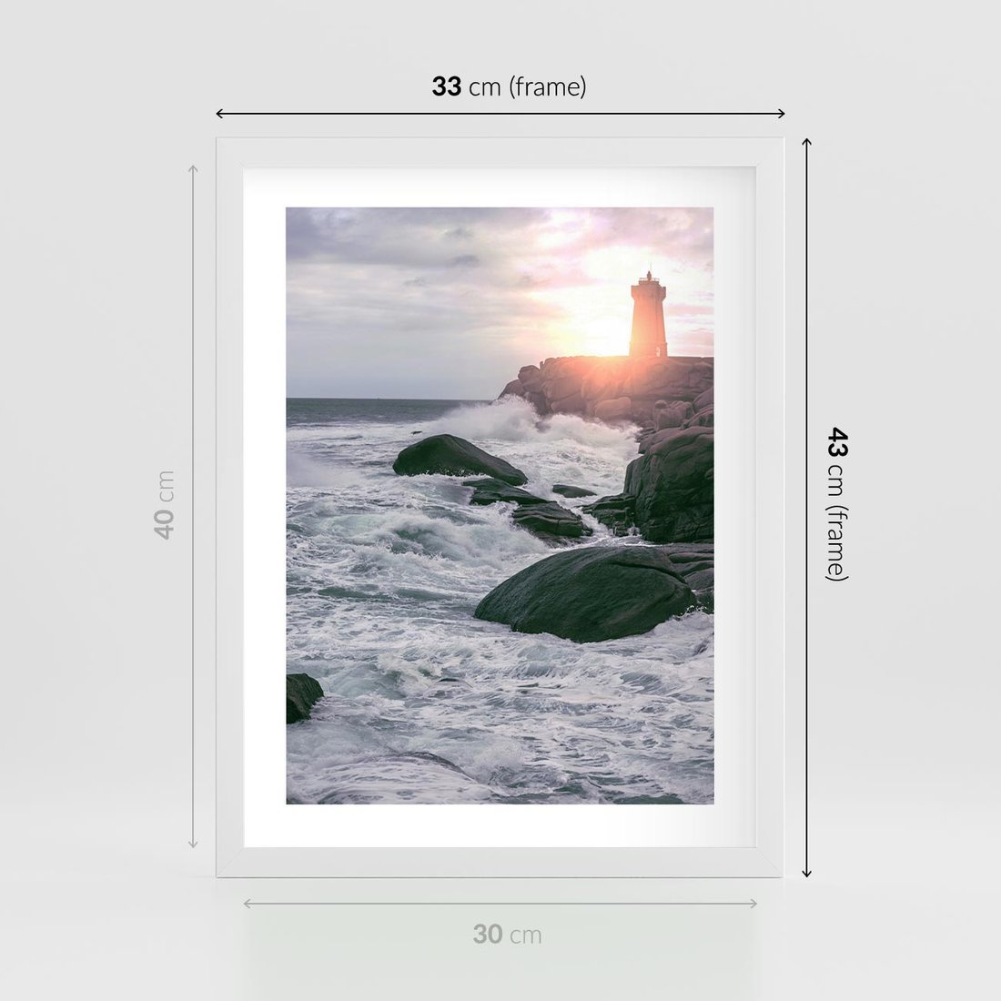 Plakat w ramie 30x40 - Latarnia, Zachód Słońca i Fale - latarnia na klifie, zachód słońca - rama biała