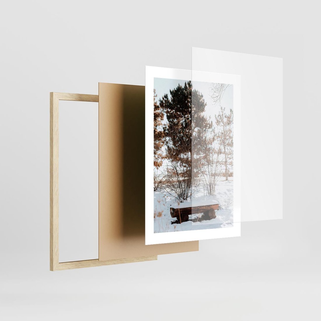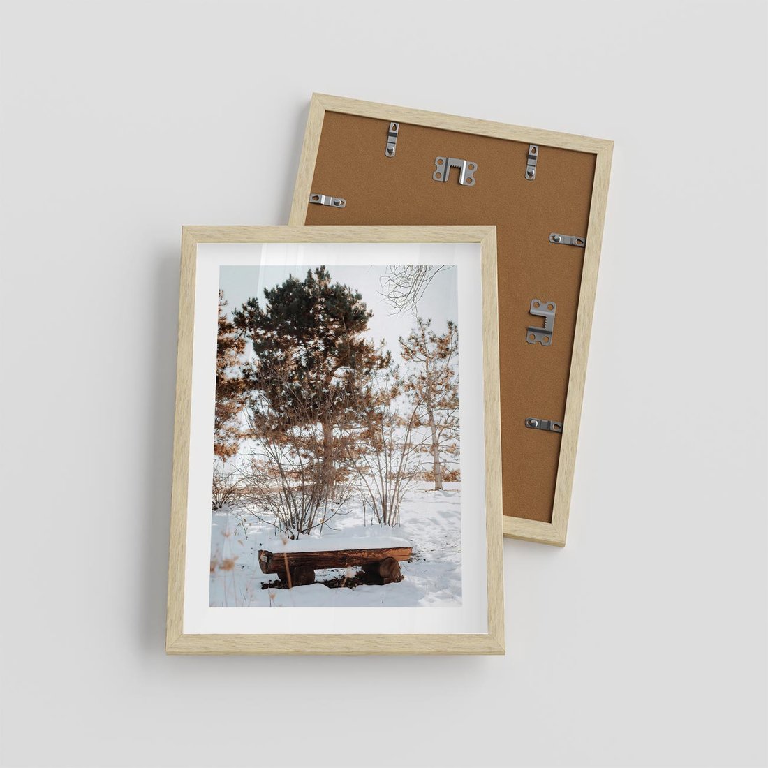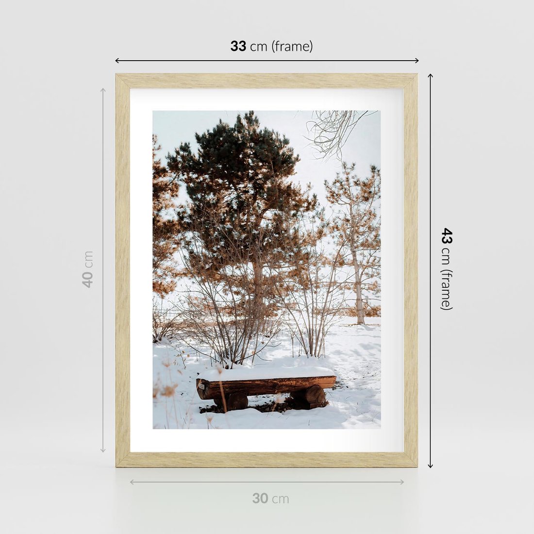 Plakat w ramie 30x40 - Ławka Pod Śniegiem - zimowy pejzaż, ławka pod śniegiem - rama drewno