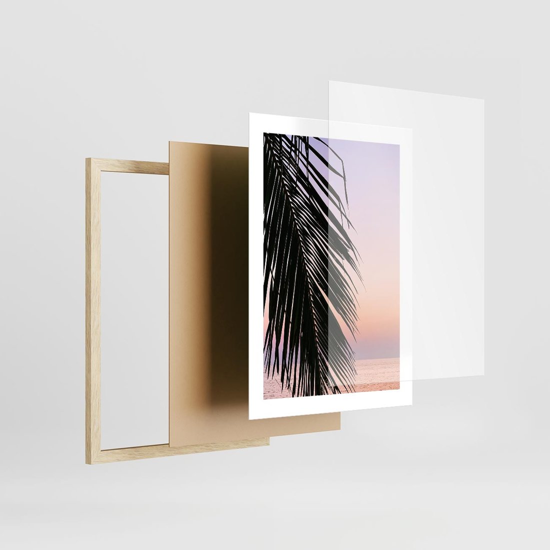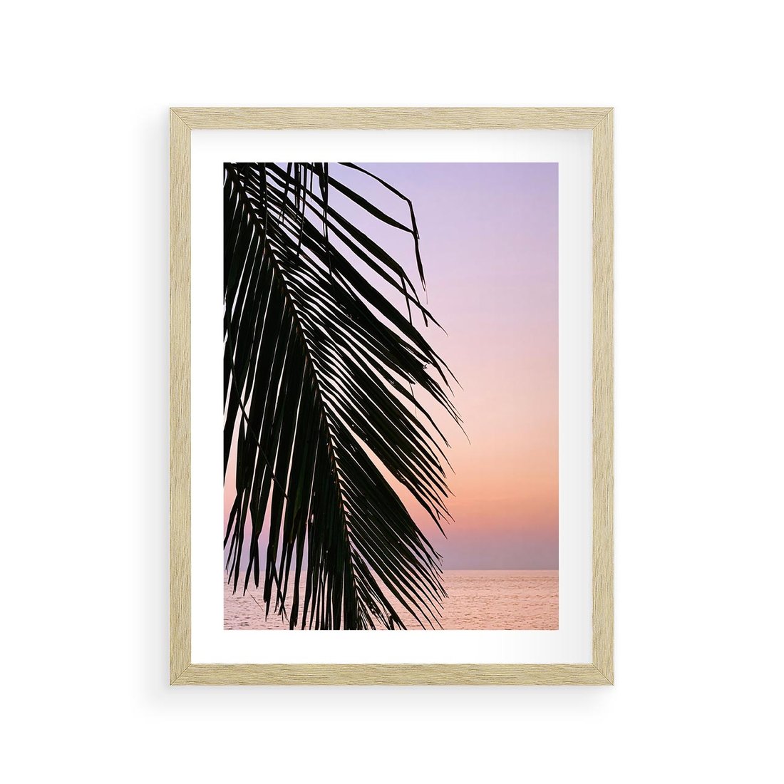 Plakat w ramie 30x40 - Liście Palmy nad Morzem - zachód słońca, liście palmy na tle nieba i morza - rama drewno
