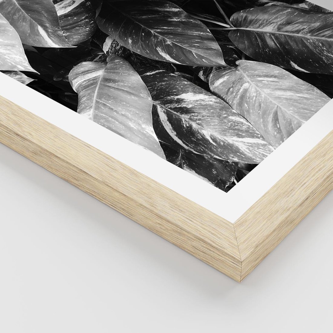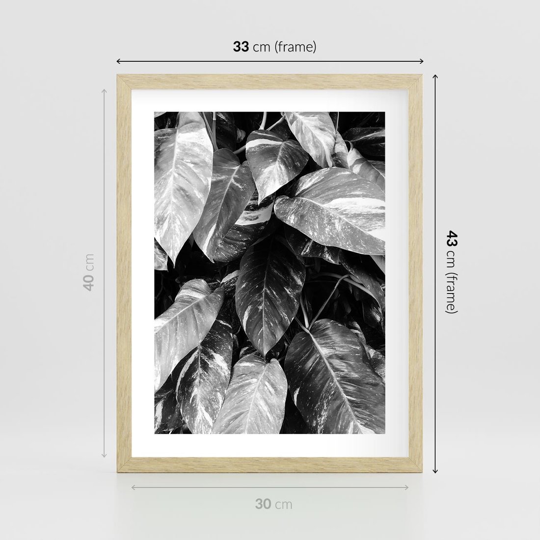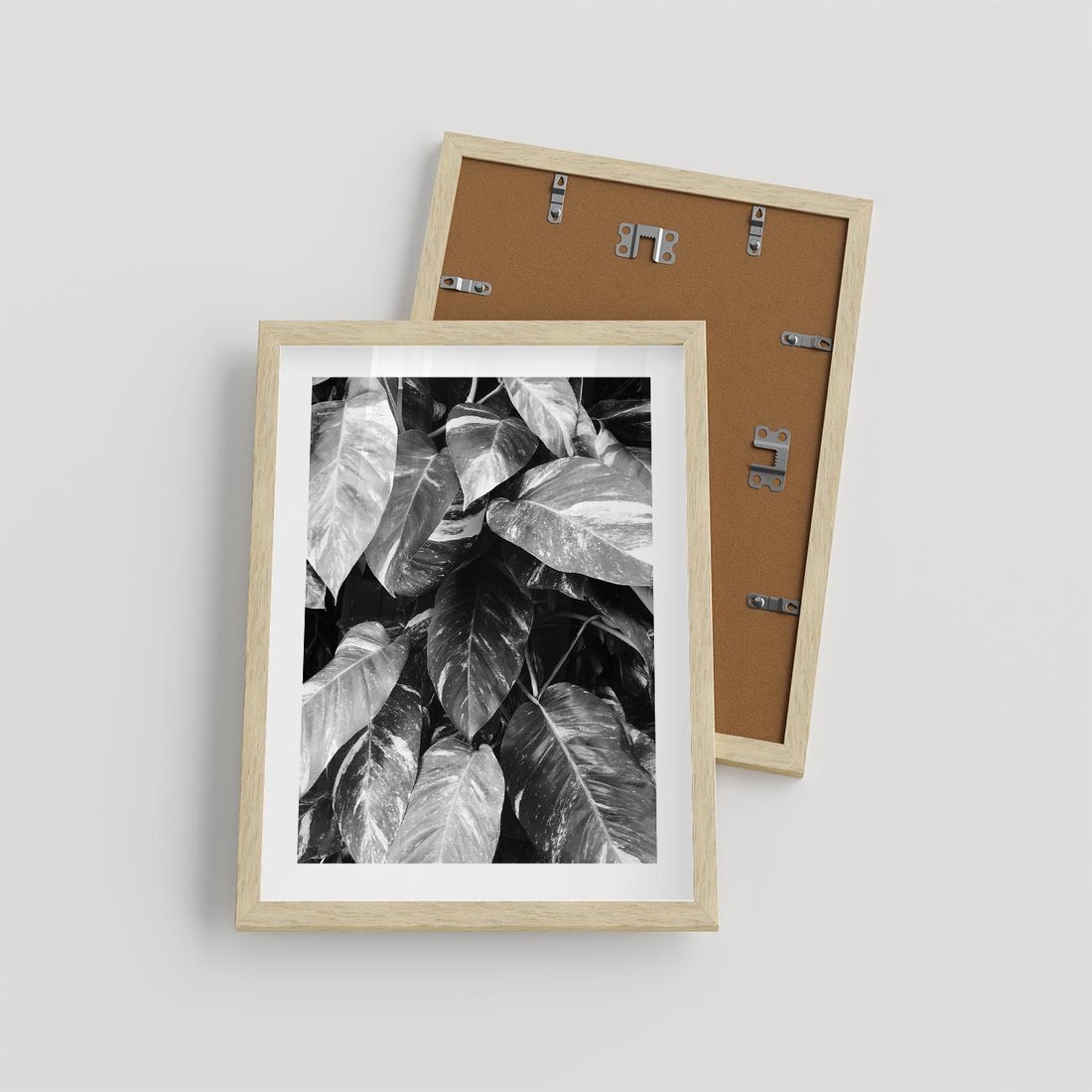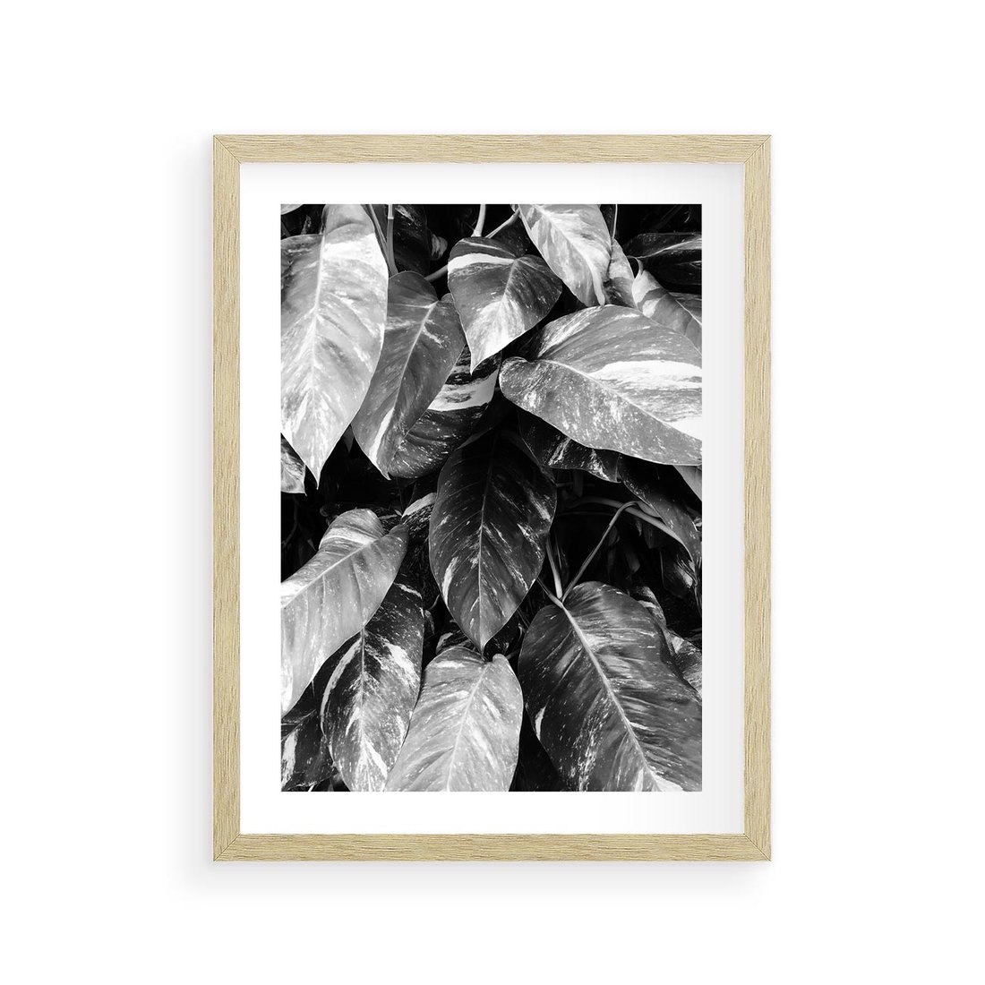 Plakat w ramie 30x40 - Liście w Czarno-Białej Fotografii - liście, roślina - rama drewno