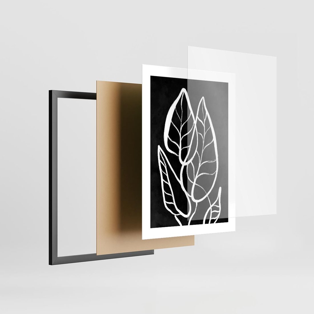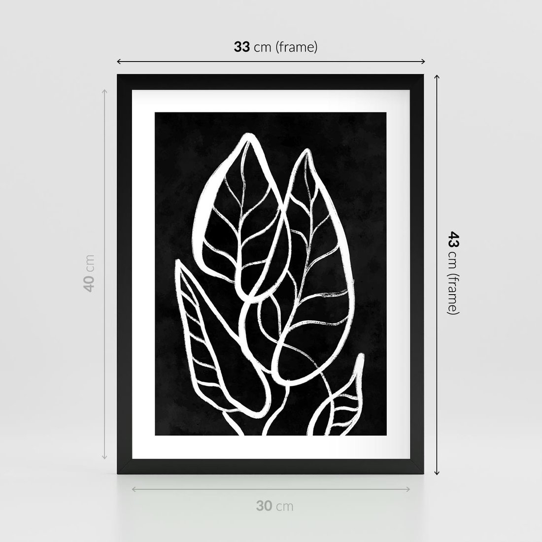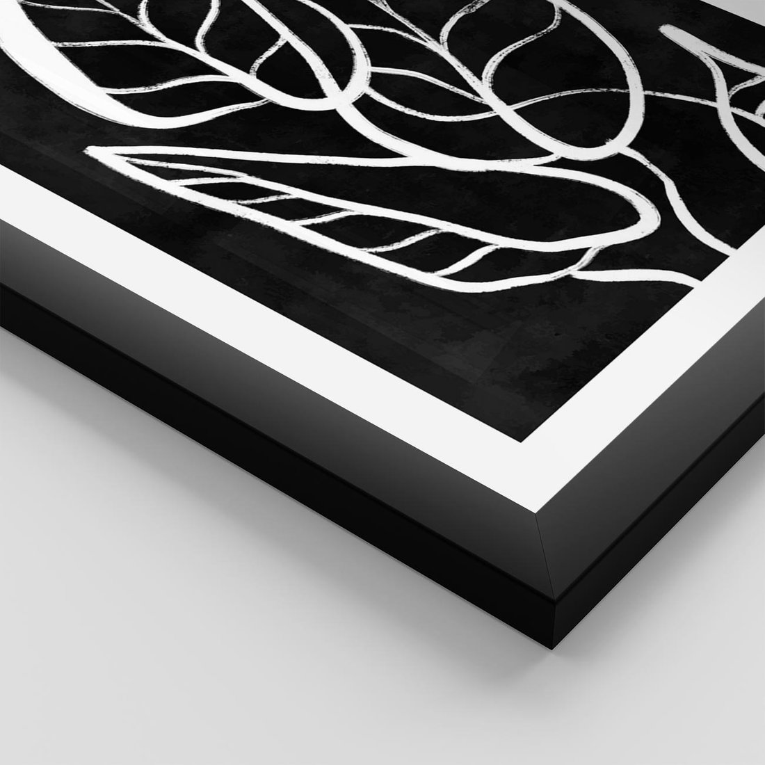 Biały szkic liści na głębokim czarnym tle tworzy mroczny minimalizm, który przyciąga uwagę i nadaje elegancji każdemu wnętrzu.