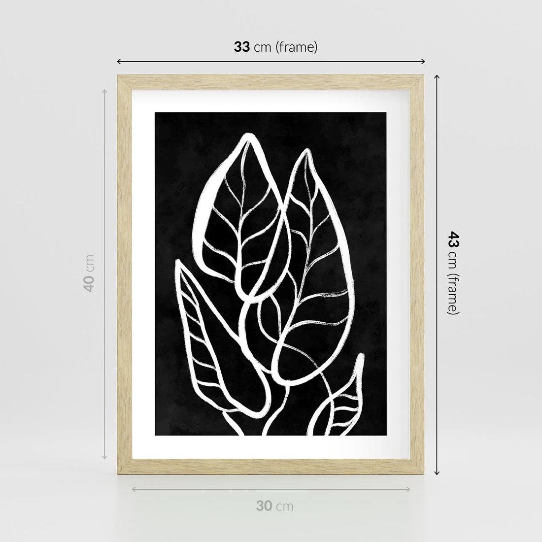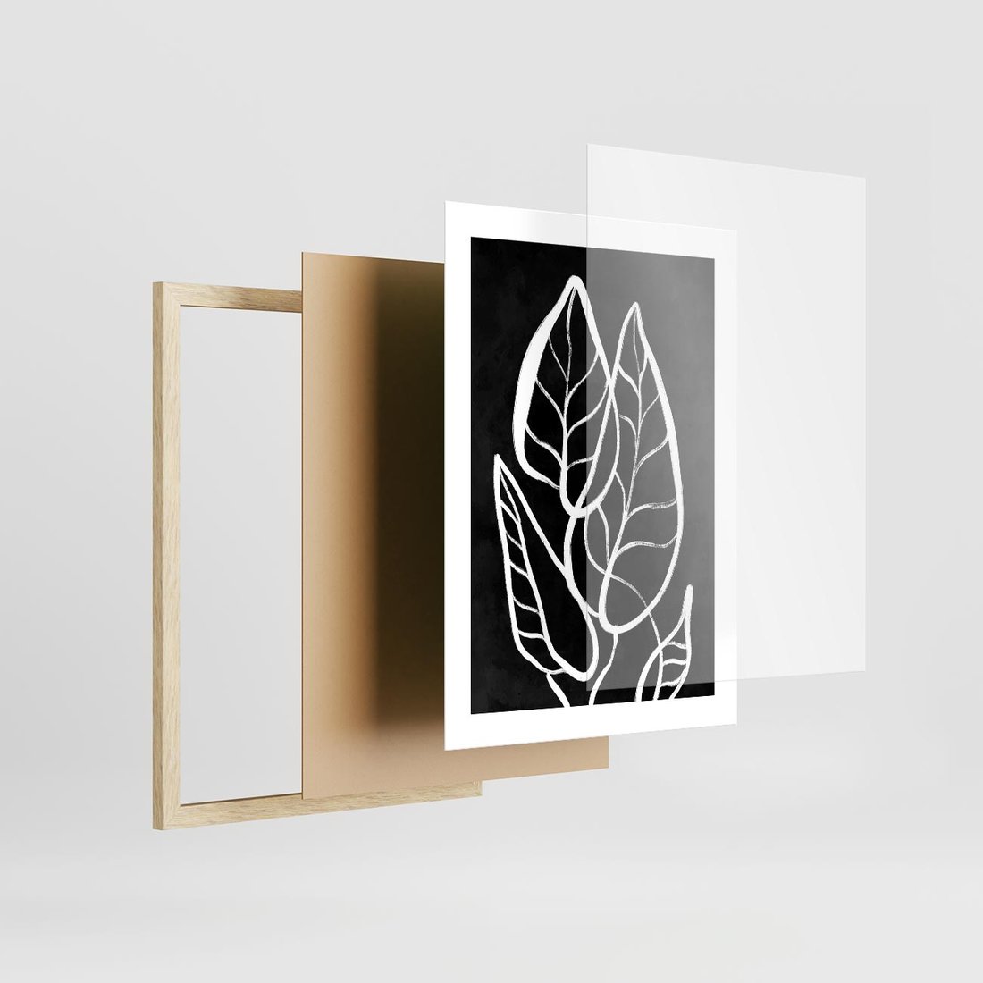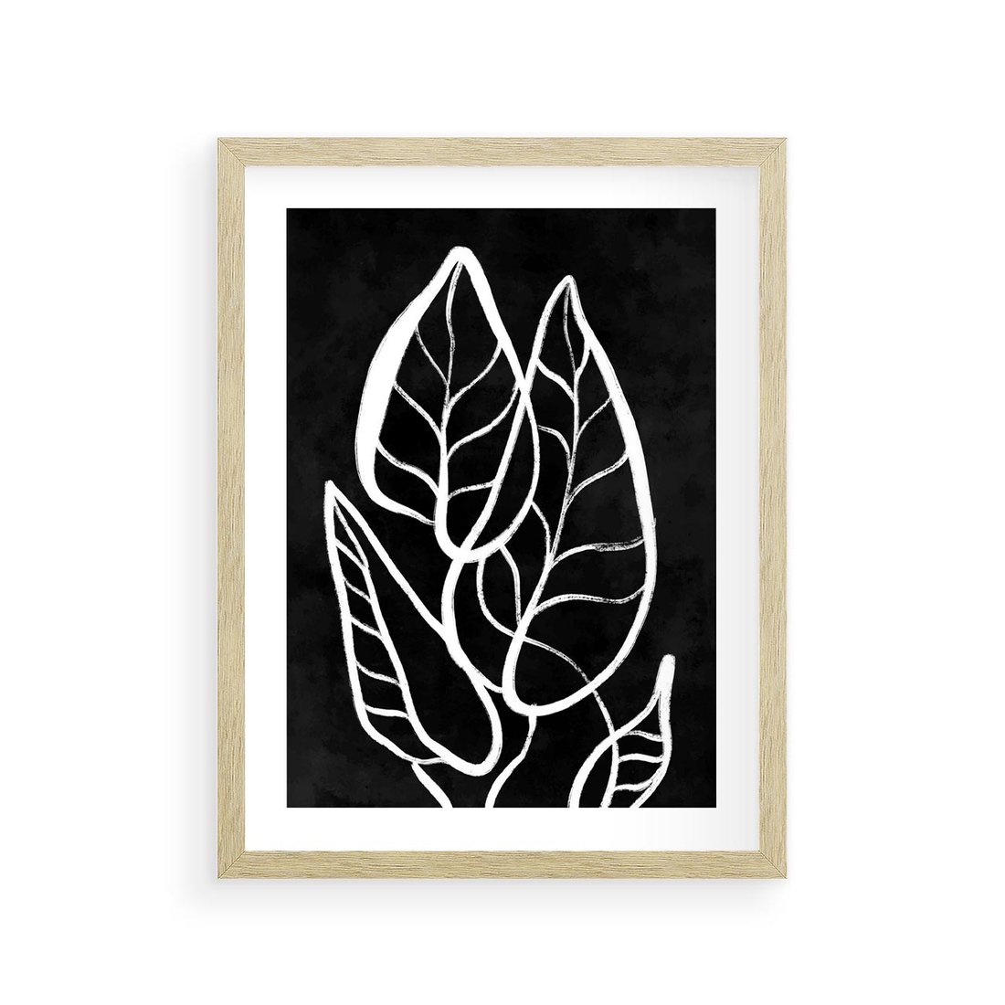 Biały szkic liści na głębokim czarnym tle tworzy mroczny minimalizm, który przyciąga uwagę i nadaje elegancji każdemu wnętrzu.