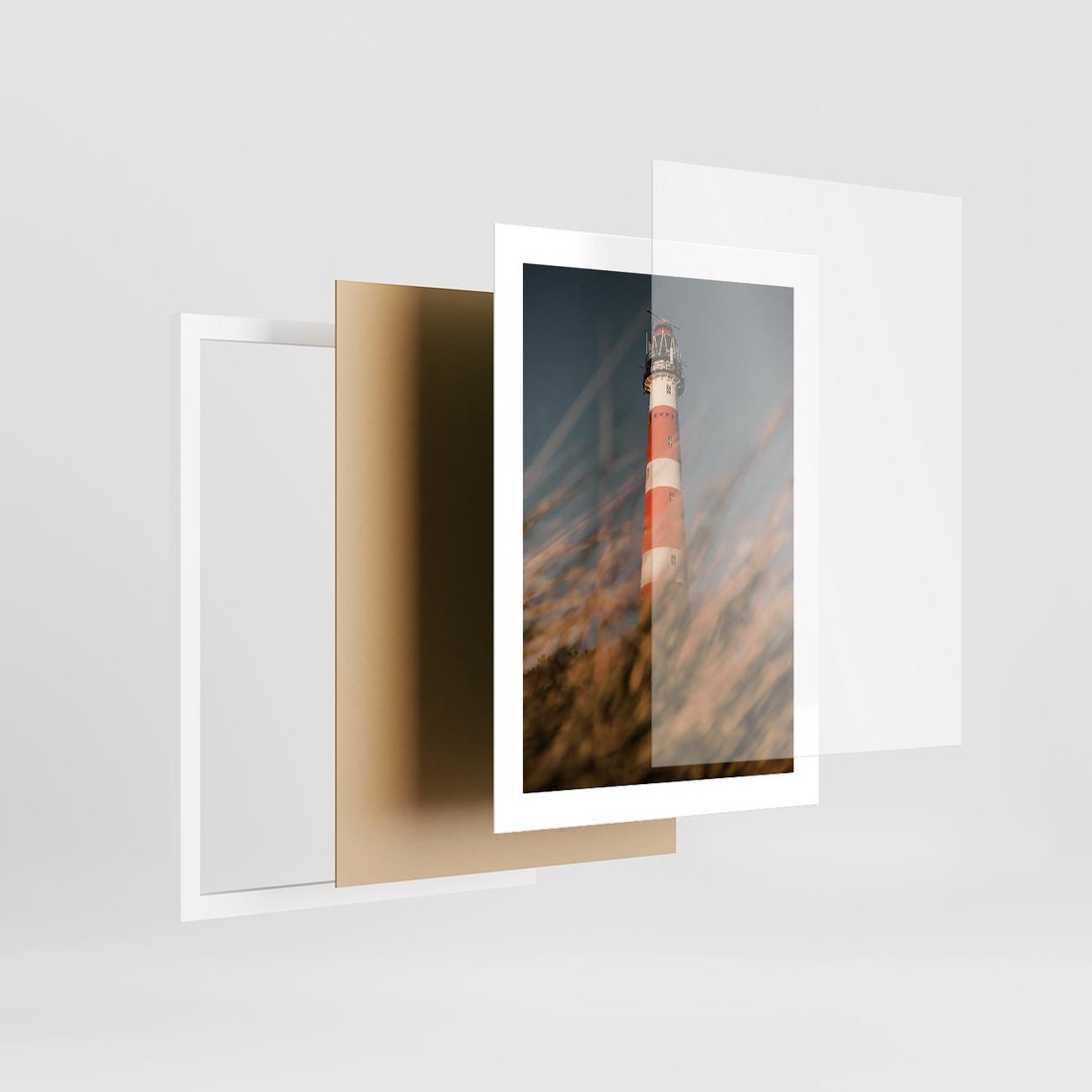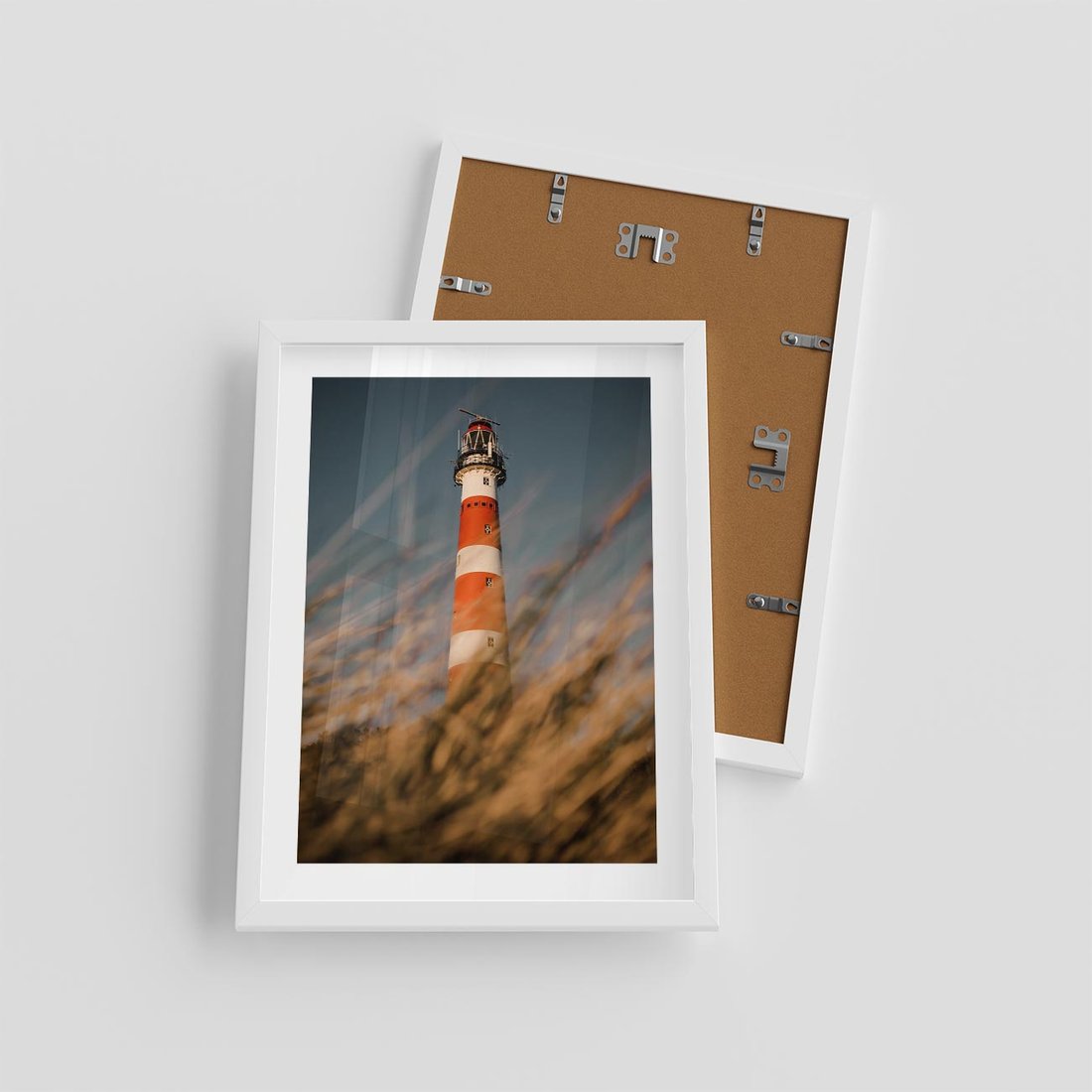 Plakat w ramie 30x40 - Magia nadmorskiego światła - latarnia morska, ujęcie z za trawy - rama biała