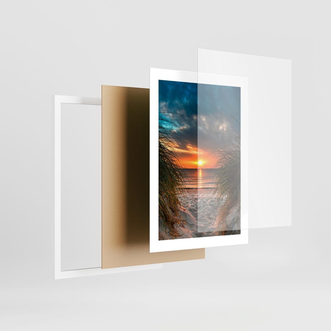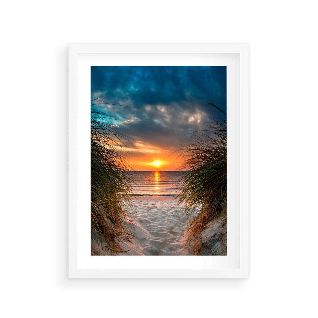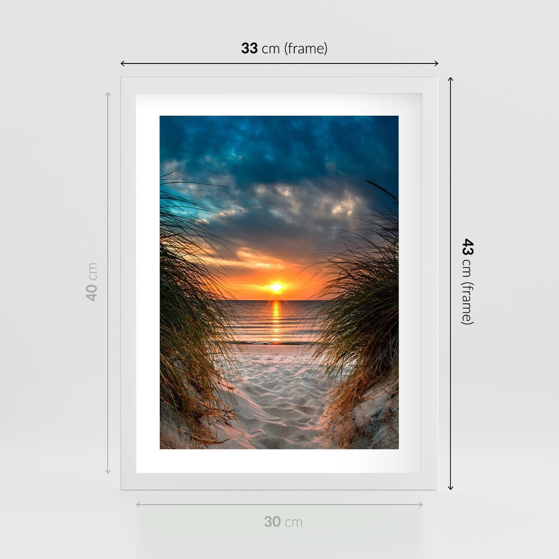 Plakat w ramie 30x40 - Magia zachodu słońca na plaży - zachód, słońca - rama biała