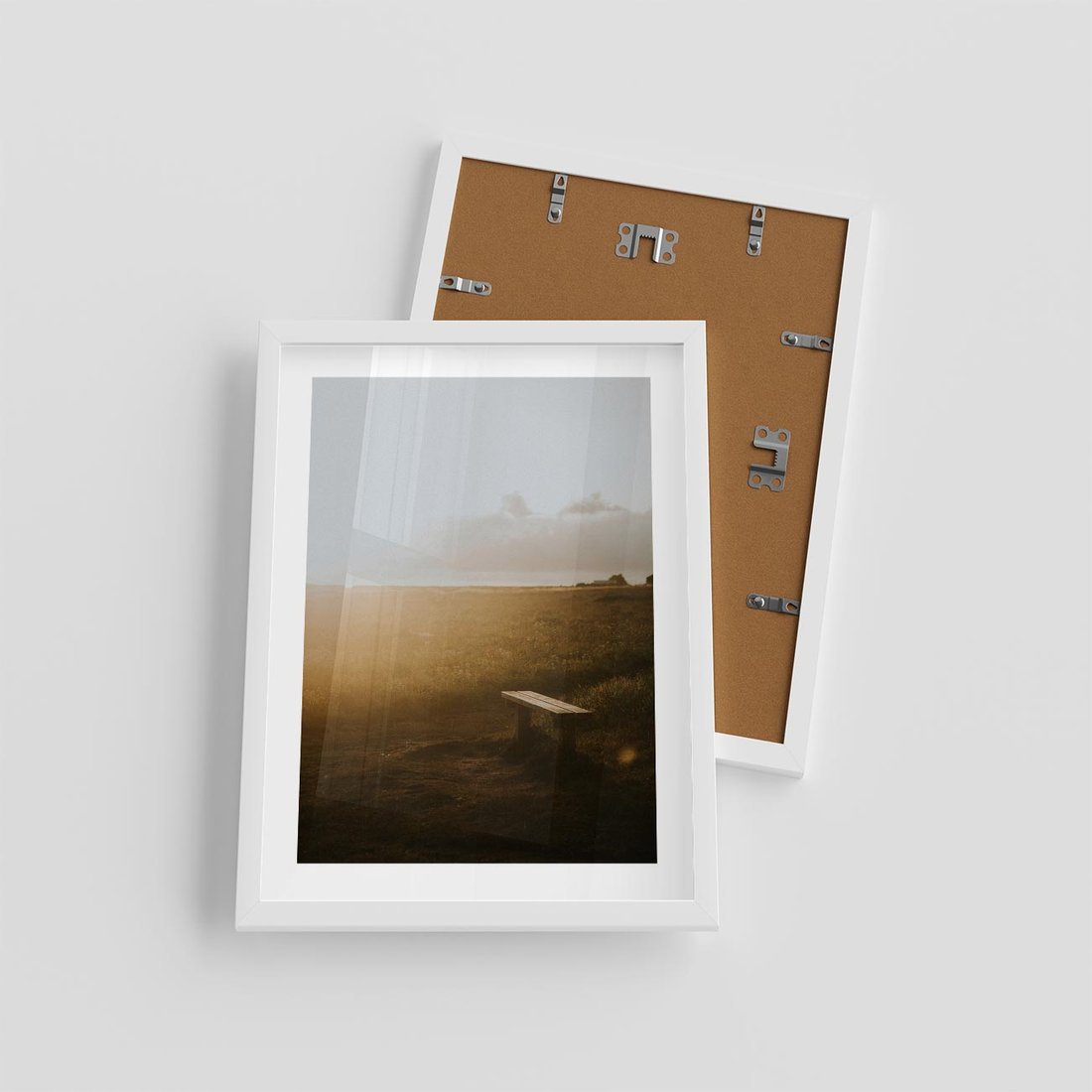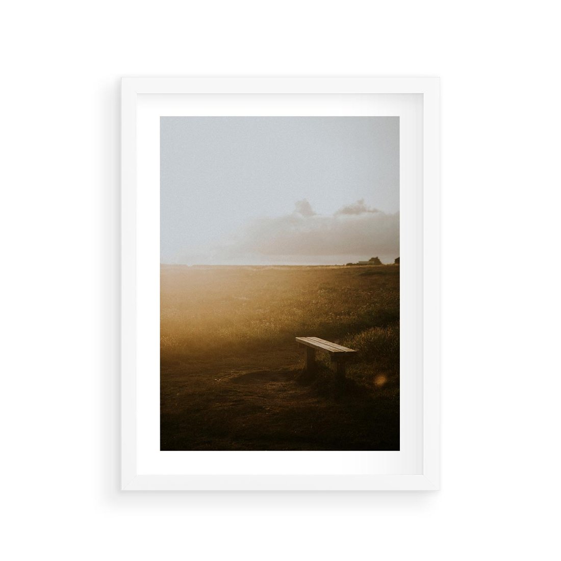 Plakat w ramie 30x40 - Mglisty zachód słońca na ławeczce - mgła, zachód - rama biała