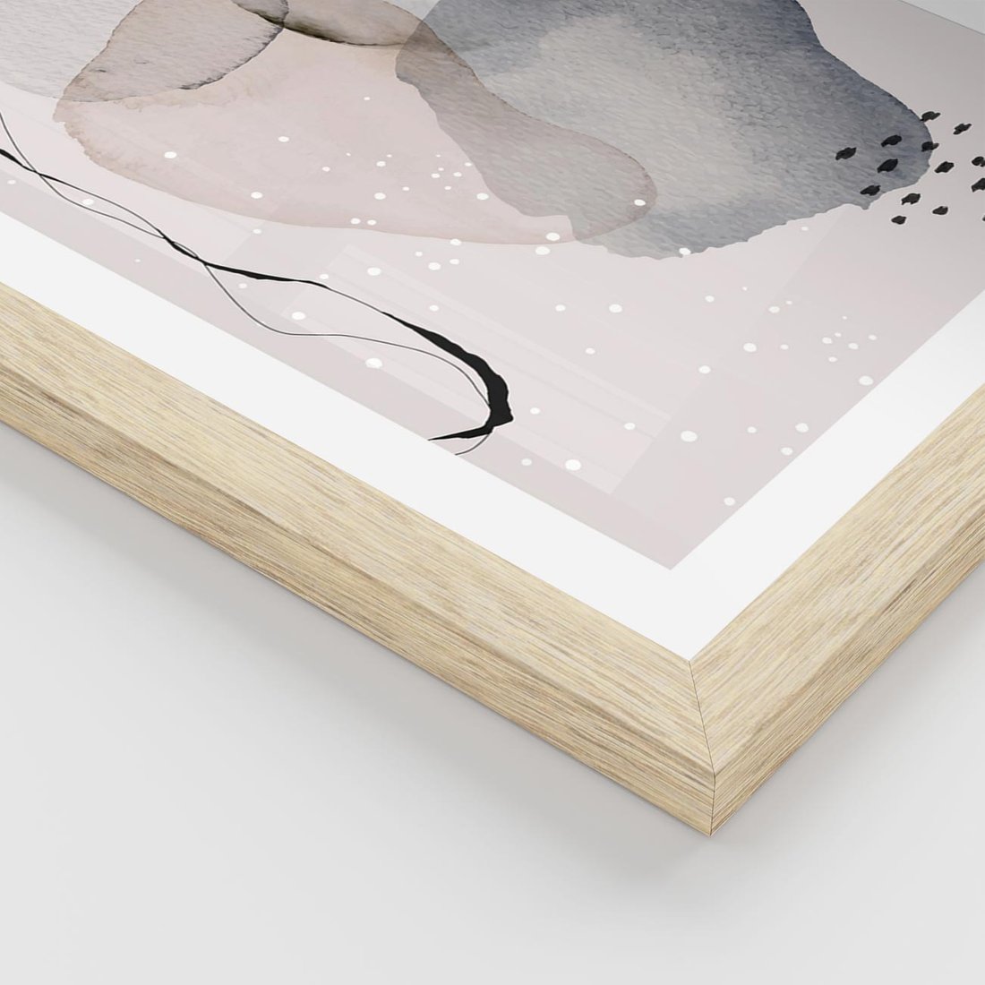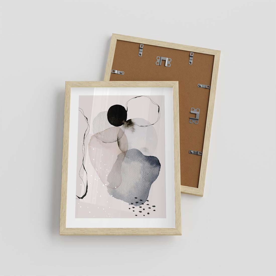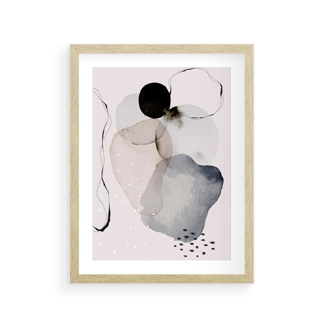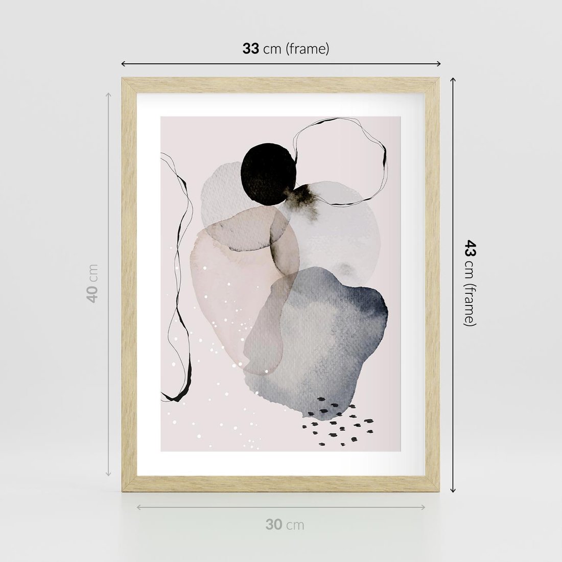 Plakat w ramie 30x40 - Migocące Barwy - abstrakcyjne plamy akwarelowe, czarny szkic - rama drewno