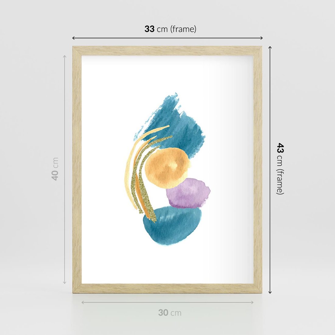 Plakat w ramie 30x40 - Migocące Barwy Akwarel - akwarelowe plamy w odcieniach błękitu, złote kreski - rama drewno