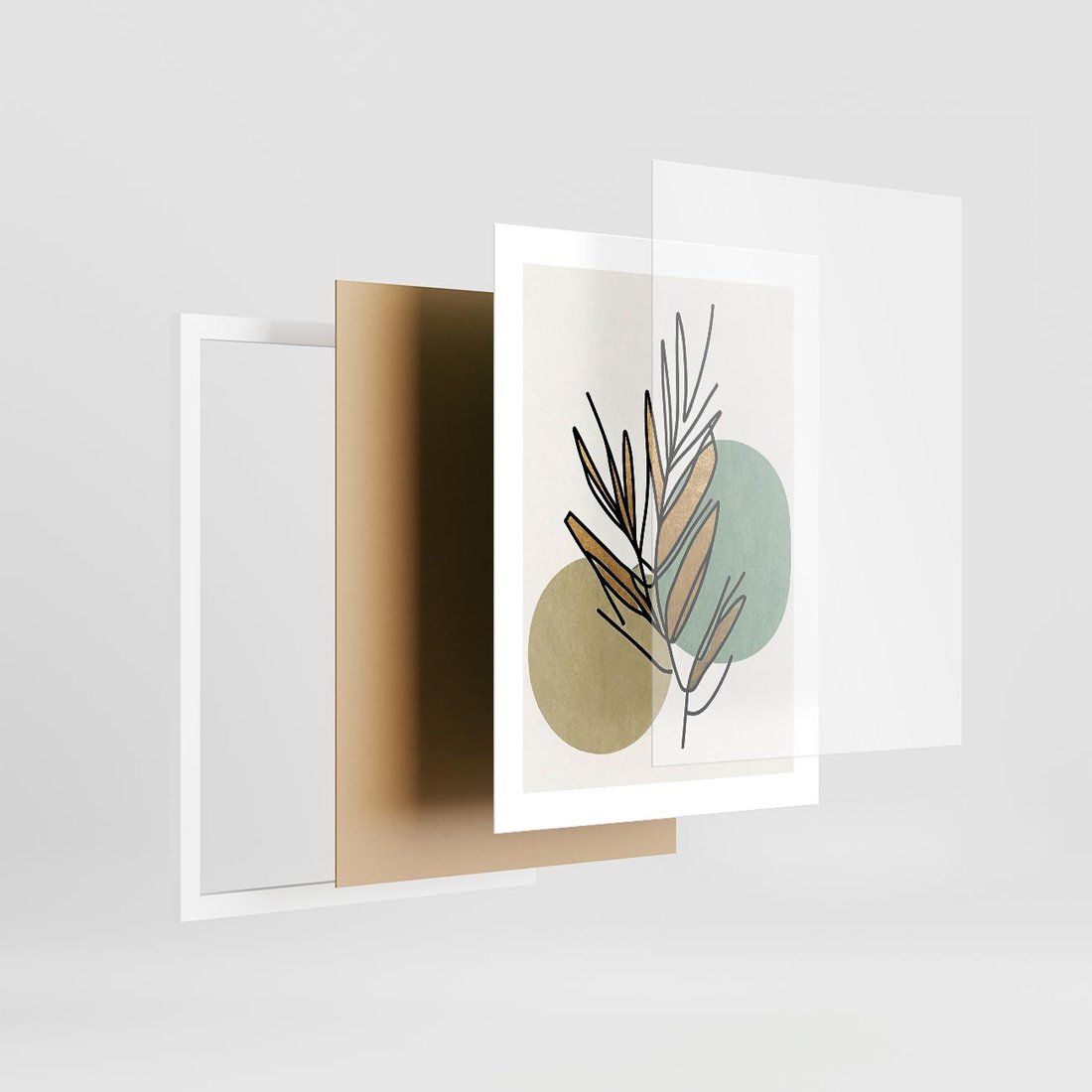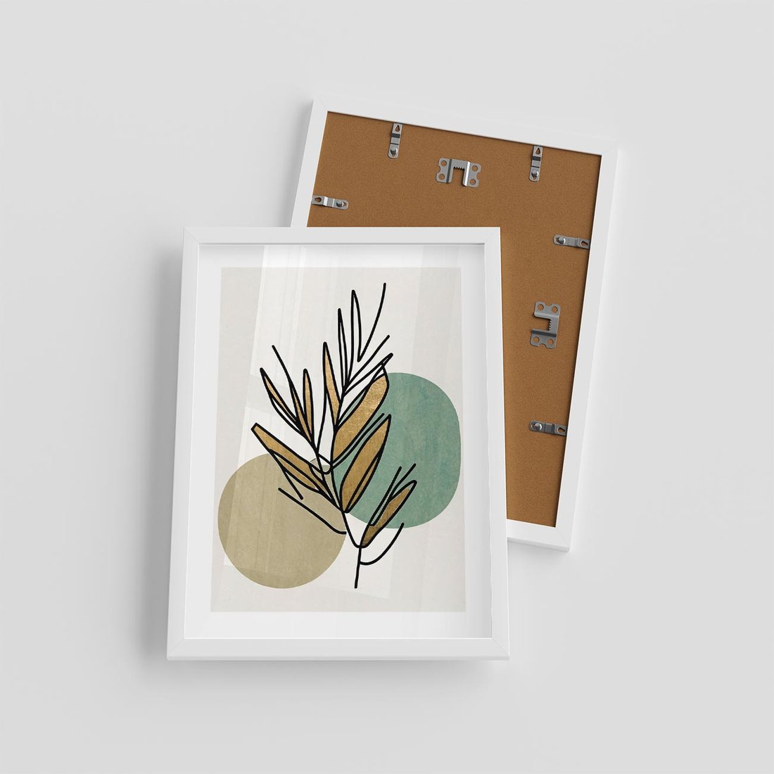 Plakat w ramie 30x40 - Migocące Ścieżki Wizji - abstrakcyjny obraz boho, liście - rama biała