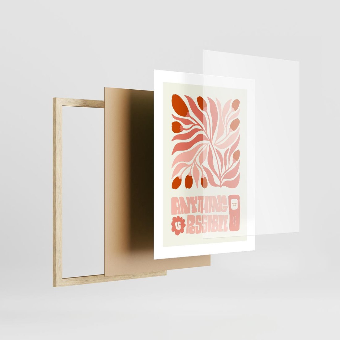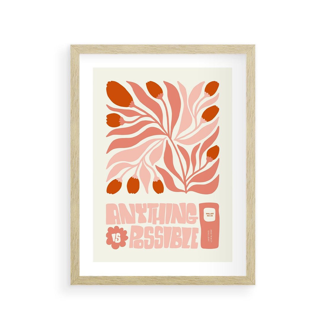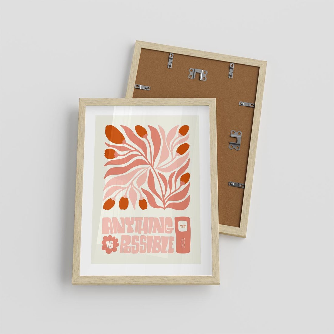 Ta nowoczesna sztuka przedstawia kompozycję w ciepłym łososiowym kolorze, z abstrakcyjnymi kwiatami i wyrazistą typografią. Tworzy ona piękną równowagę między naturą a sztuką, emanując spokojem i elegancją.
