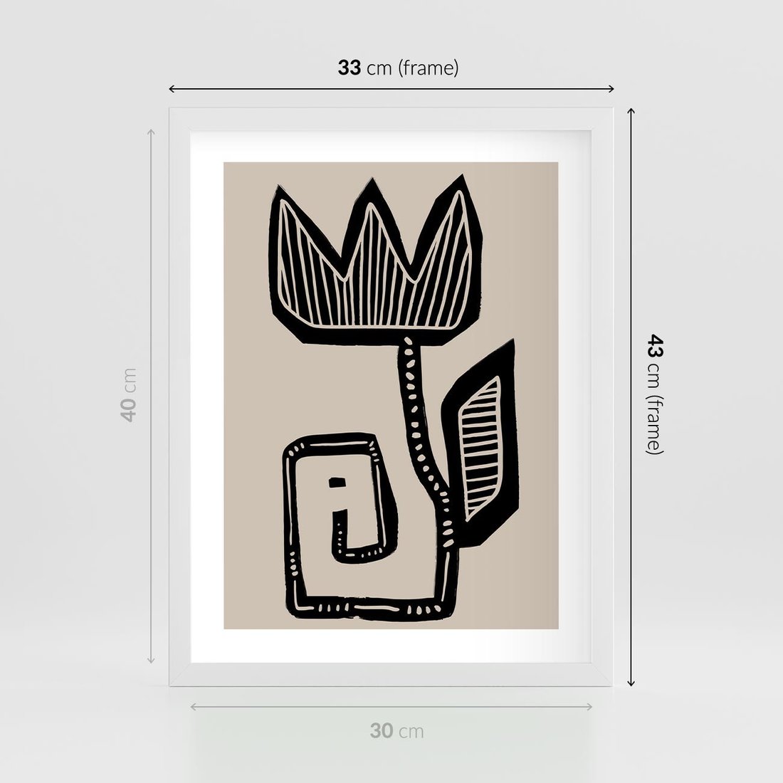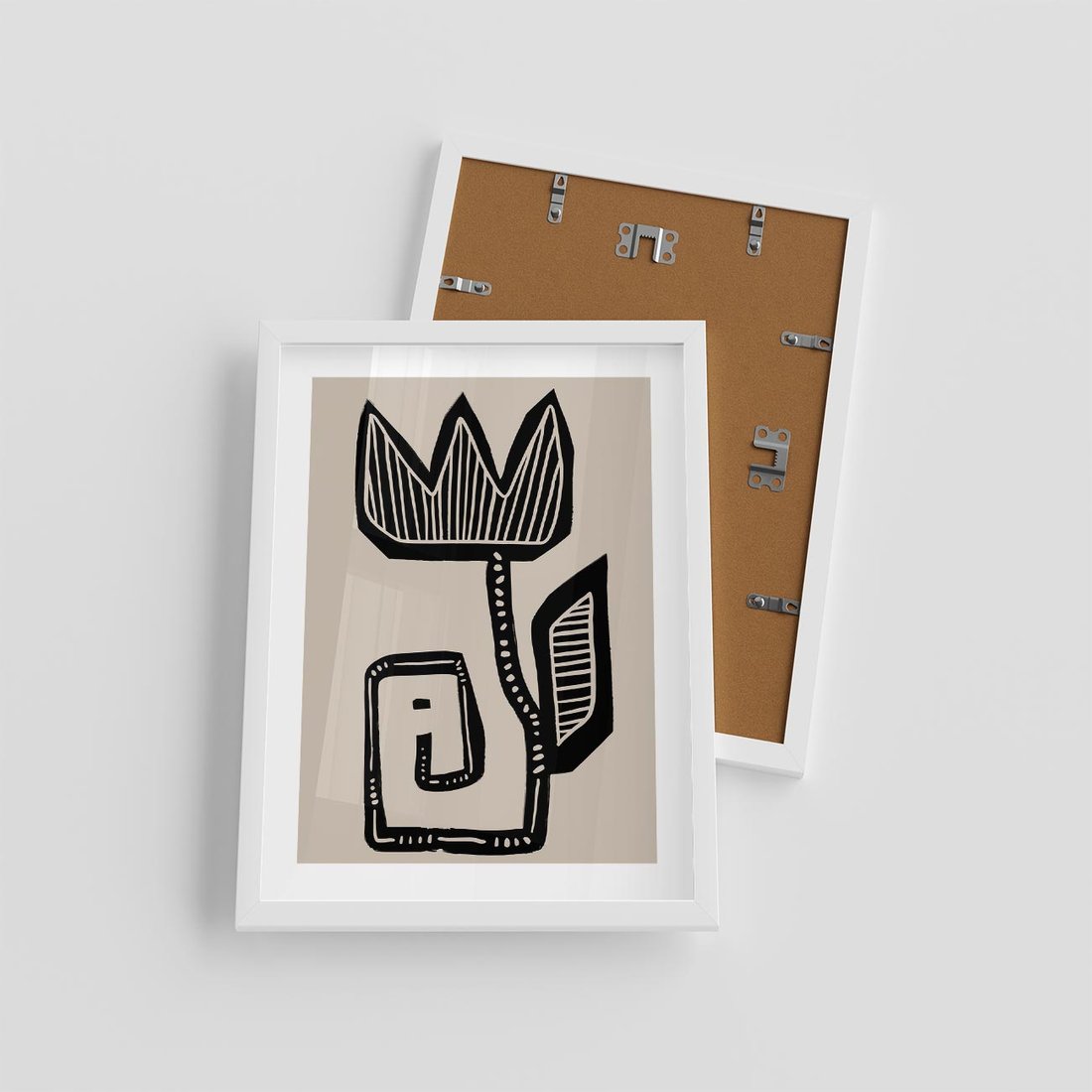Ten boho nowoczesny plakat to minimalistyczna grafika czarnego kwiatu na spokojnym beżowym tle. To wyjątkowe połączenie stylów wprowadza do Twojej przestrzeni harmonię i wyrafinowanie, tworząc równocześnie interesujący akcent artystyczny.