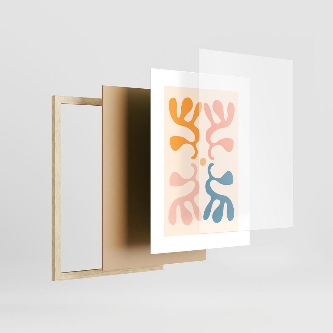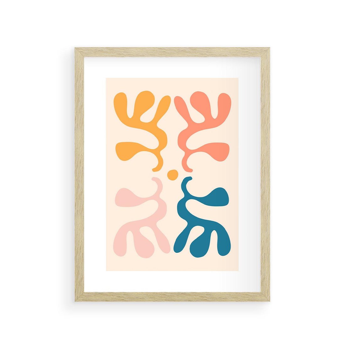 Ten nowoczesny plakat przedstawia abstrakcyjne, dziwne formy w delikatnych pastelowych kolorach. Kompozycja tworzy interesujący kontrast między nowoczesnym stylem a subtelnością kolorów, dodając unikalnego charakteru do przestrzeni.