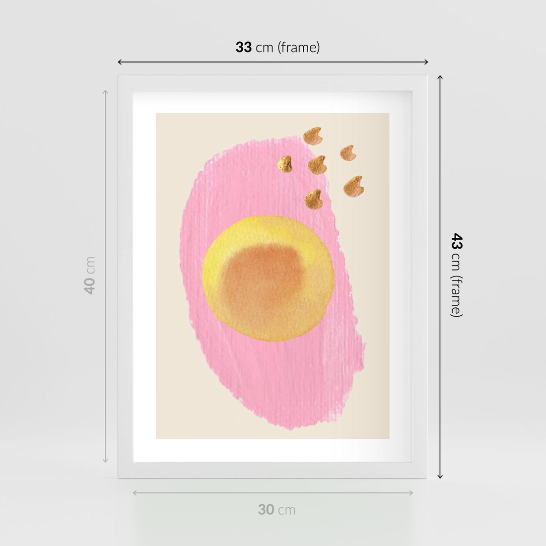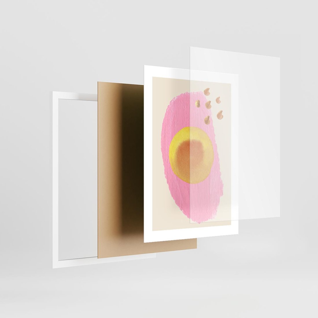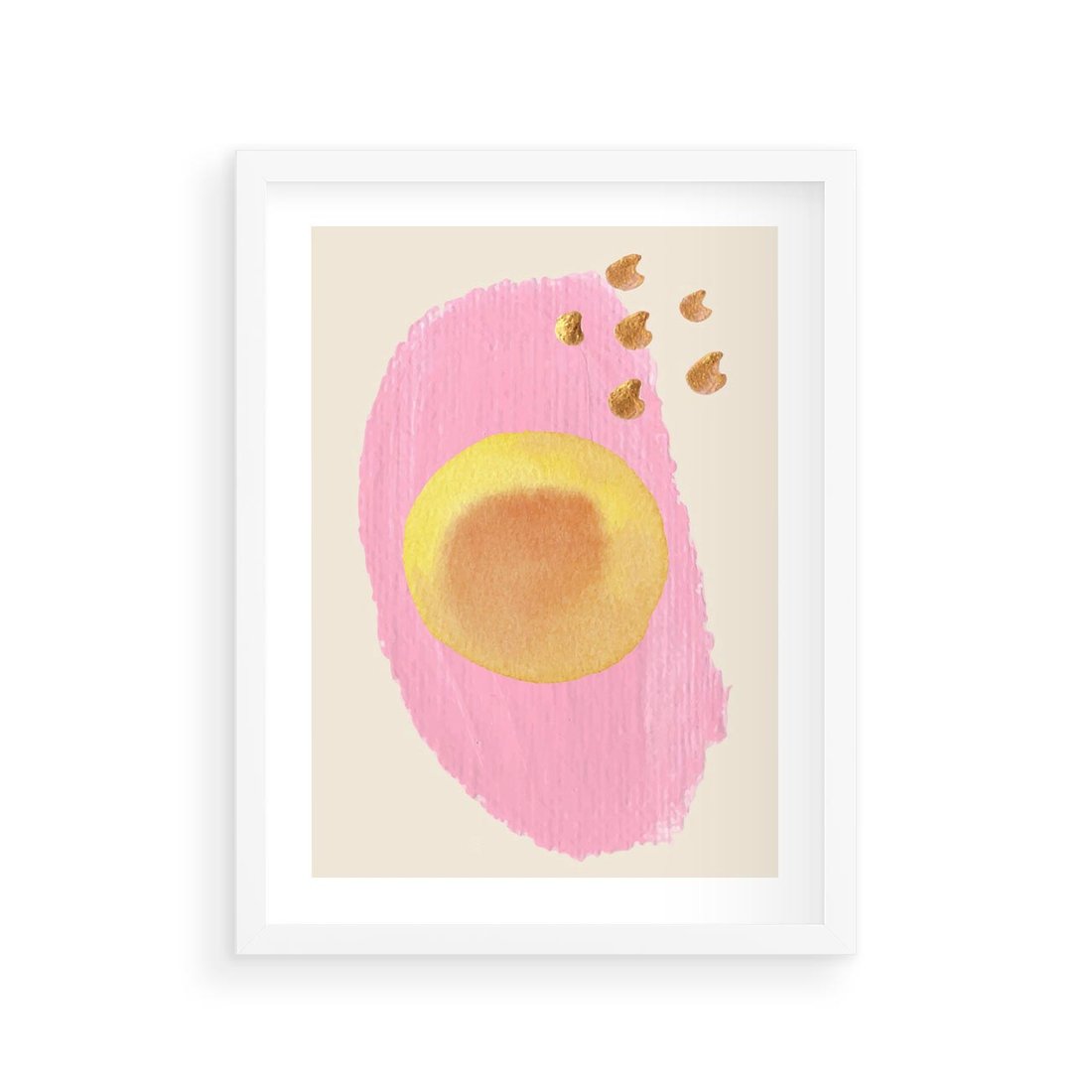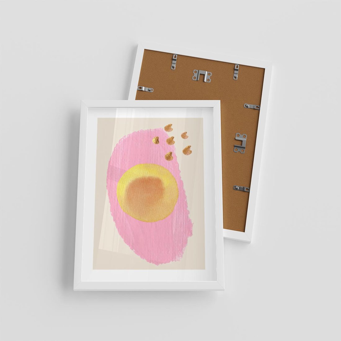 Nasz minimalistyczny plakat to abstrakcyjna różowa plama w akwarelowej technice, zdobiona subtelnie złotymi plamami. To wyjątkowe dzieło sztuki wprowadzi delikatność i elegancję do Twojej przestrzeni, zachwycając wyrafinowaną prostotą i subtelnością.