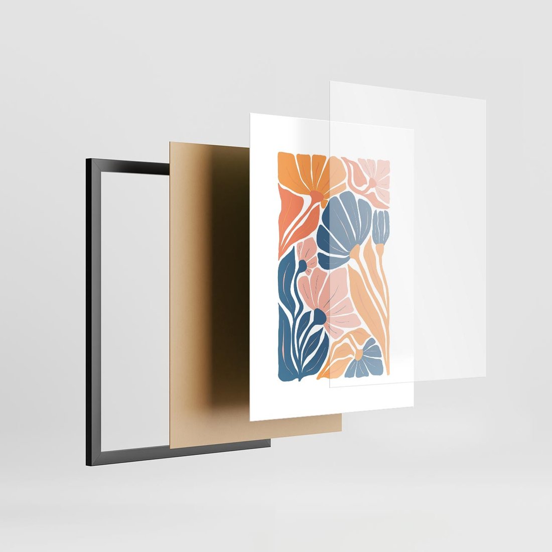 Ten minimalistyczny plakat ukazuje kwiaty i rośliny w delikatnych pastelowych odcieniach, tworząc harmonijną kompozycję. Sztuka ta emanuje spokojem i równowagą natury, dodając subtelnej estetyki do przestrzeni.
