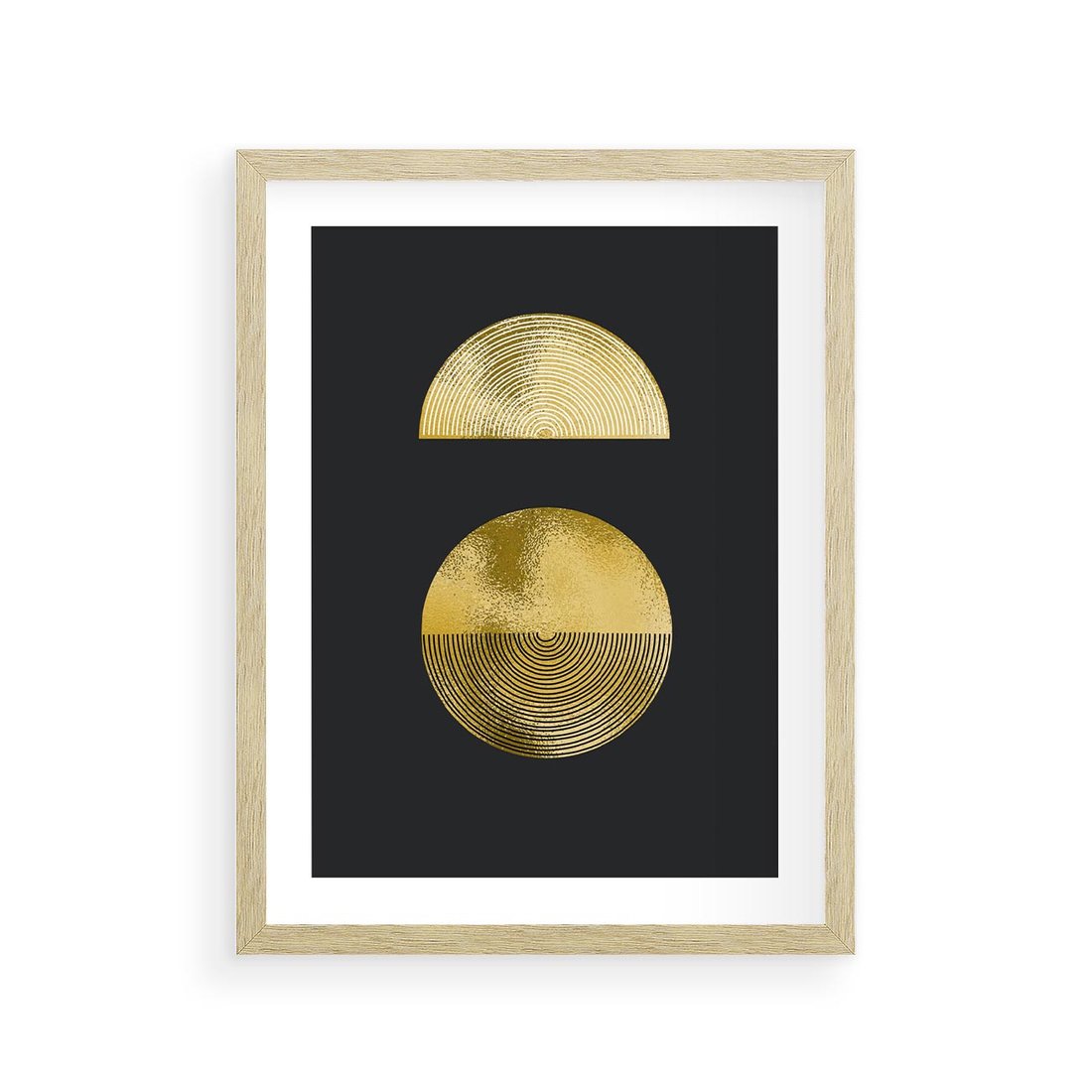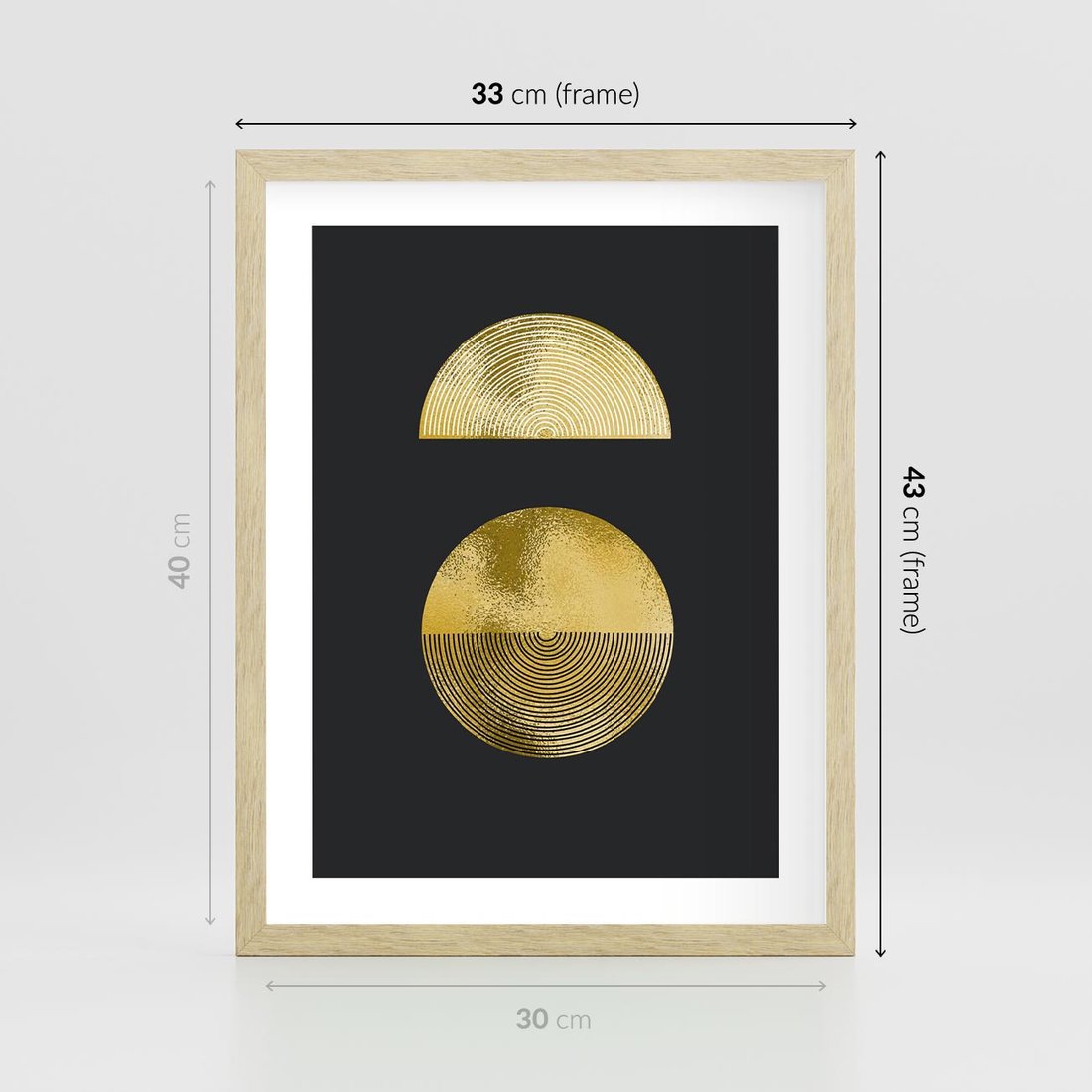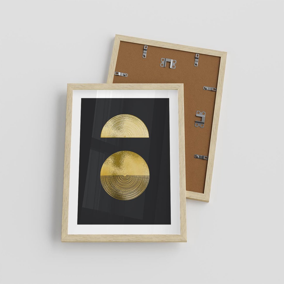 Plakat w ramie 30x40 - Migotliwe Przeniknięcia - złote koła, czarne tło - rama drewno