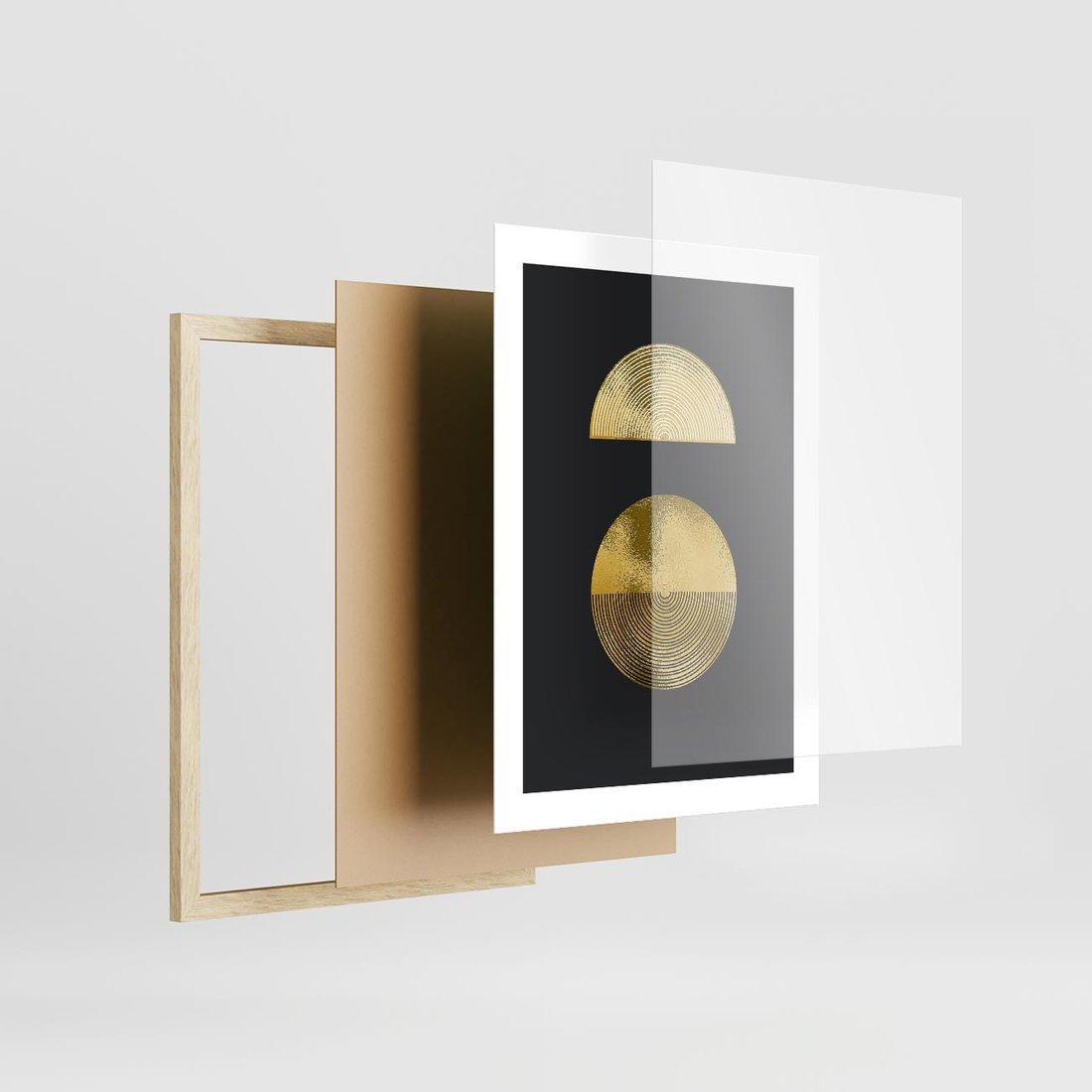 To minimalistyczny plakat przedstawia złote koła na czarnym tle w formie szkicu. To wyjątkowe połączenie kolorów i stylu wprowadza do Twojej przestrzeni elegancję i wyrafinowanie, tworząc równocześnie interesujący akcent artystyczny.